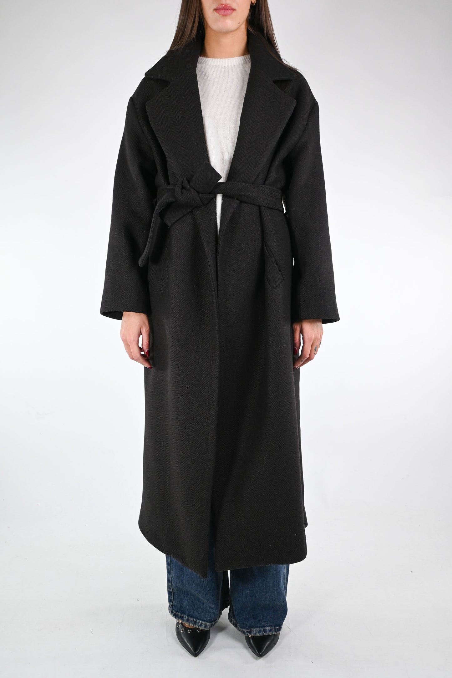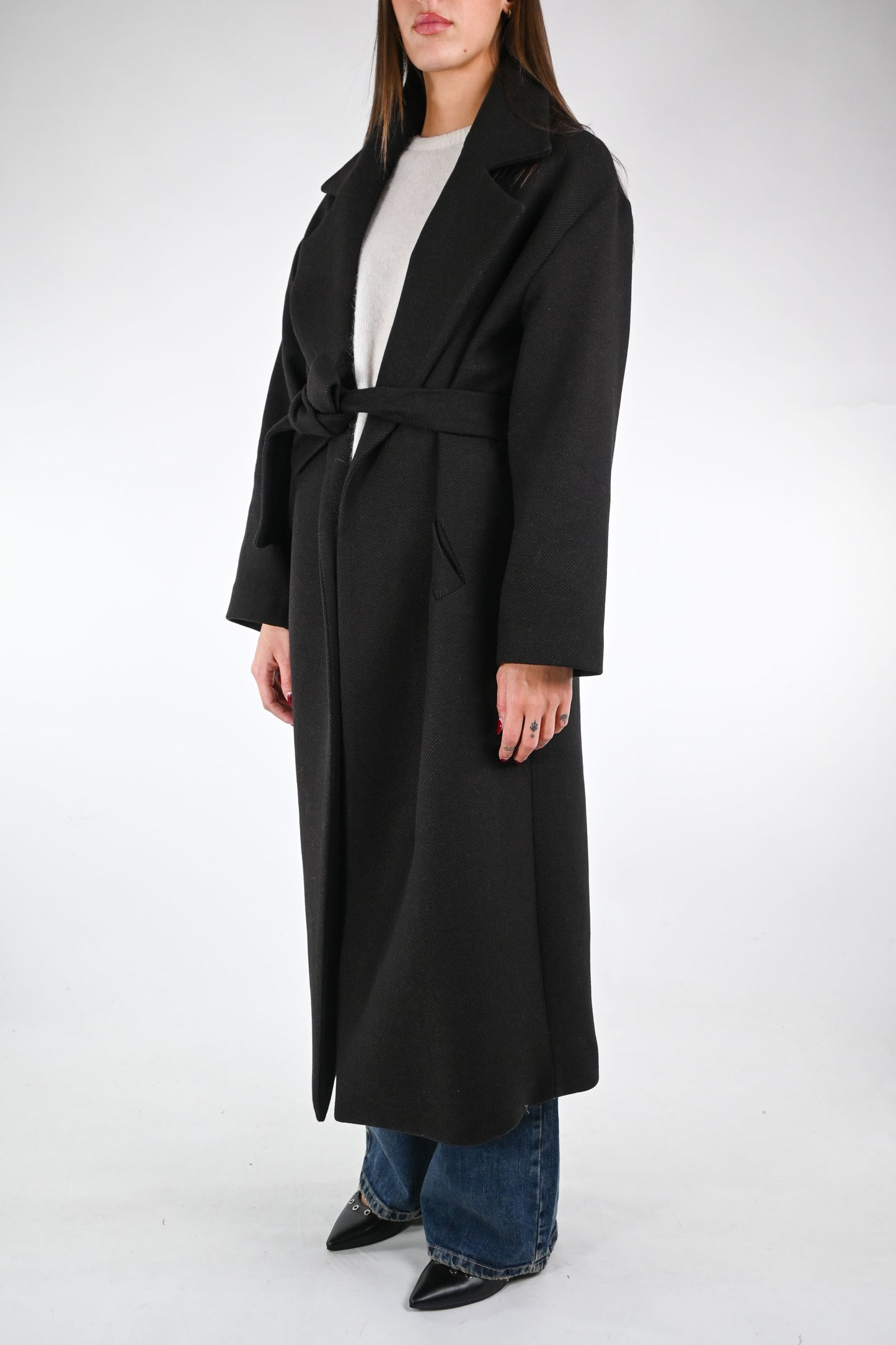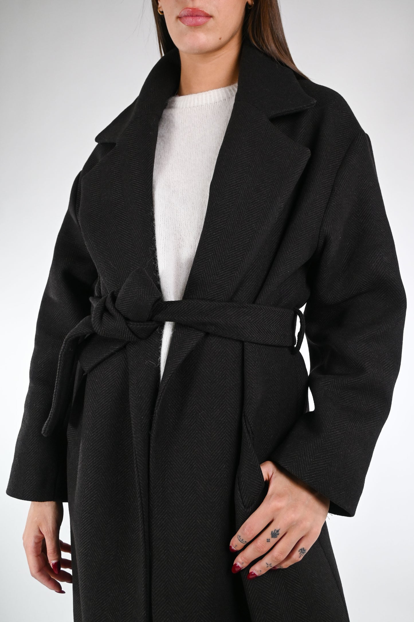 Cappotto a vestaglia in lana, con cintura dello stesso materiale, foderato, con tasche, spinato moro