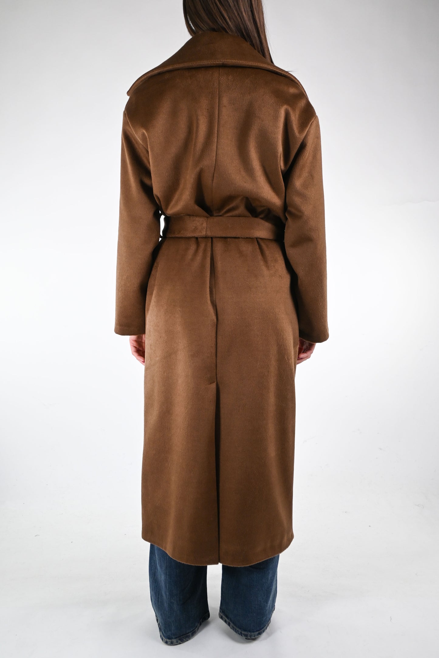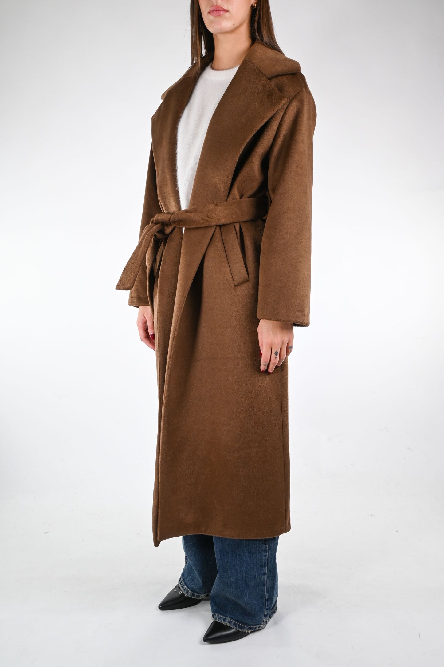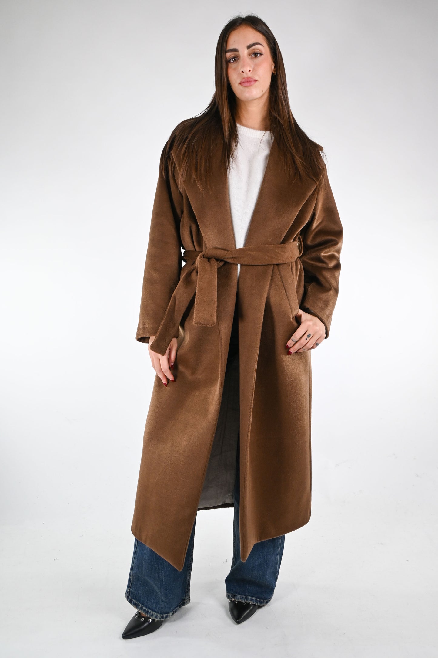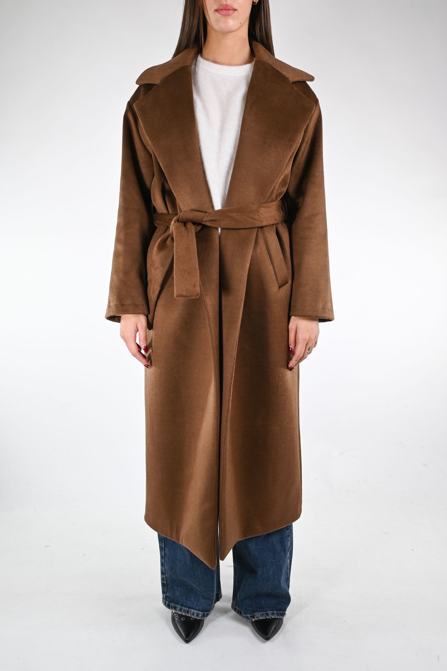 Cappotto a vestaglia mano morbida, leggermente peloso, con cintura dello stesso materiale, foderato, con tasche, color biscotto