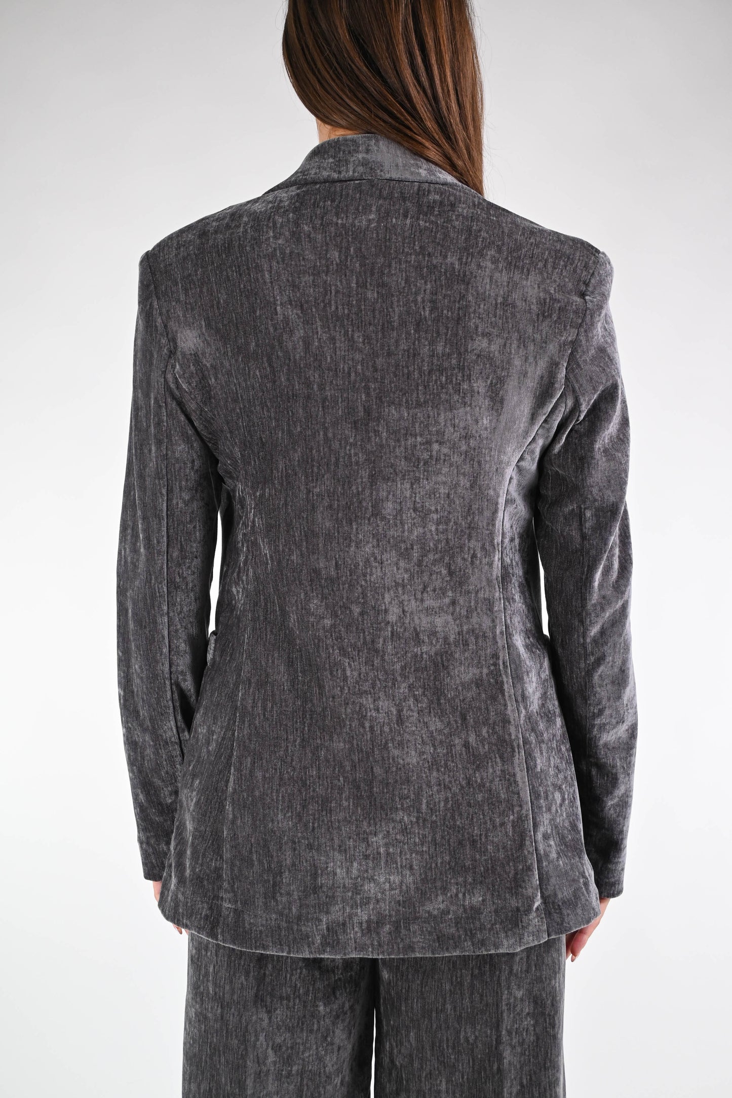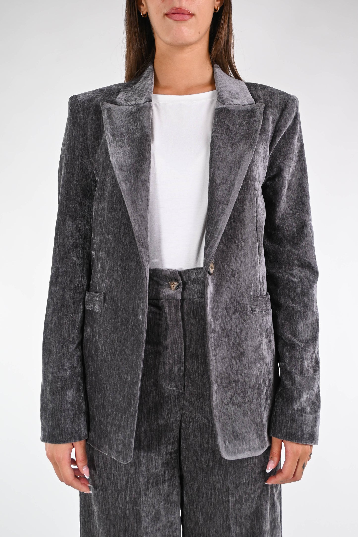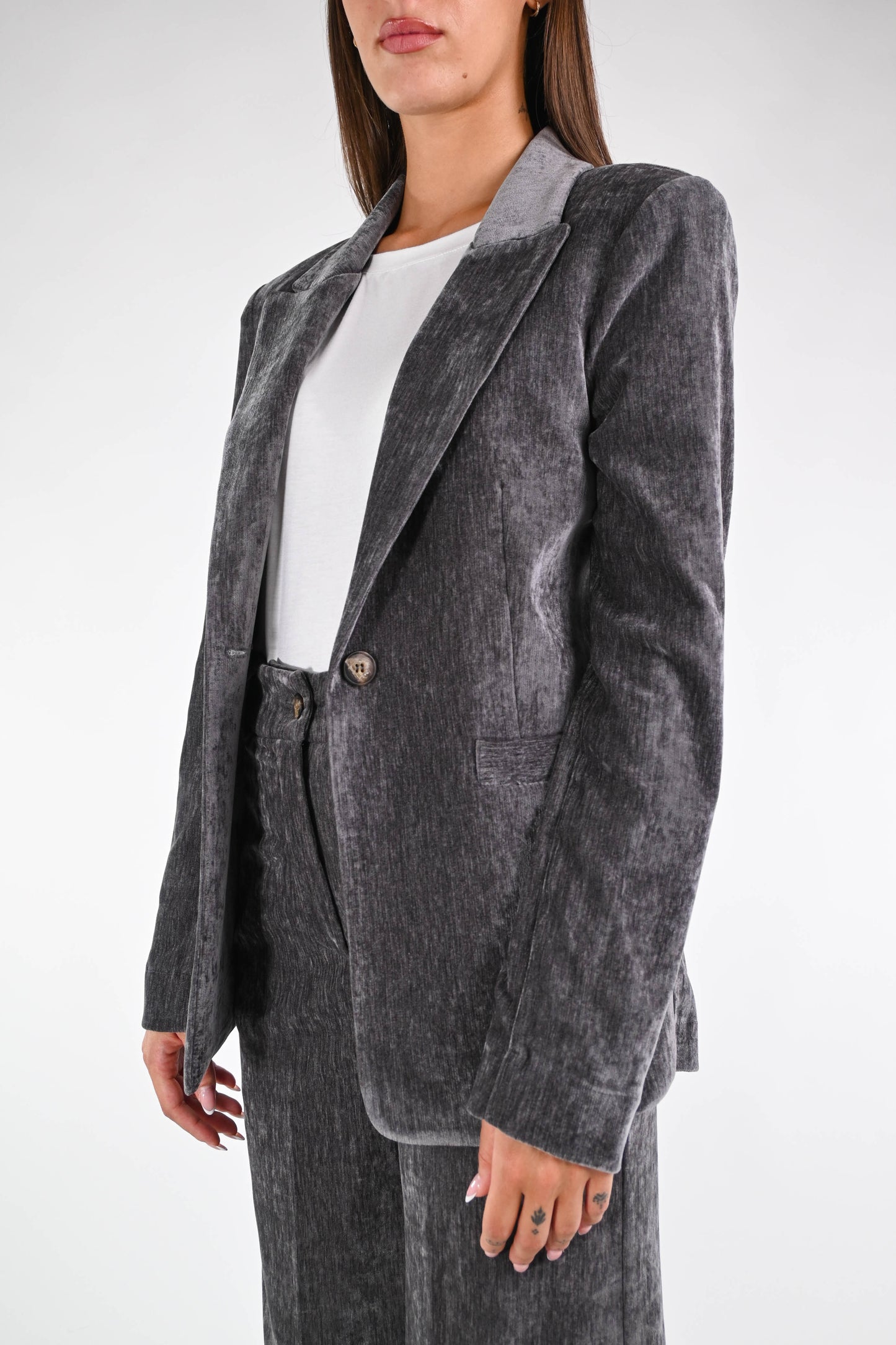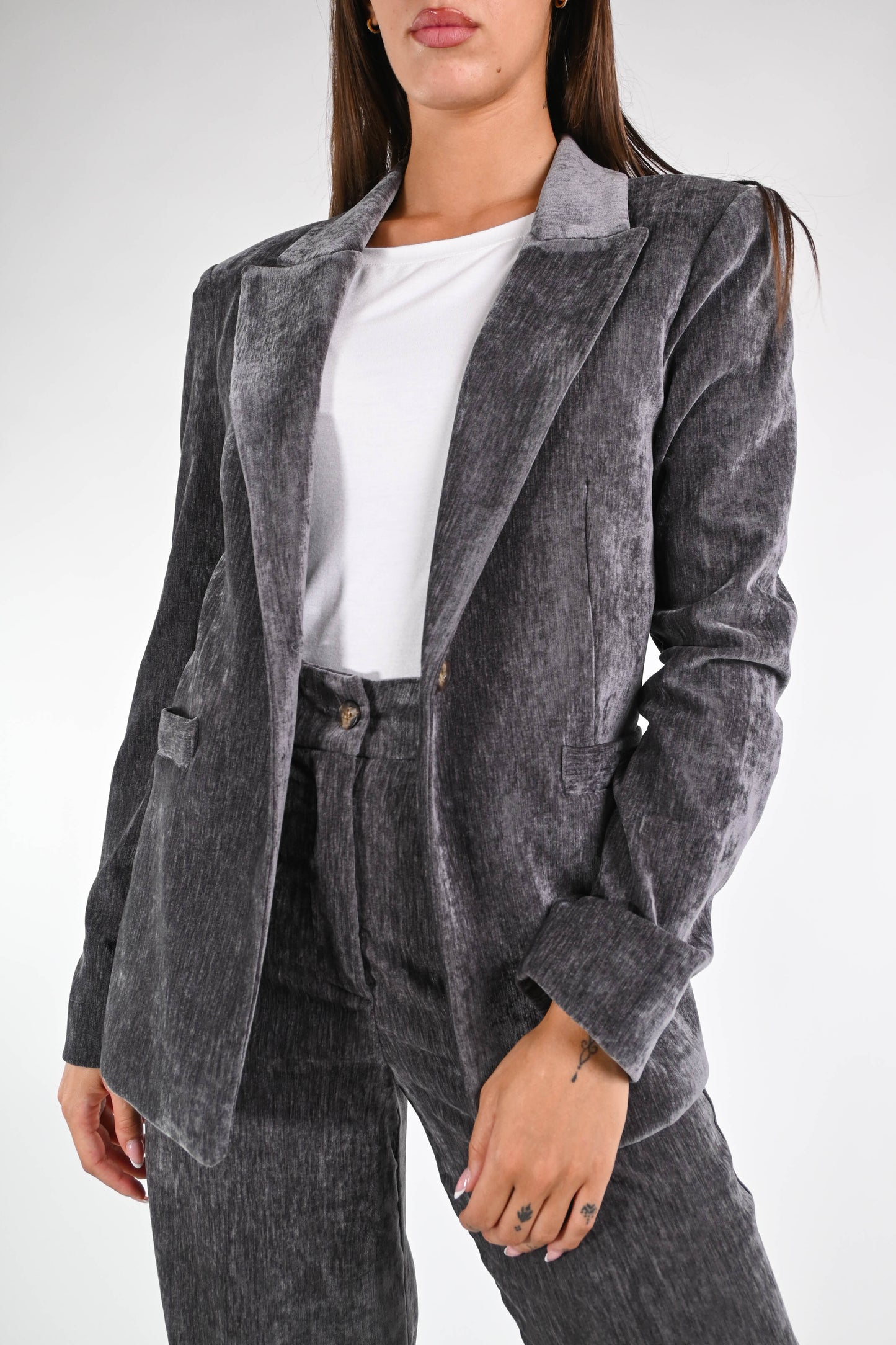 Giacca collo lancia in velluto liscio, ad un bottone, sfoderata, elasticizzata, color piombo