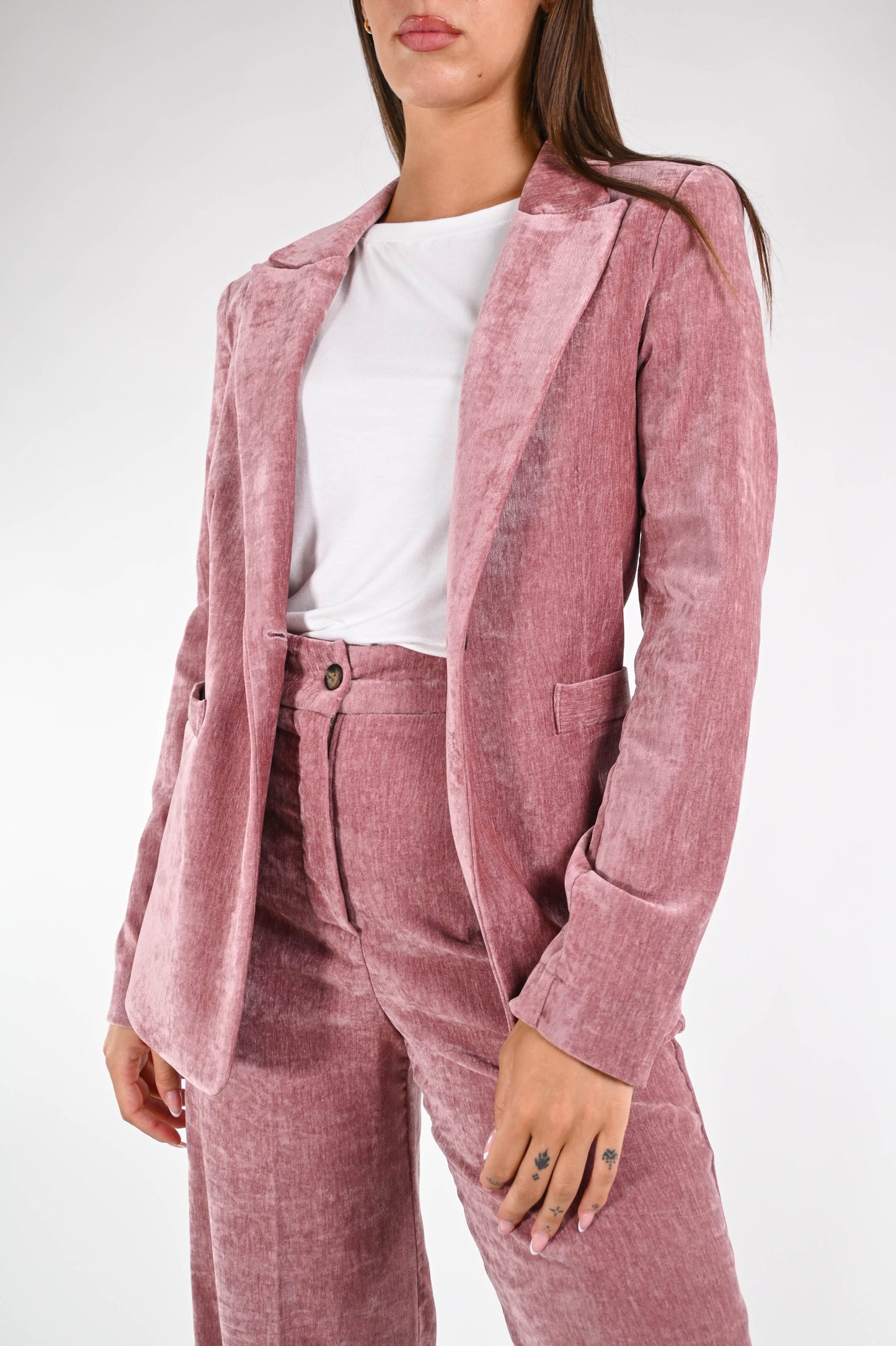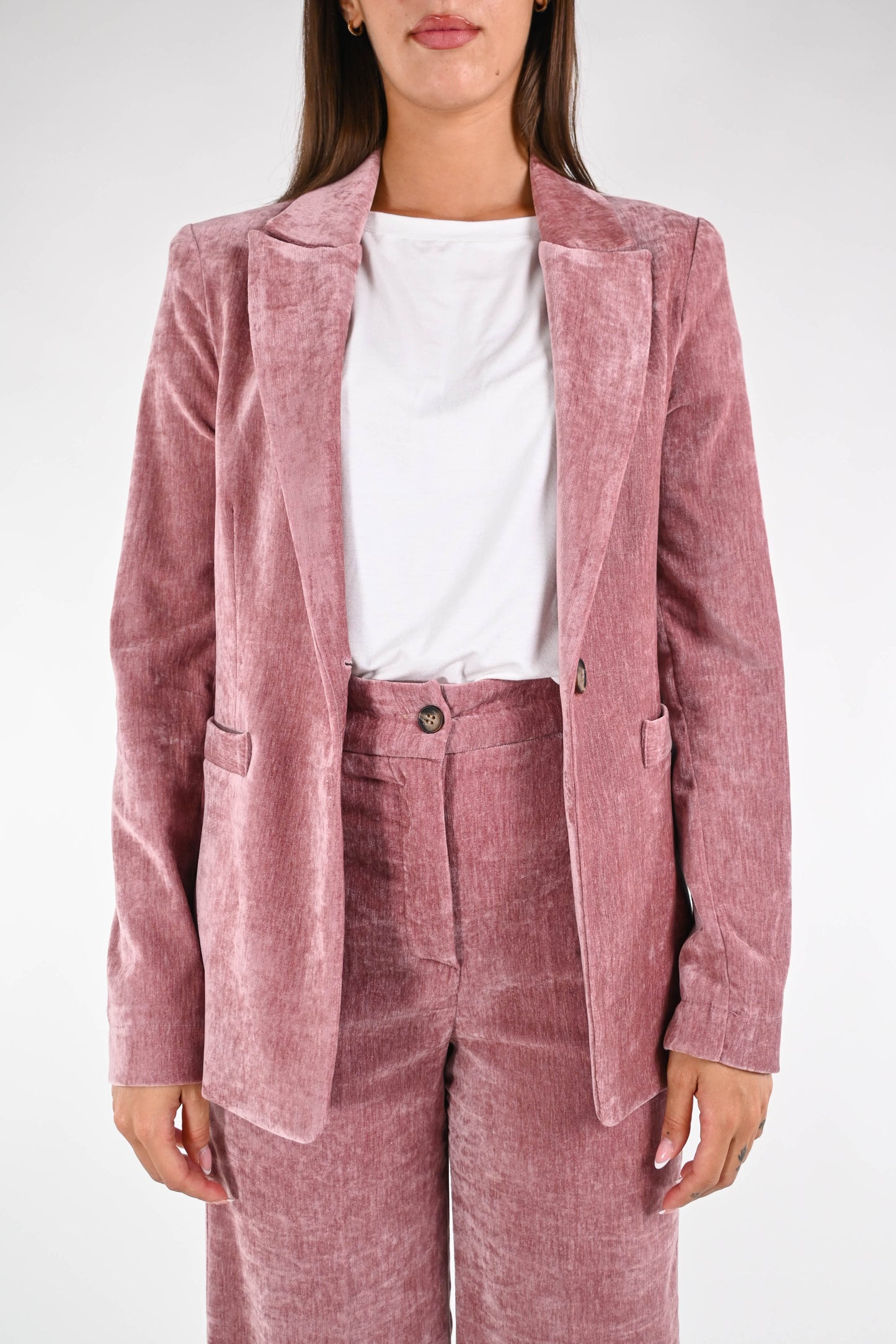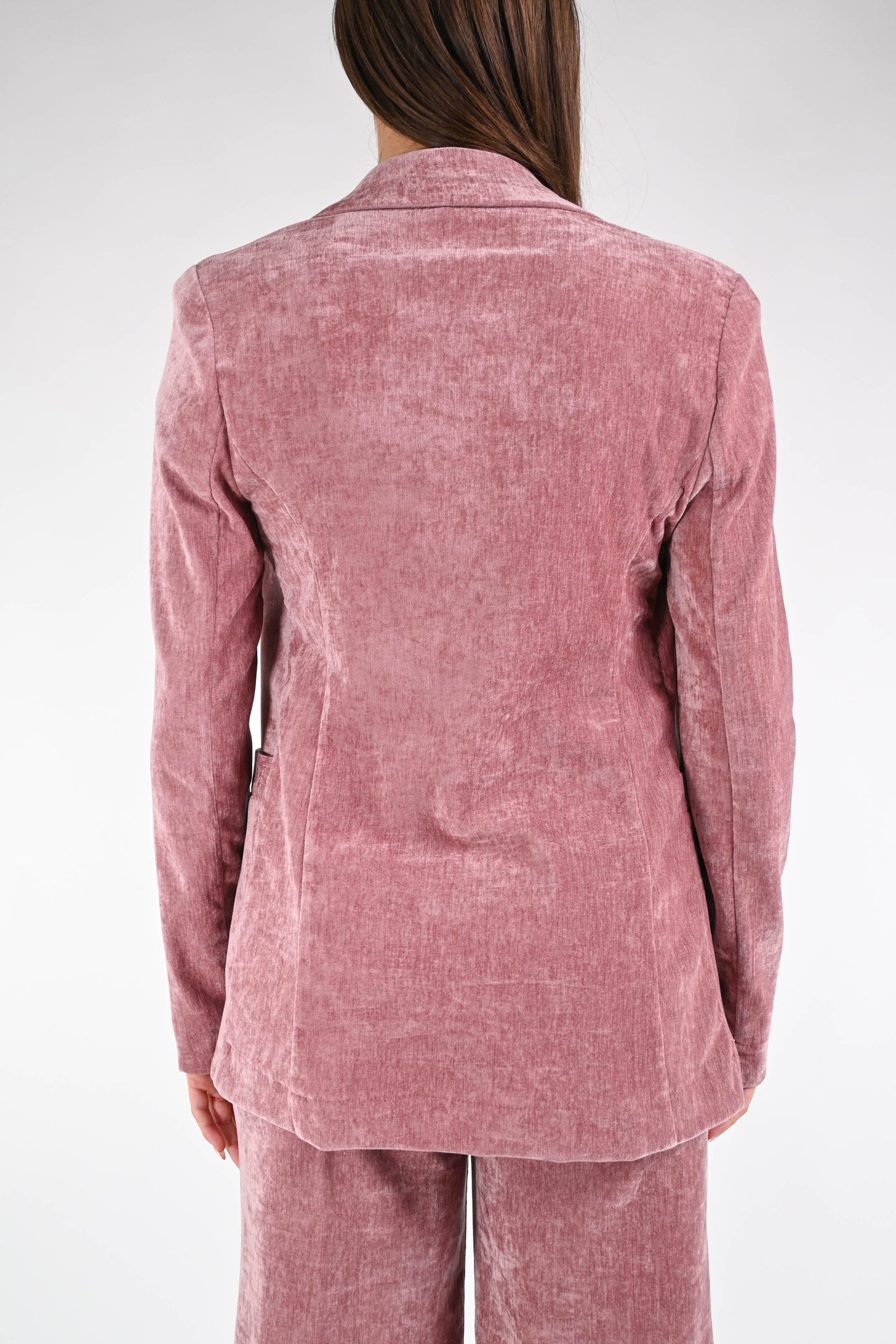 Giacca collo lancia in velluto liscio, ad un bottone, sfoderata, elasticizzata, color rosa