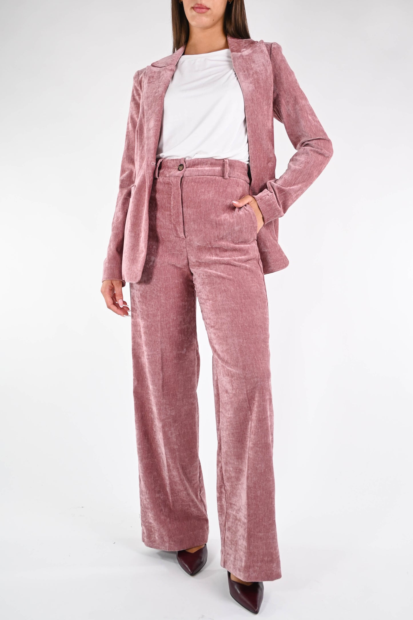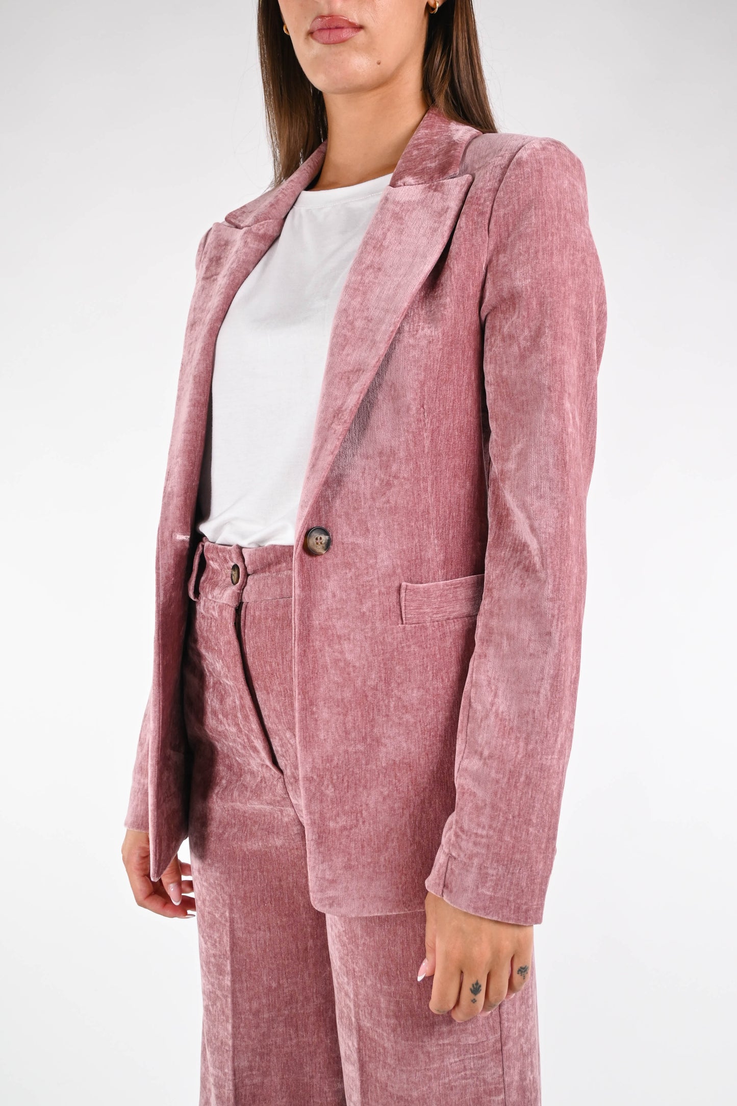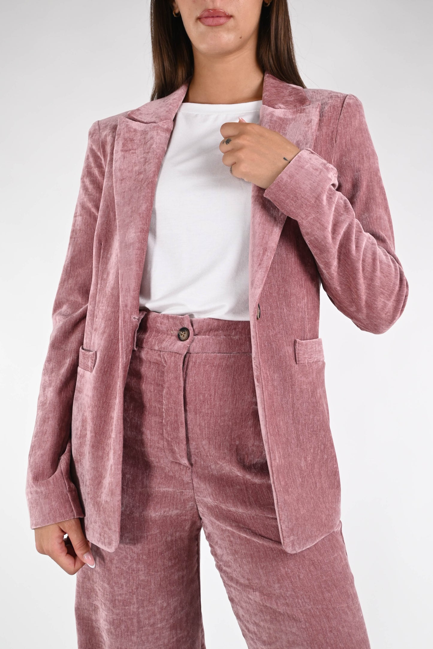 Giacca collo lancia in velluto liscio, ad un bottone, sfoderata, elasticizzata, color rosa