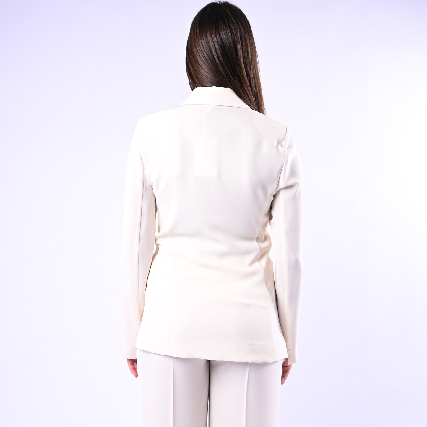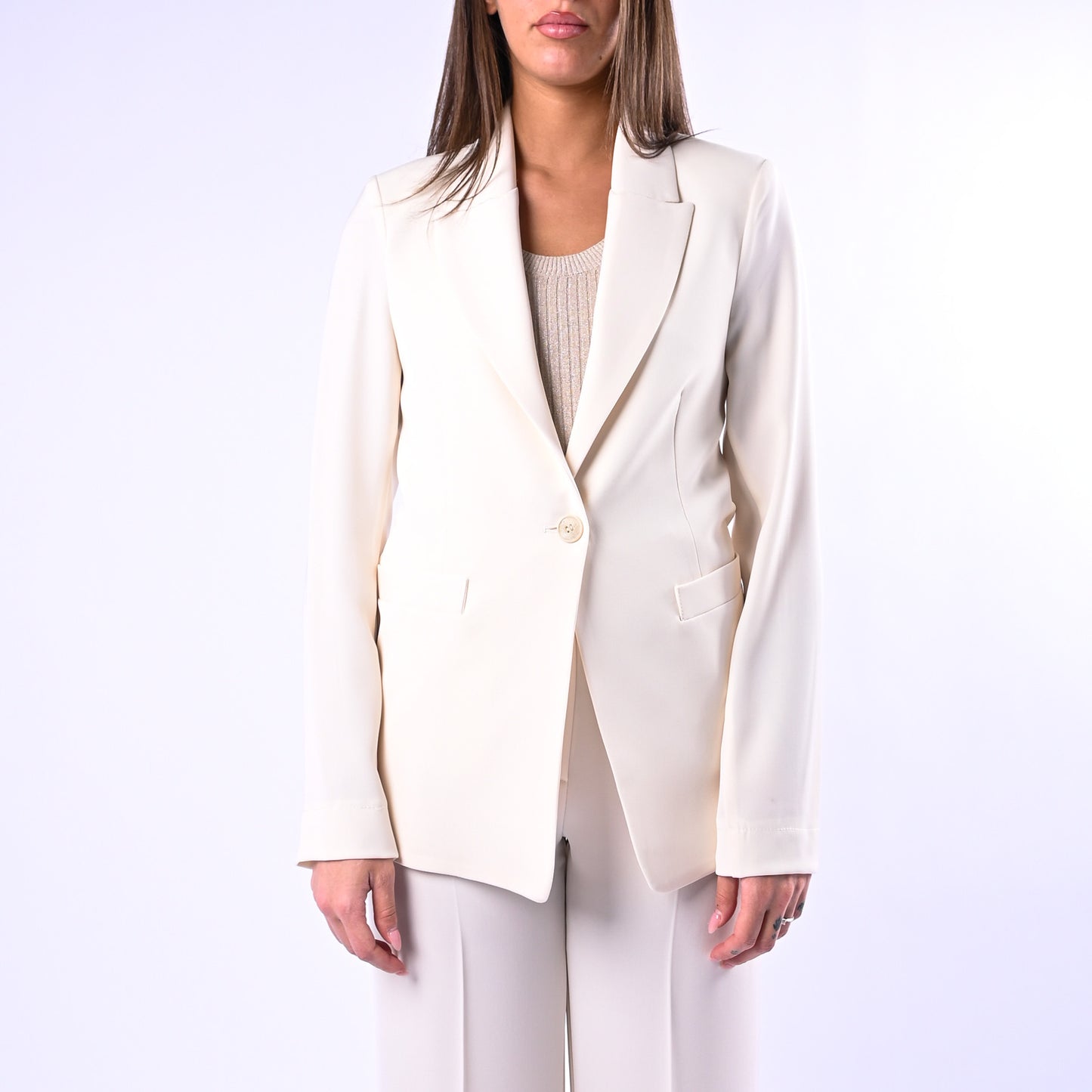 Giacca in tessuto fluido e leggero con un bottone e collo a lancia, perfetta per uno stile sofisticato e versatile. Sfoderata e facilmente abbinabile al pantalone coordinato della collezione.