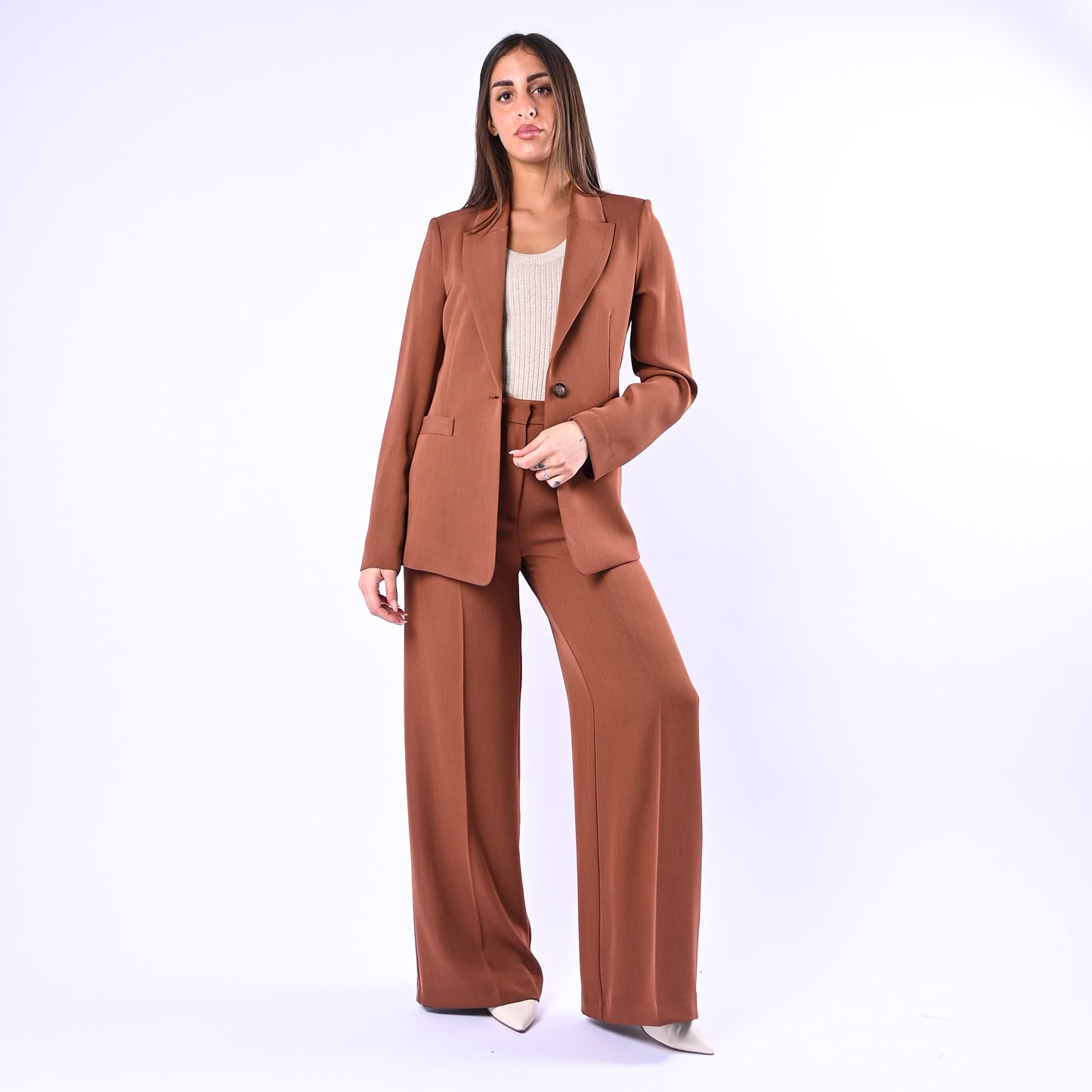 Pantalone palazzo in tessuto fluido e leggero che garantisce comfort e eleganza. Dotato di tasche francesi e chiusura con bottone e gancetto, si sposa perfettamente con la giacca coordinata per un look raffinato e completo.