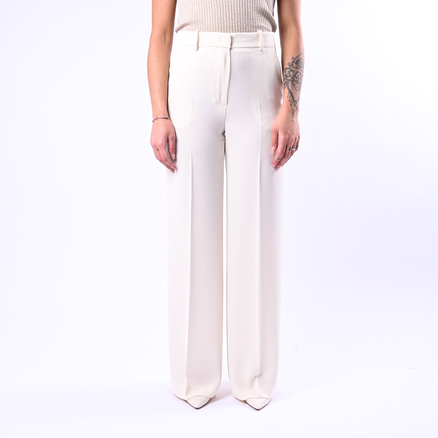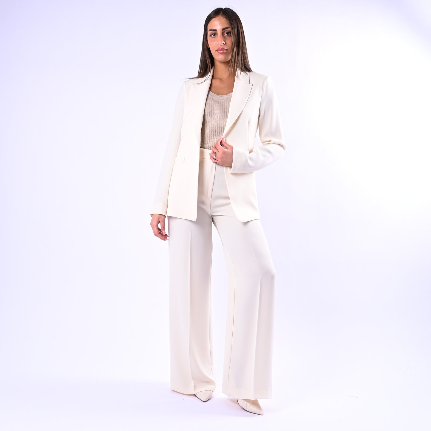 Pantalone palazzo in tessuto fluido e leggero che garantisce comfort e eleganza. Dotato di tasche francesi e chiusura con bottone e gancetto, si sposa perfettamente con la giacca coordinata per un look raffinato e completo.