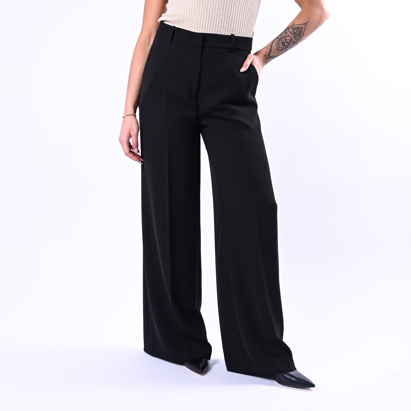 Pantalone palazzo in tessuto fluido e leggero che garantisce comfort e eleganza. Dotato di tasche francesi e chiusura con bottone e gancetto, si sposa perfettamente con la giacca coordinata per un look raffinato e completo.