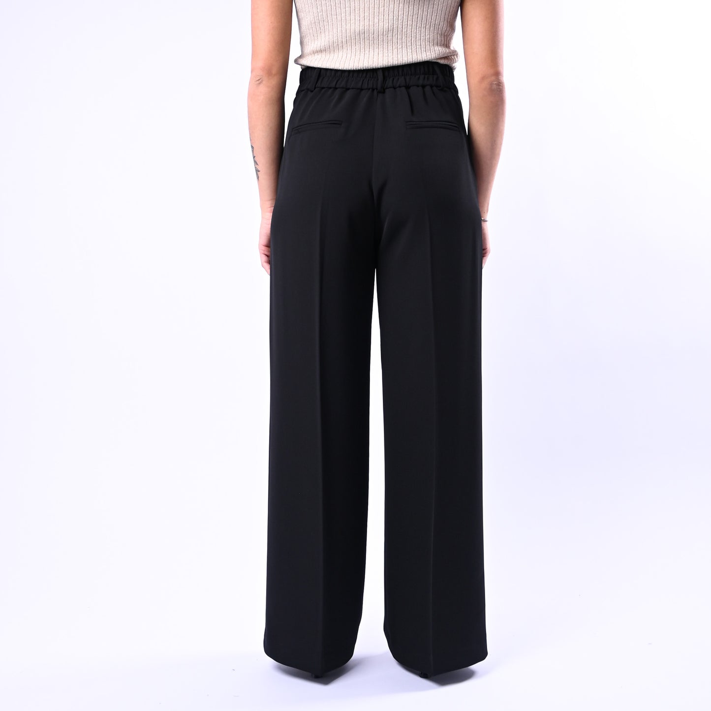 Pantalone palazzo in tessuto fluido e leggero, con linea ampia e confortevole, perfetto per uno stile elegante e versatile. Dotato di mezzo elastico in vita per una vestibilità pratica e tasche a filo, si sposa perfettamente con la giacca coordinata per un look raffinato e completo.
