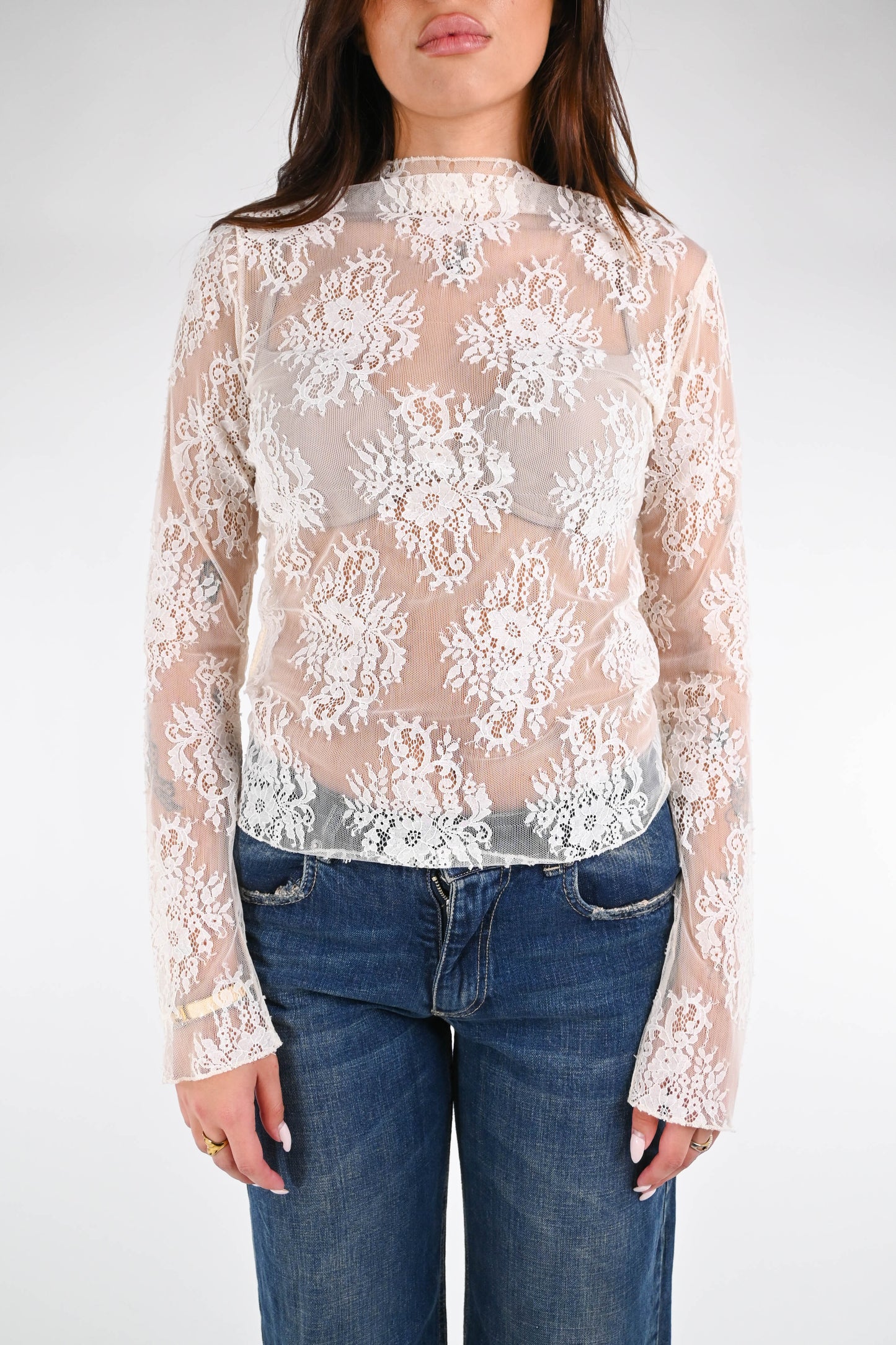 Blusa in pizzo con collo a cratere, manica lunga, elasticizzata, color burro