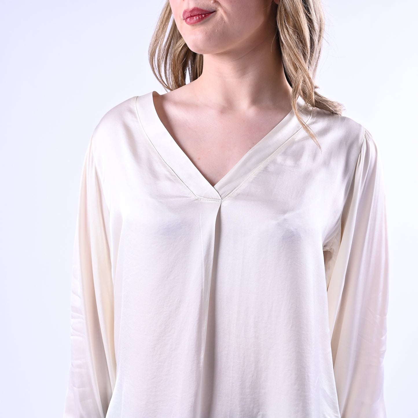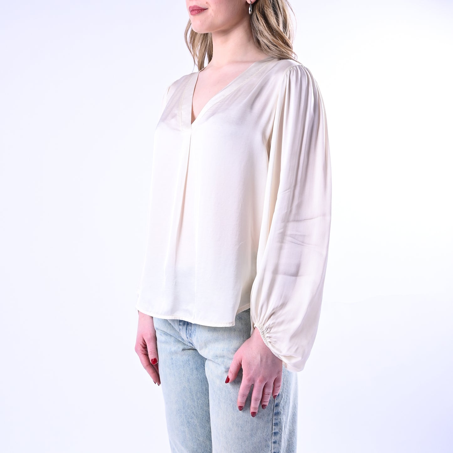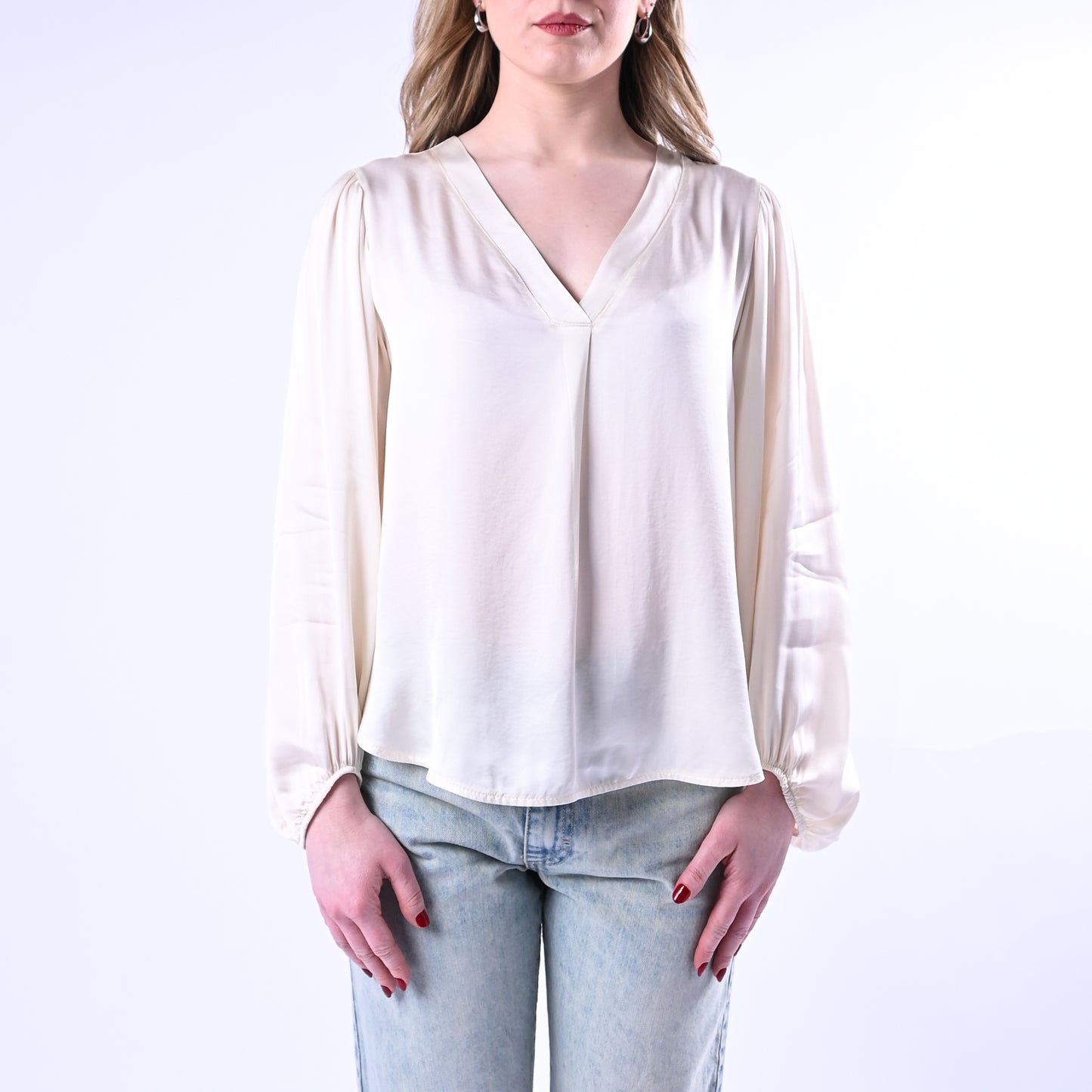 Blusa in viscosa con scollo a V , maniche lunghe con dettaglio a palloncino e elastico al polsino per una vestibilità confortevole e raffinata. Perfetta per creare look sofisticati sia in ufficio che nel tempo libero.