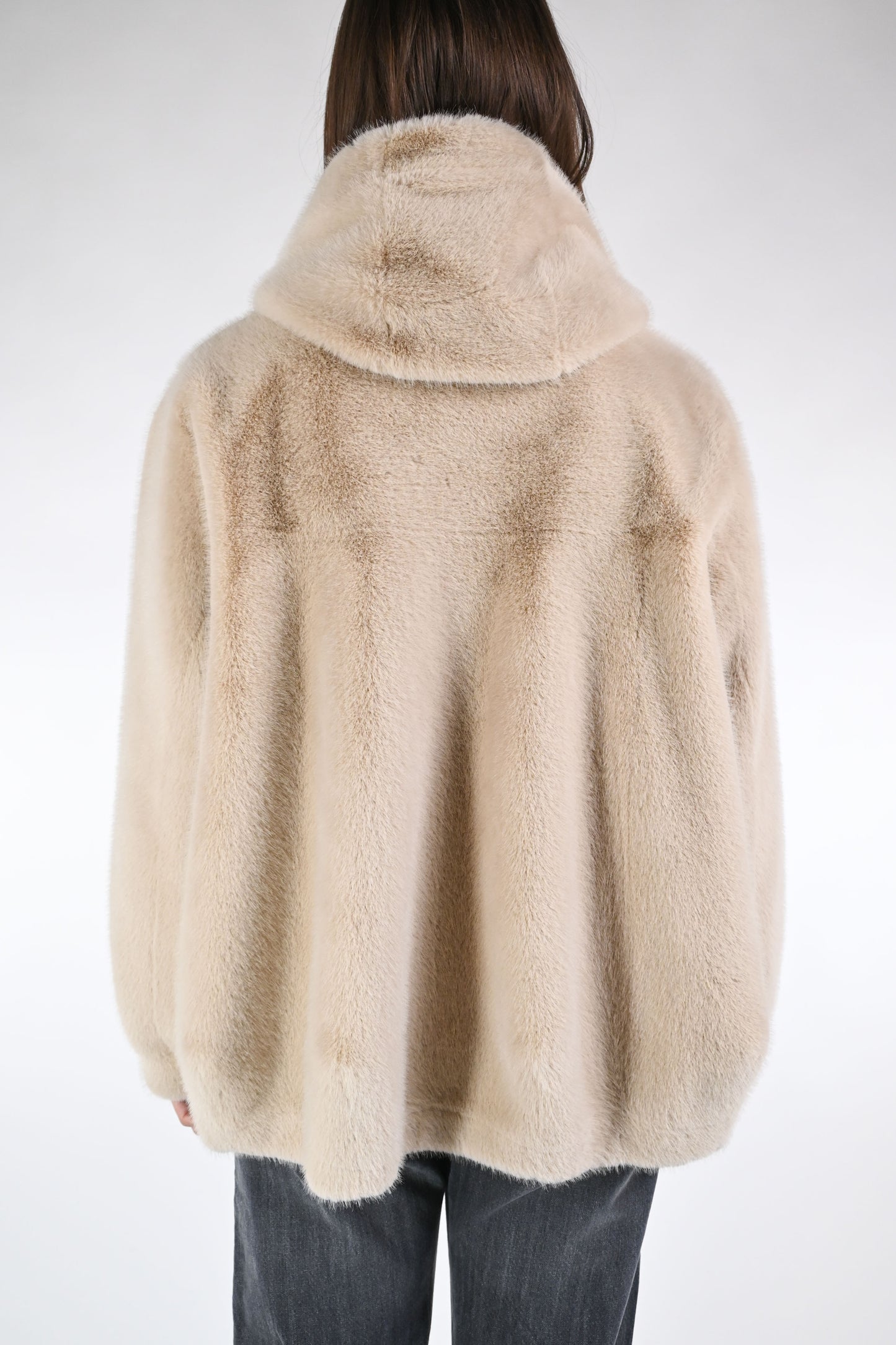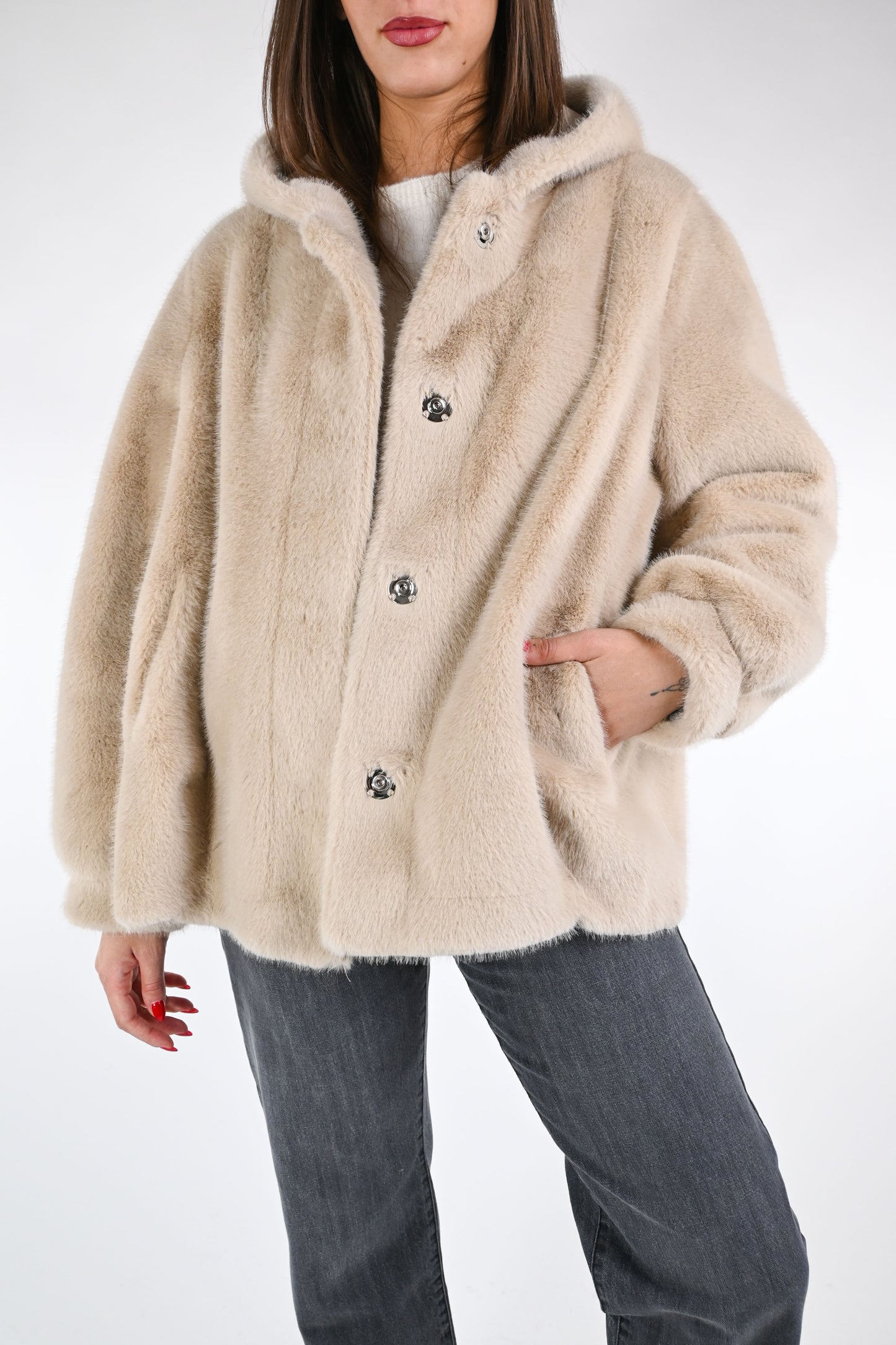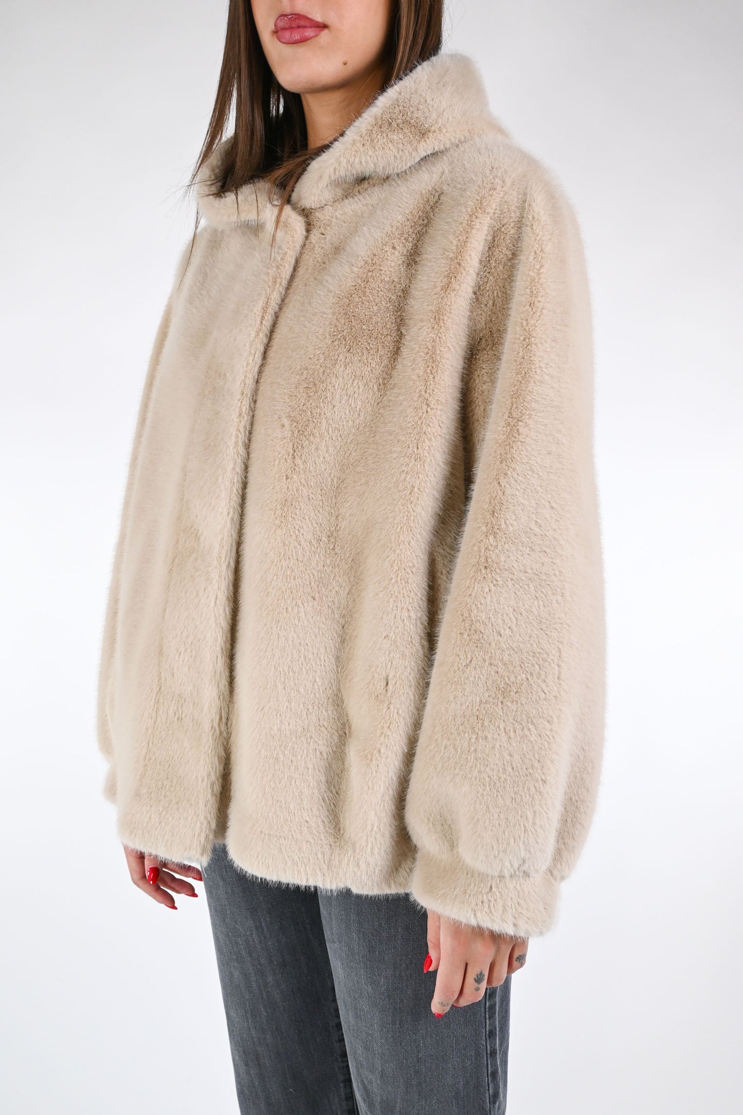 Bomber Ecopelliccia con cappuccio, con tasche, con bottoni a clip, color beige