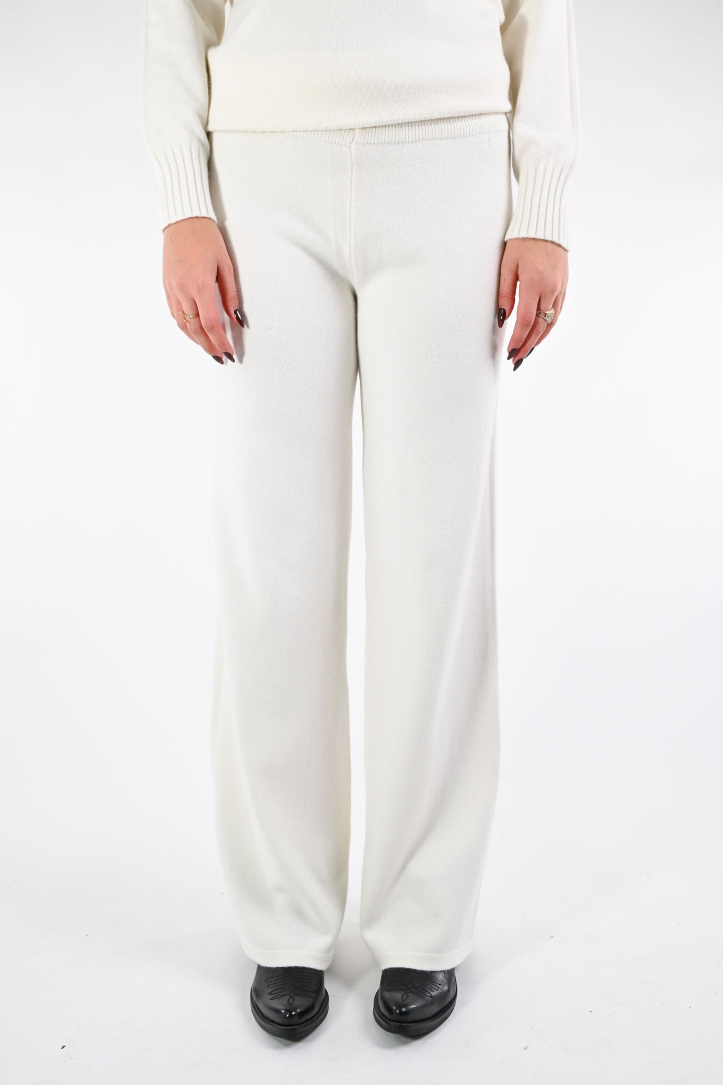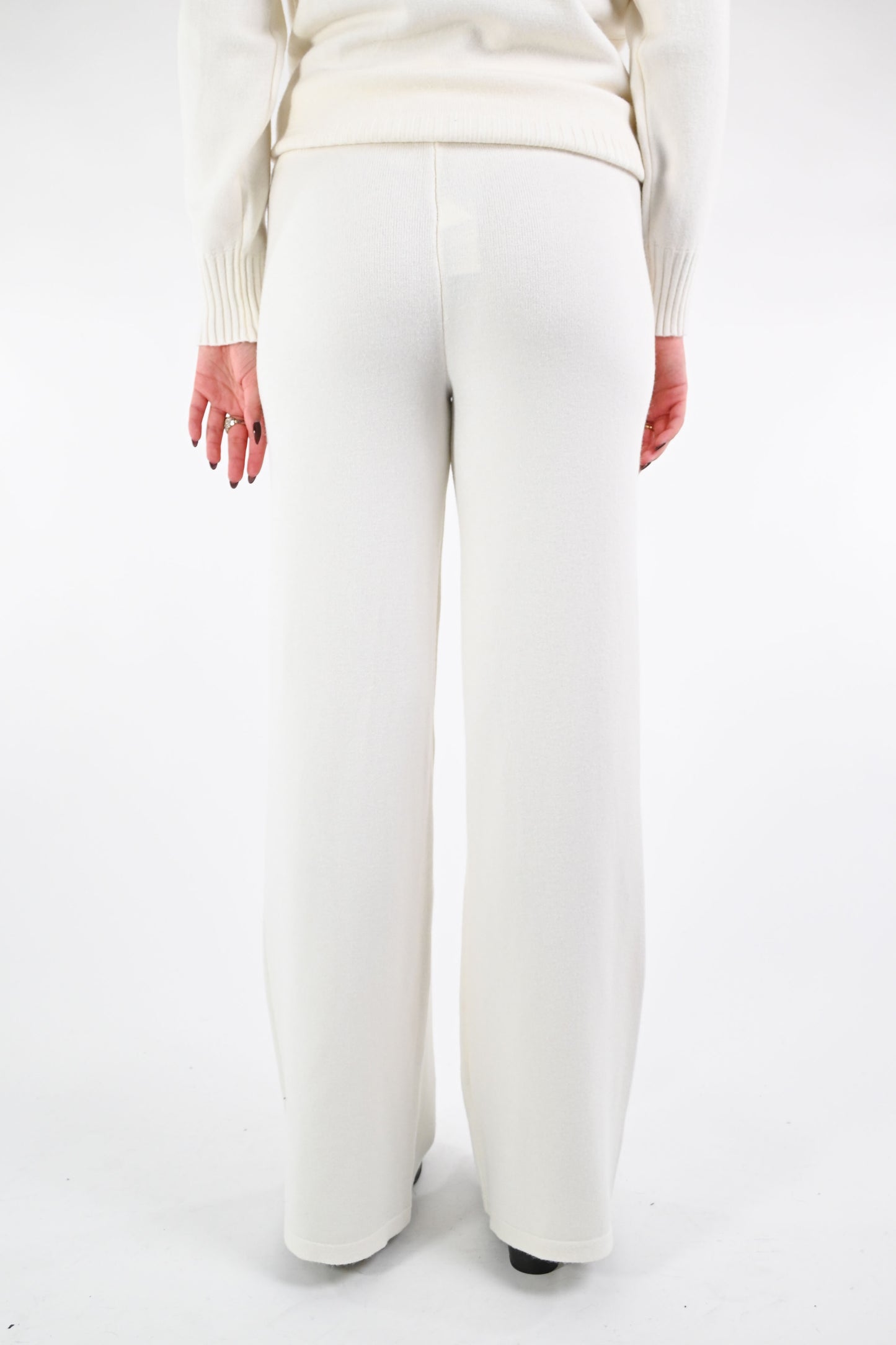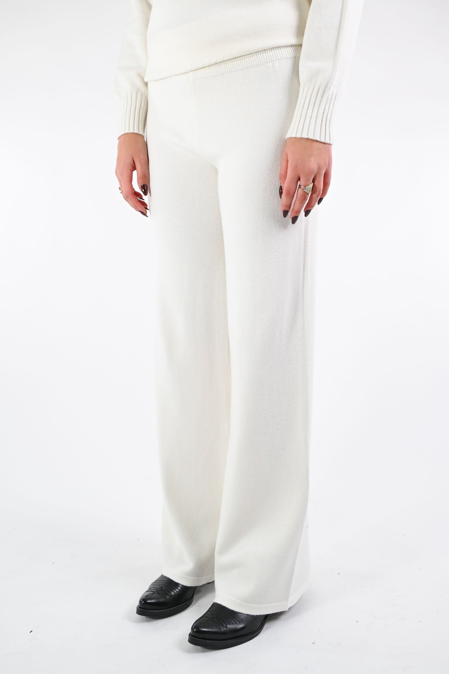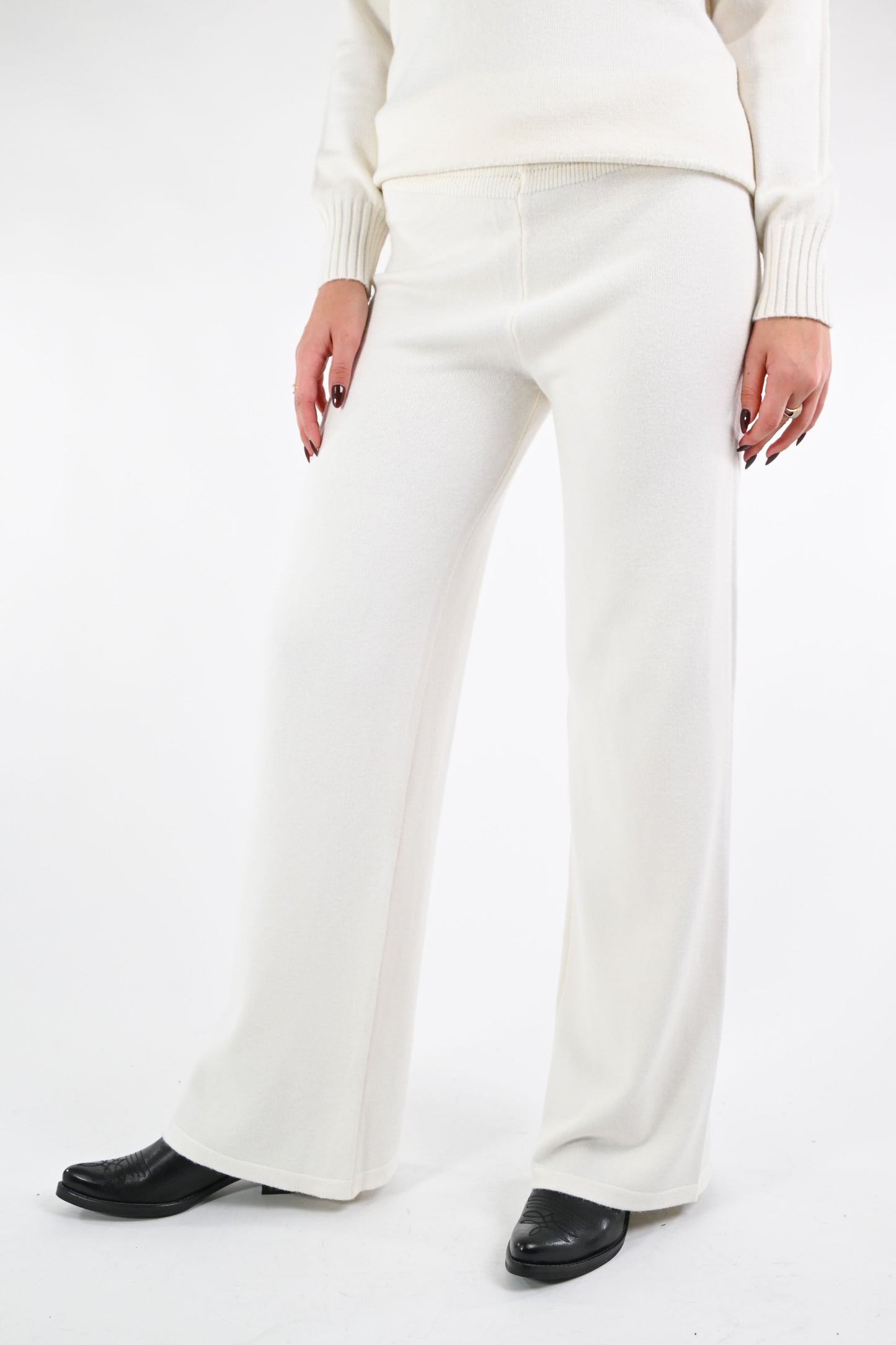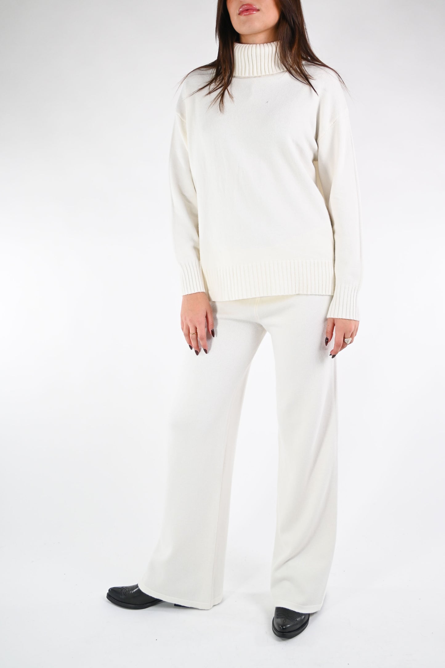 Completo elasticizzato in maglia collo alto con spacchetto dietro, con pantalone palazzo, con elastico in vita, colore panna