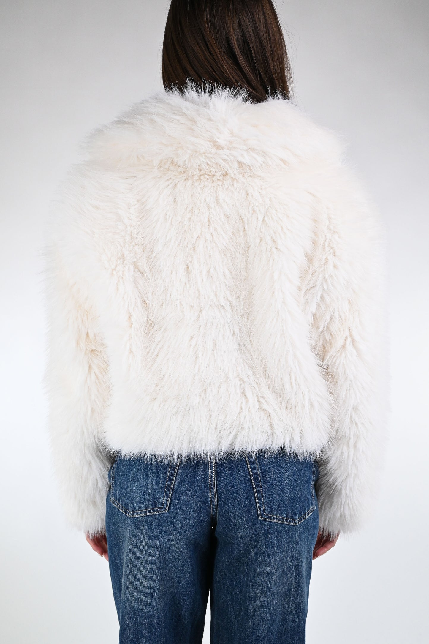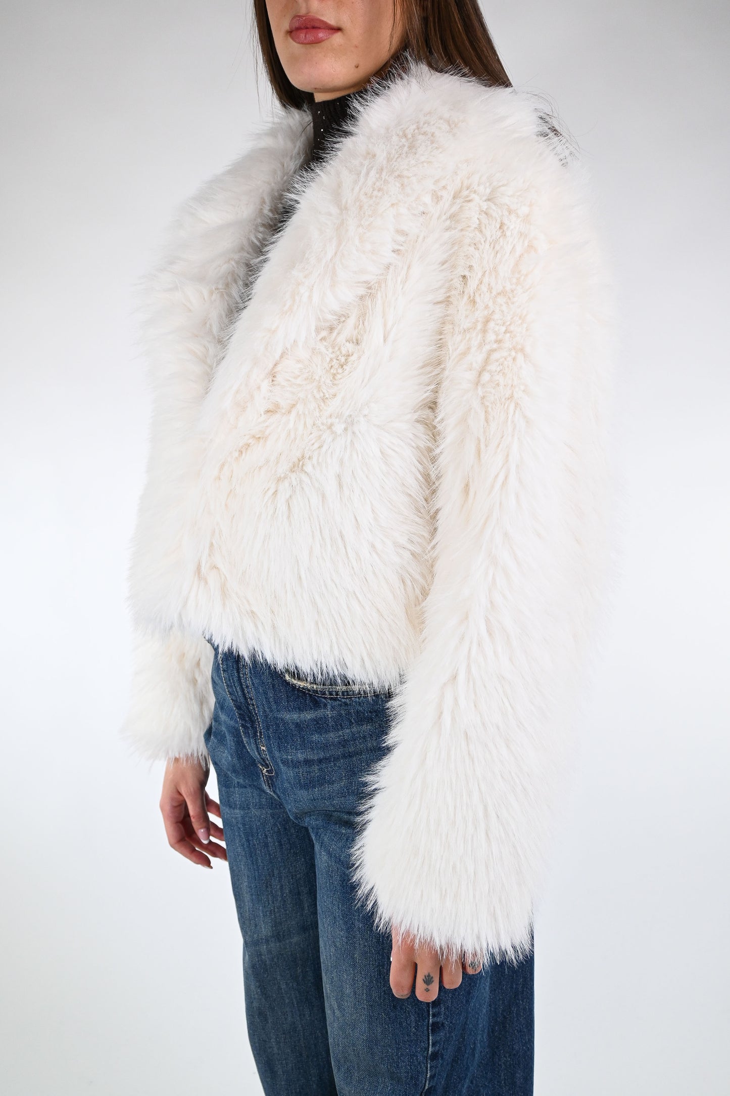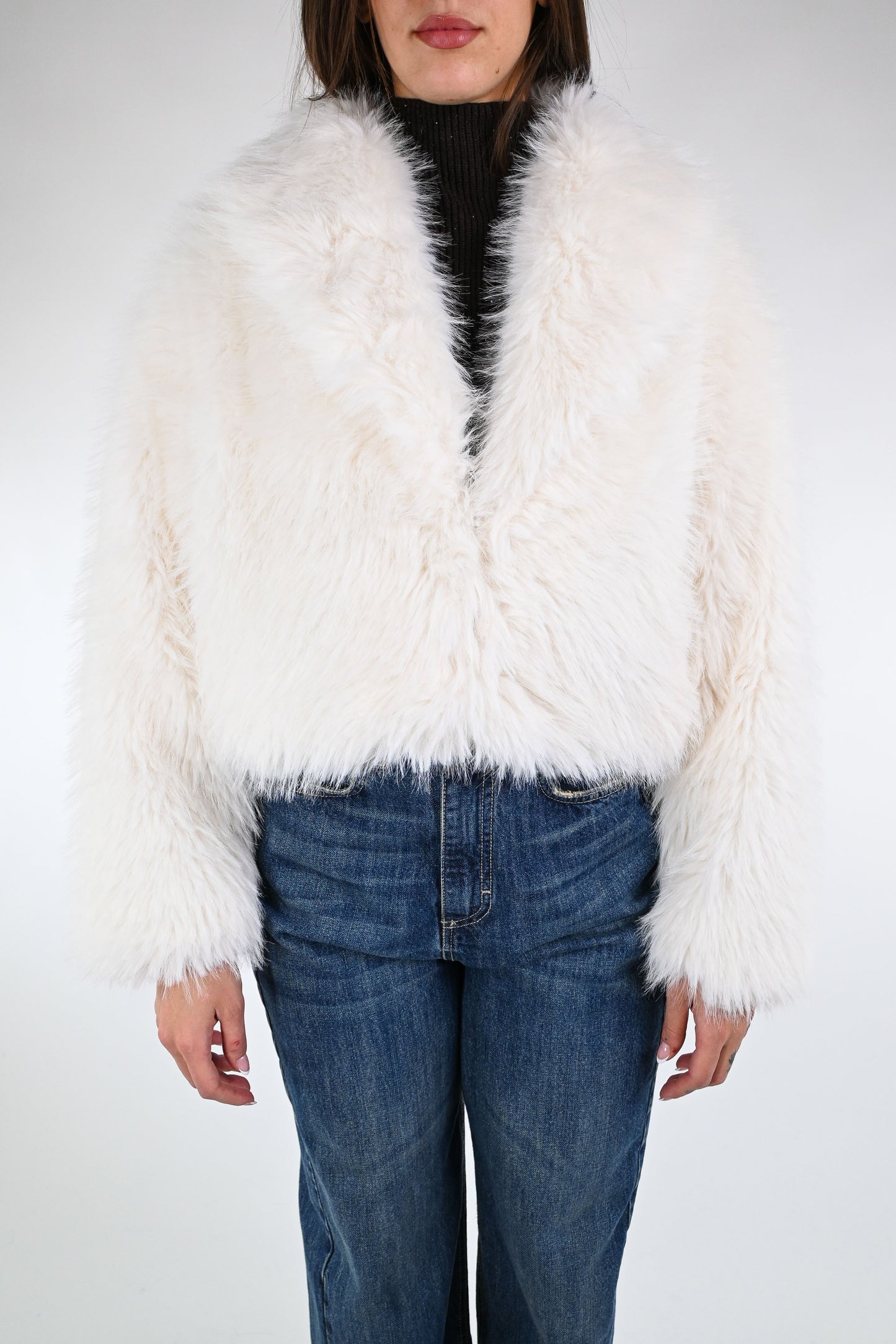 Ecopelliccia corta con collo a scialle, chiusura con gancetto, con tasche, foderata, colore Panna