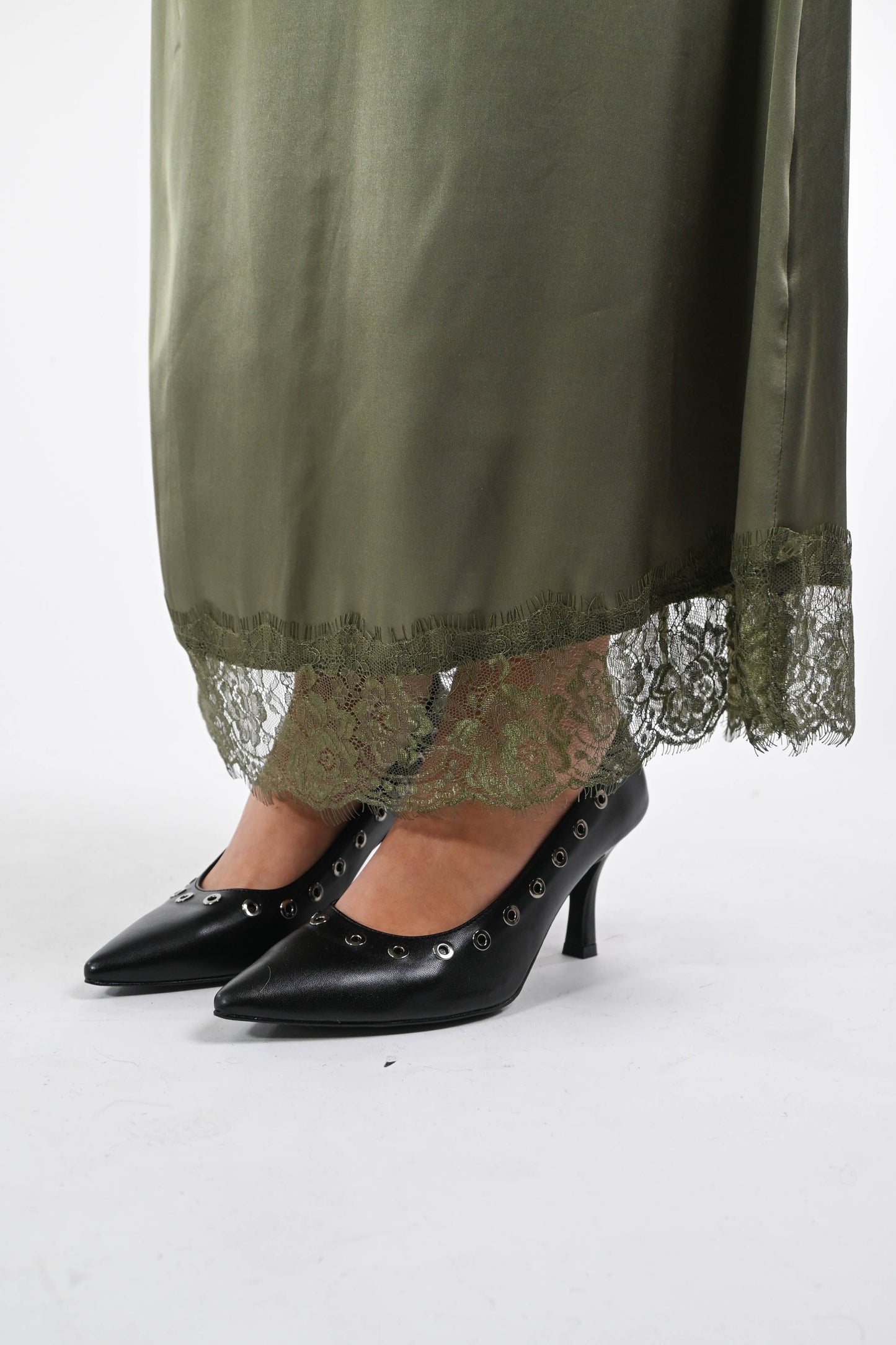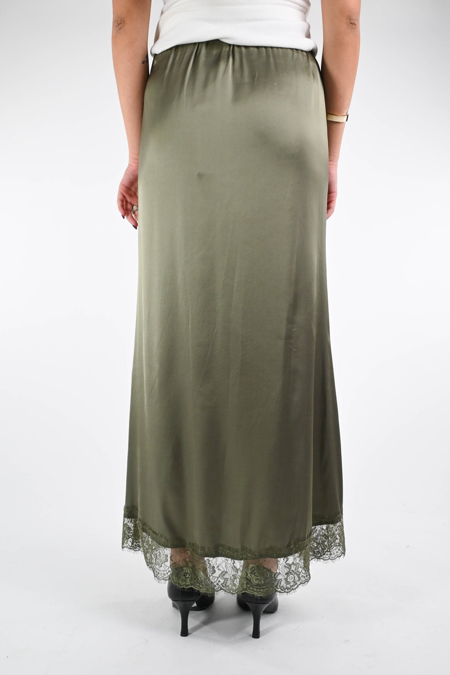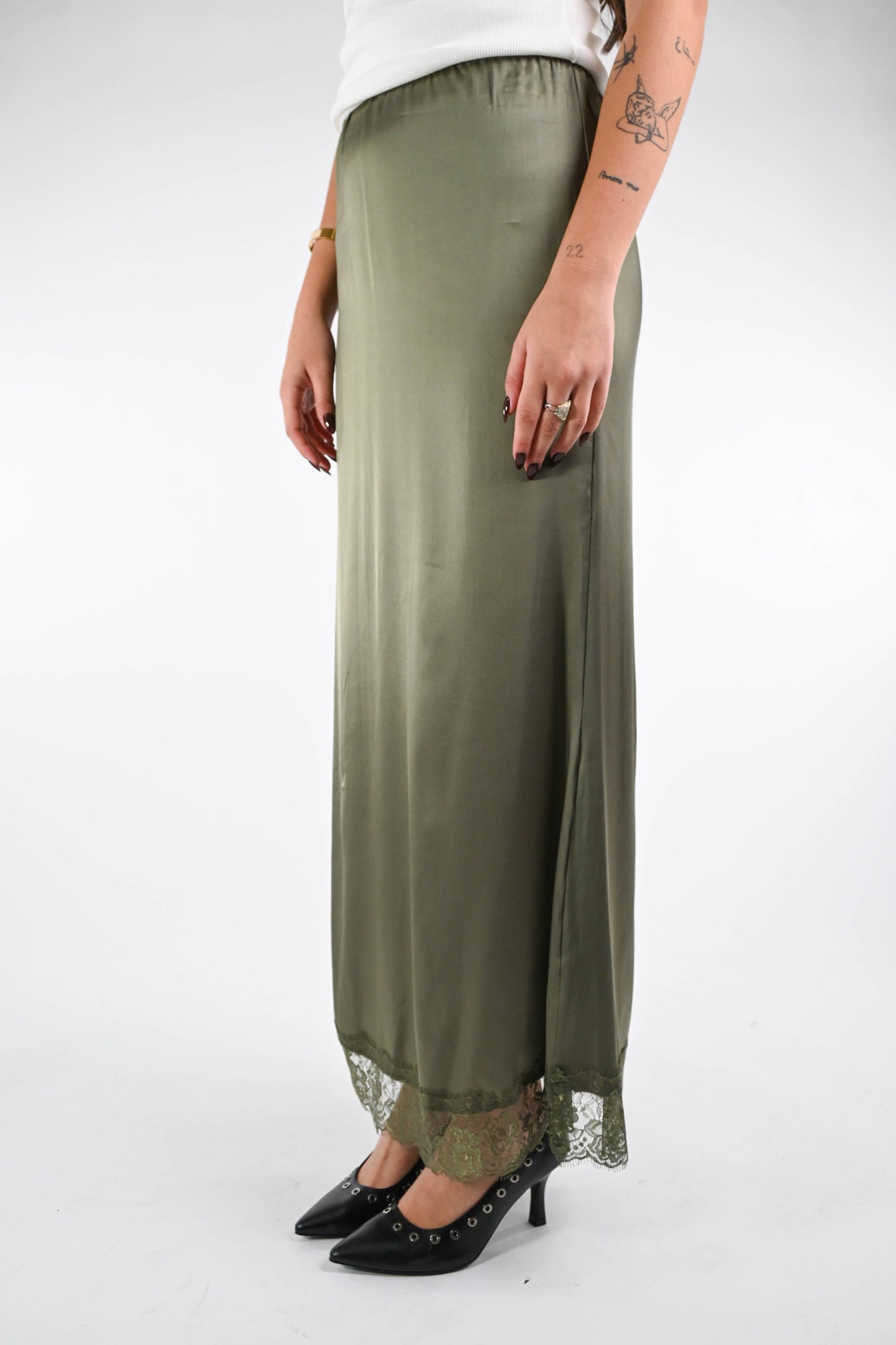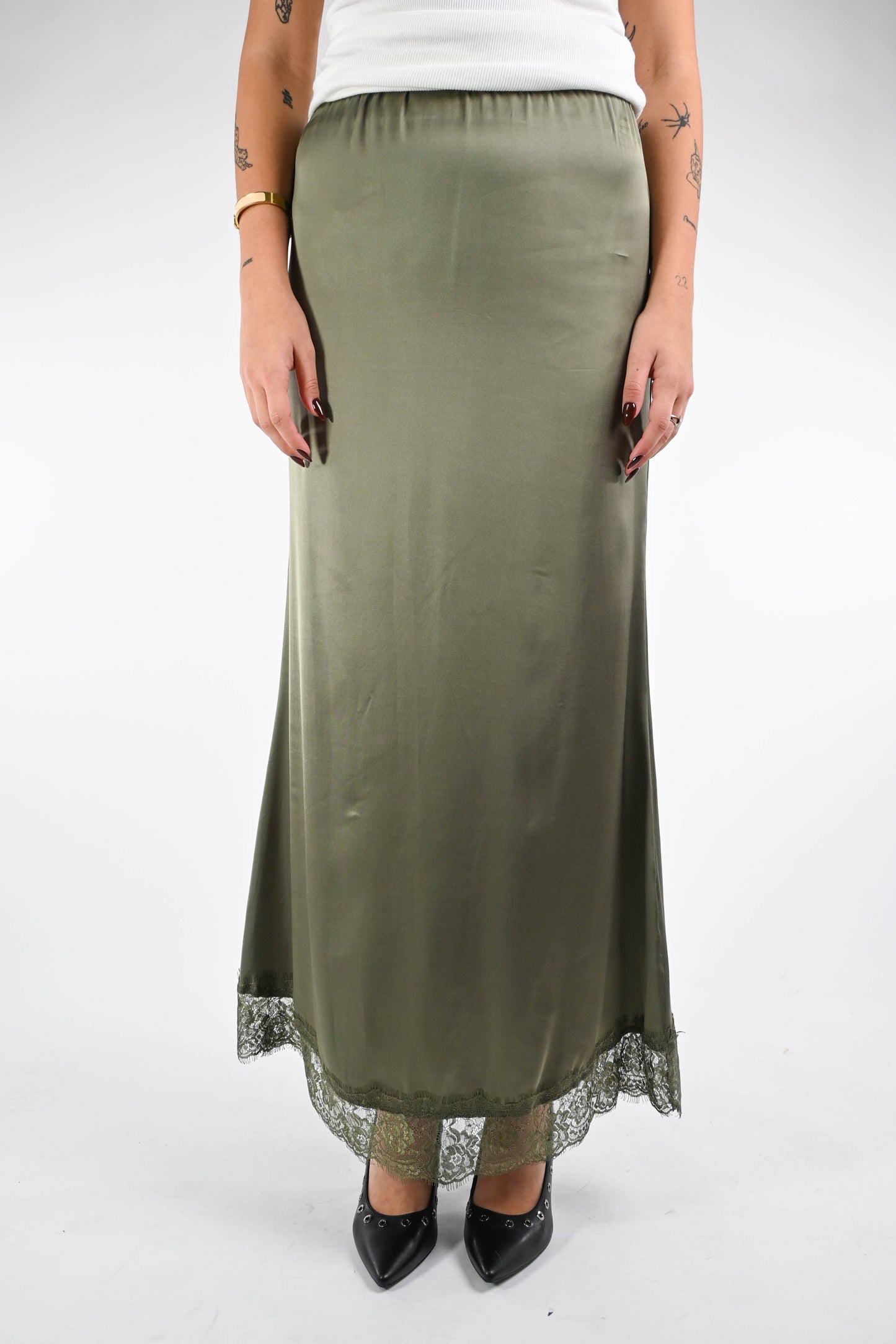 Gonna lunga in satin con pizzo sul fondo, elastico in vita, colore militare