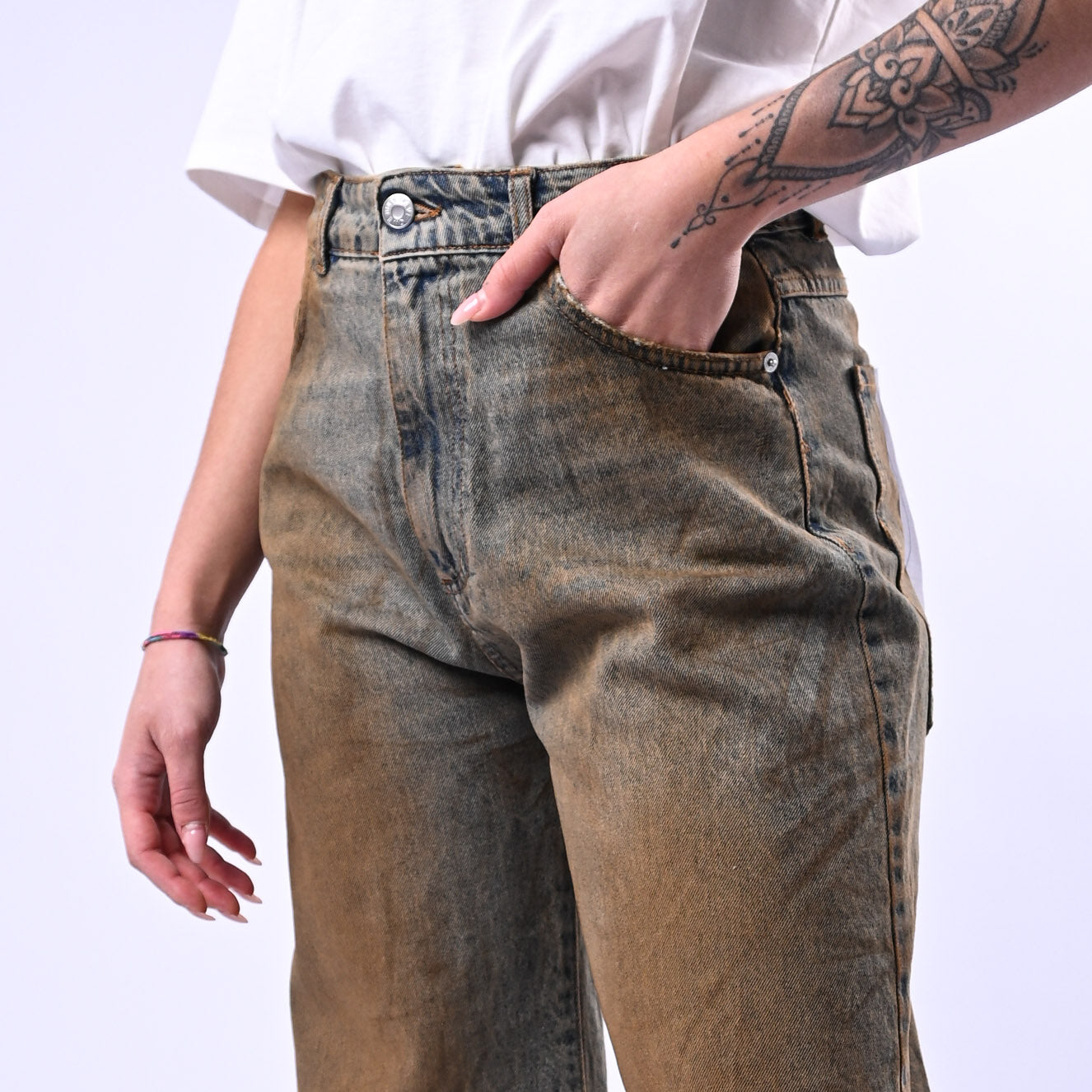 Jeans Amelie con tasche generose e dettagli spennellati che catturano la tonalità calda della ruggine. Un capo versatile e contemporaneo, perfetto per chi ricerca comfort senza compromessi sulla qualità e lo stile.