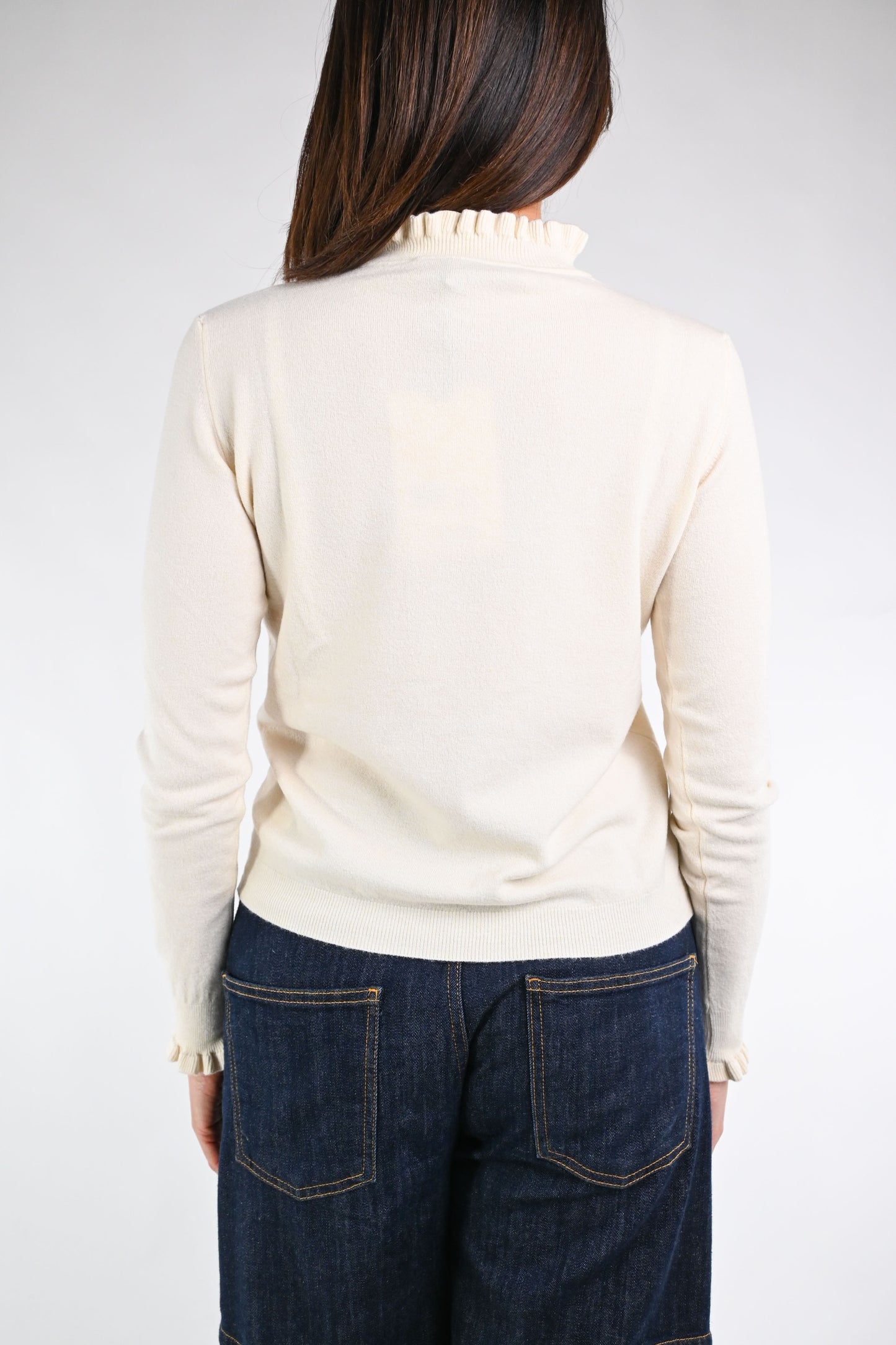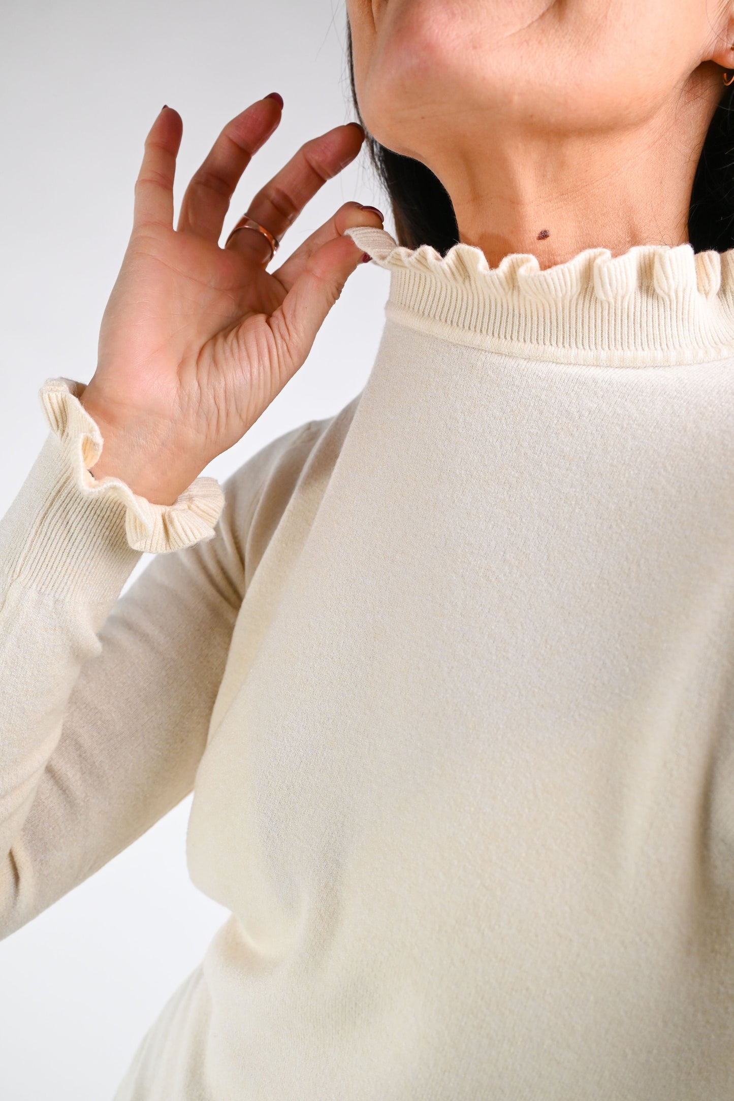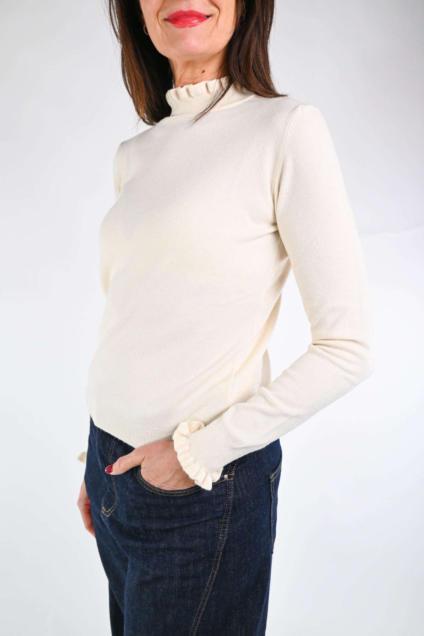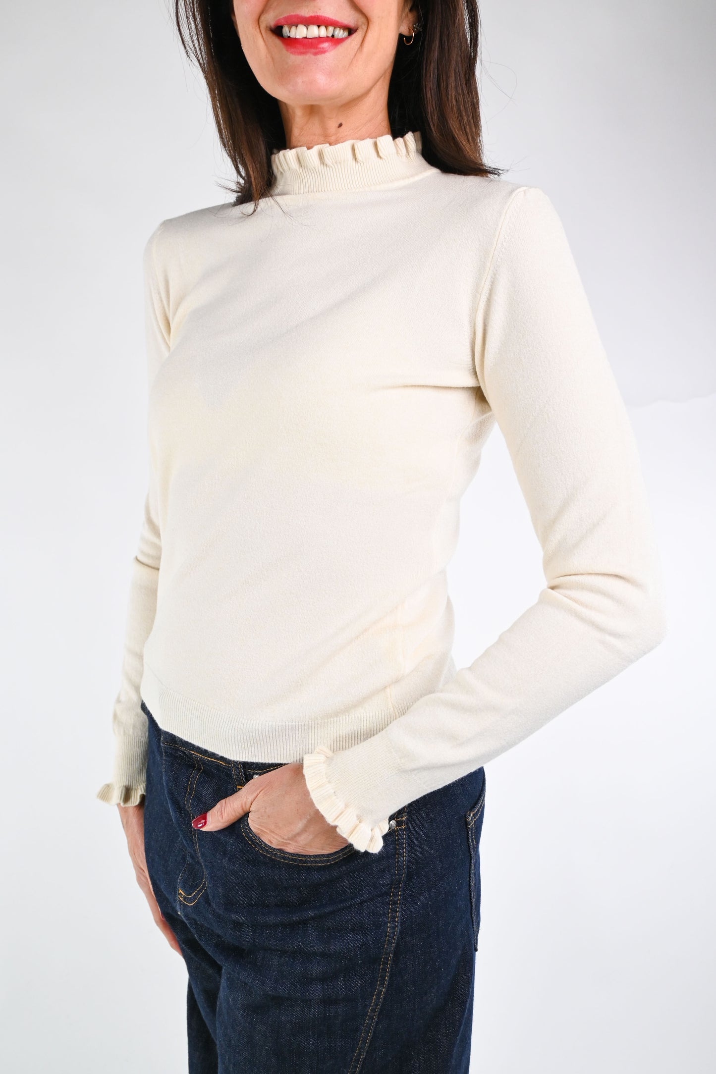 Maglia collo lupetto con rouges su collo e polsini, elasticizzata, color panna