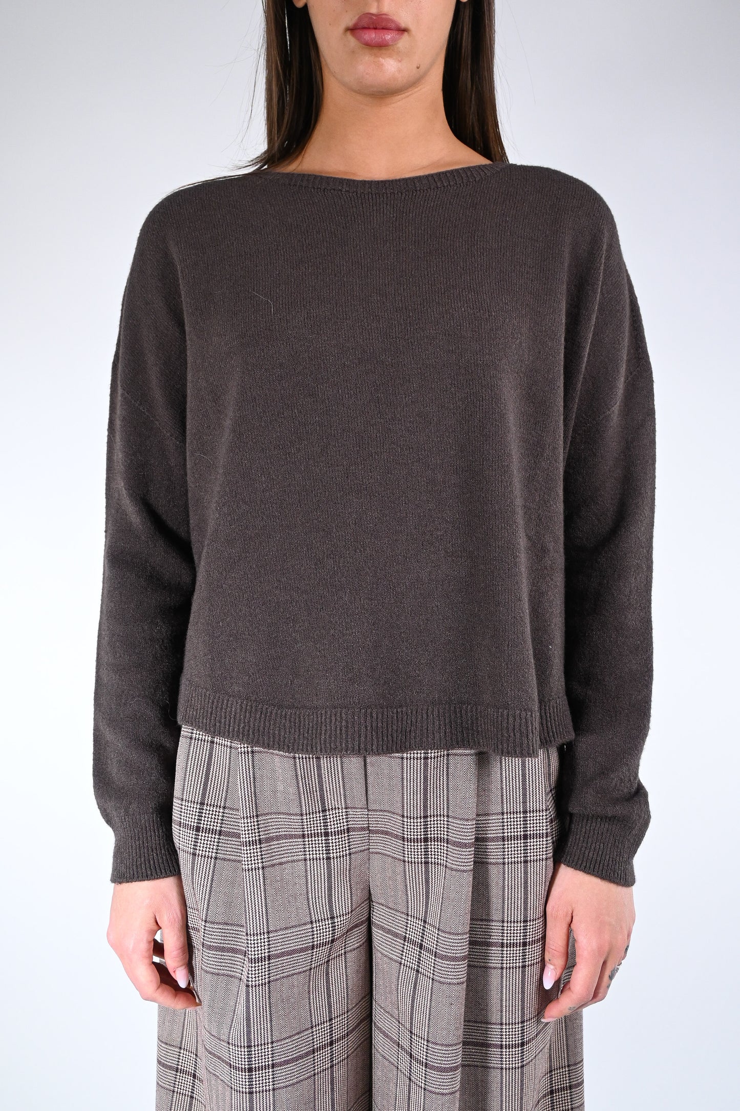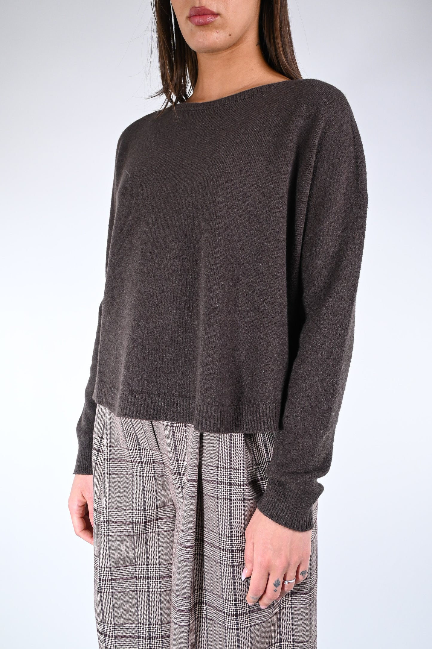 Prezzo normale €29,50Maglia over a scatola scollo barchetta, più corta davanti, elasticizzata, con spacchetti, color cacao