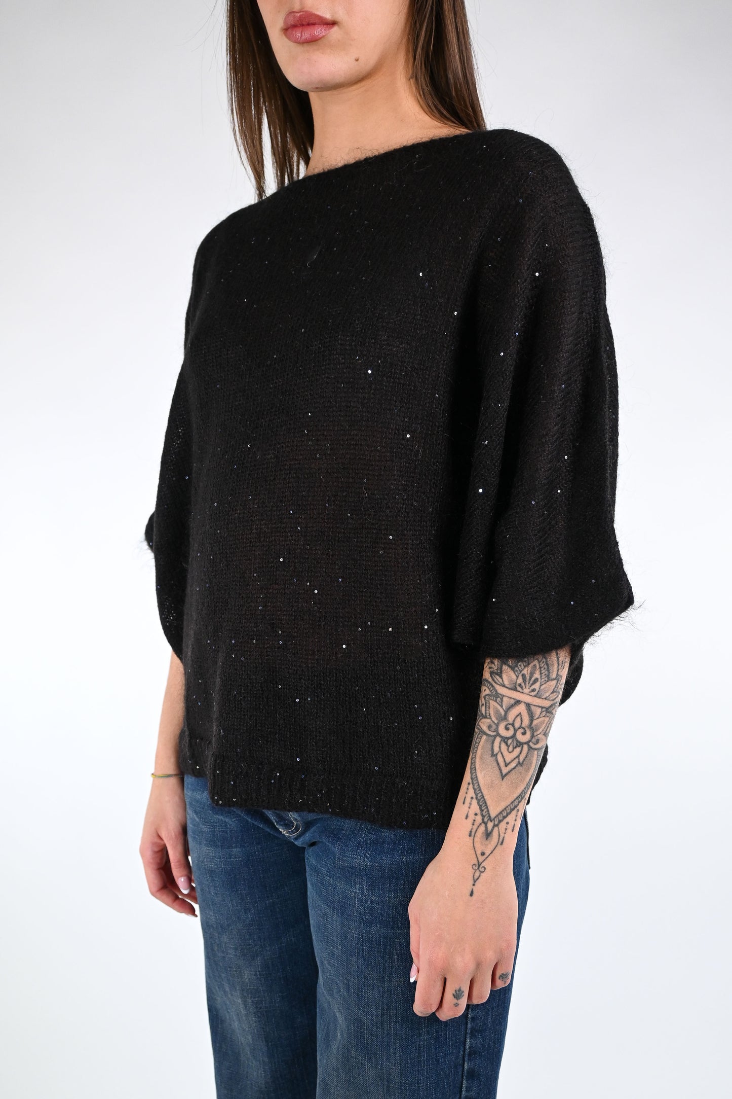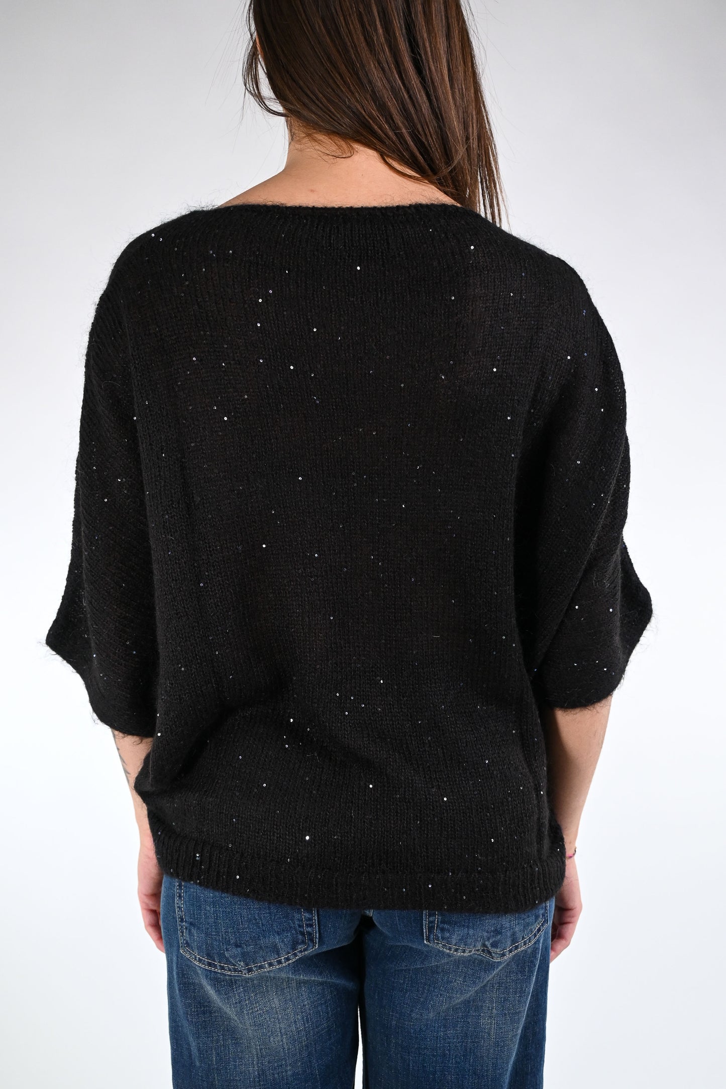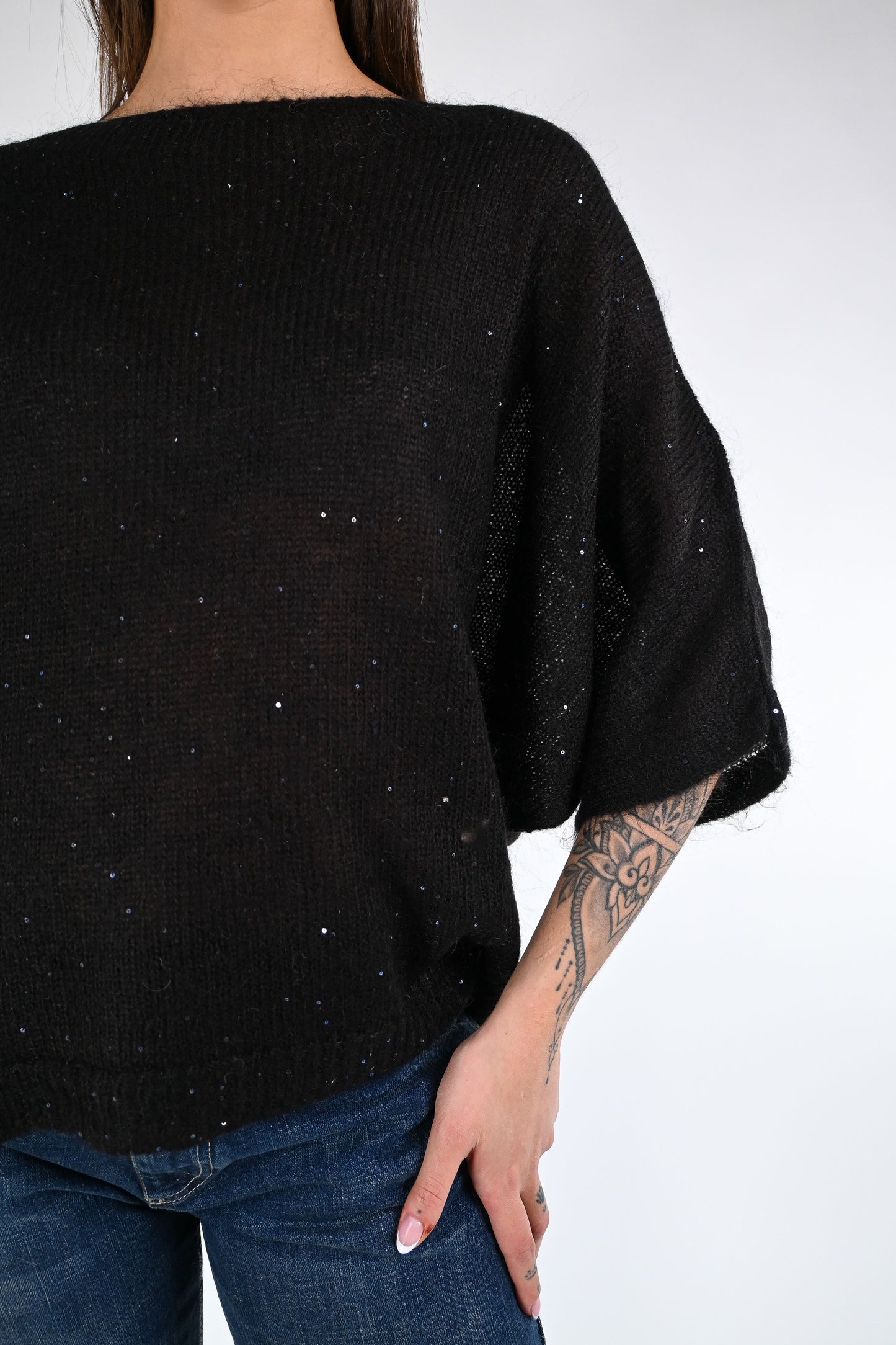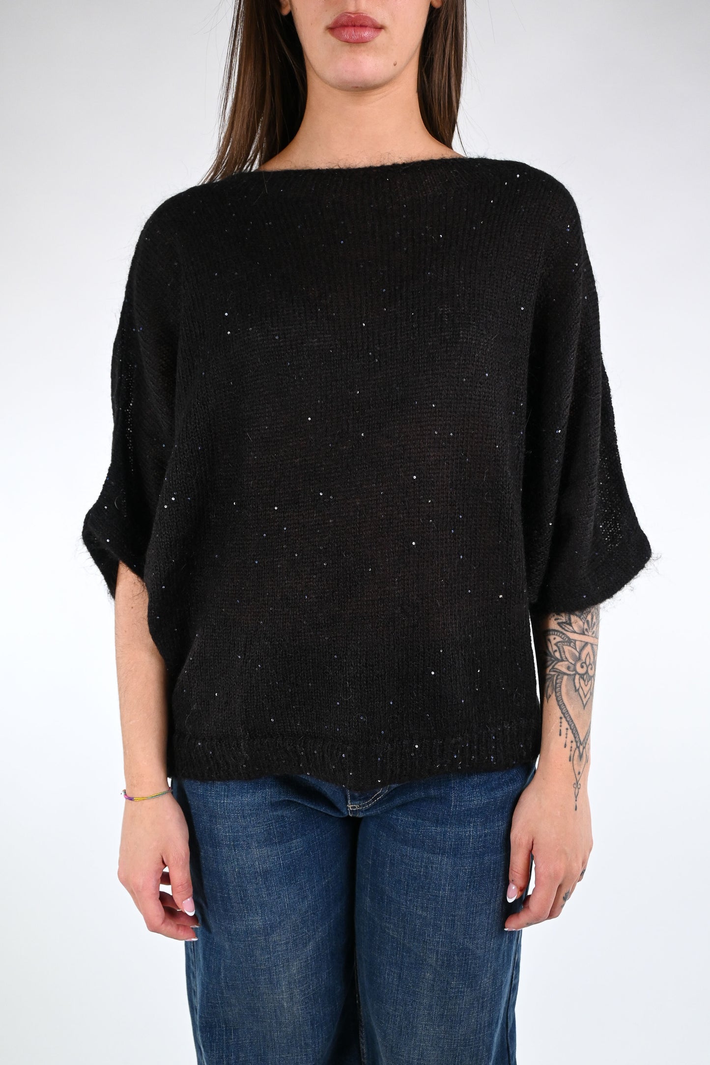 Maglia scollo barchetta, con manica pipistrello, in materiale superfine, con micropailletes, colore Nero.