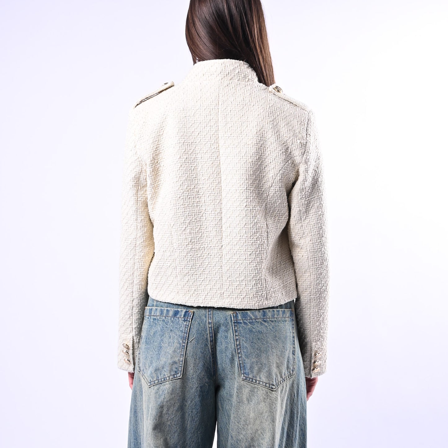 Giacca Chanel in tonalità panna con bottoni dorati applicati e fodera interna, dal taglio rilassato che resta volutamente aperta. Un capo versatile che combina eleganza classica e comfort contemporaneo, perfetto per stratificare con stile.