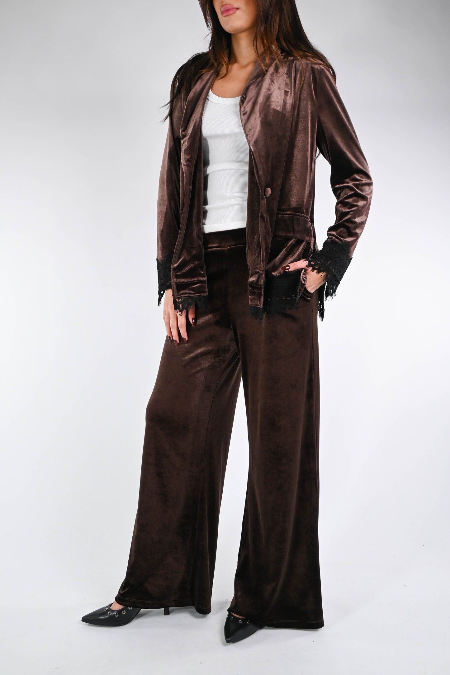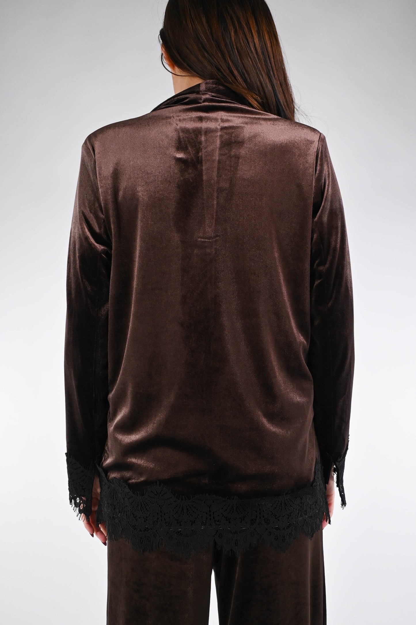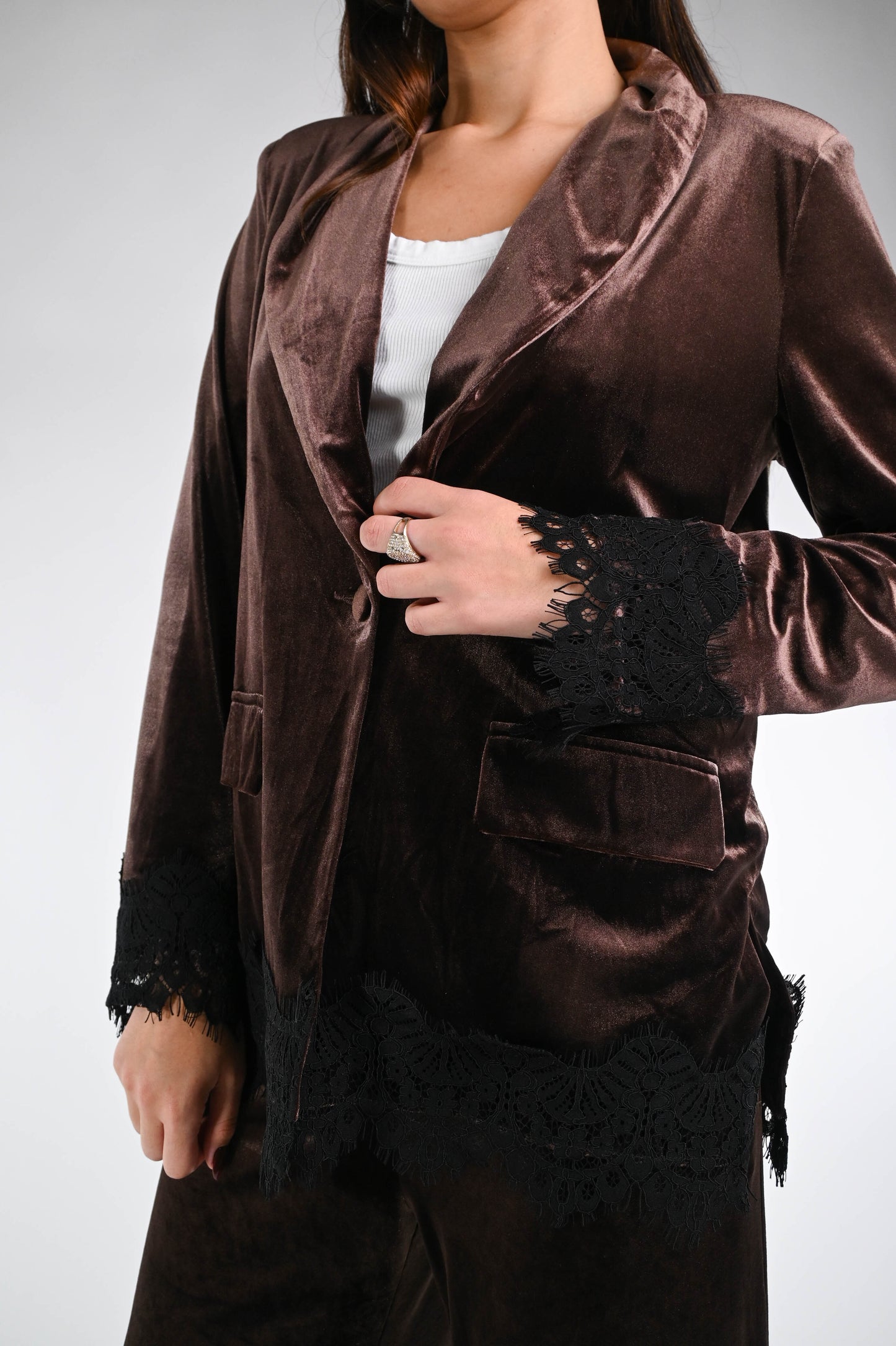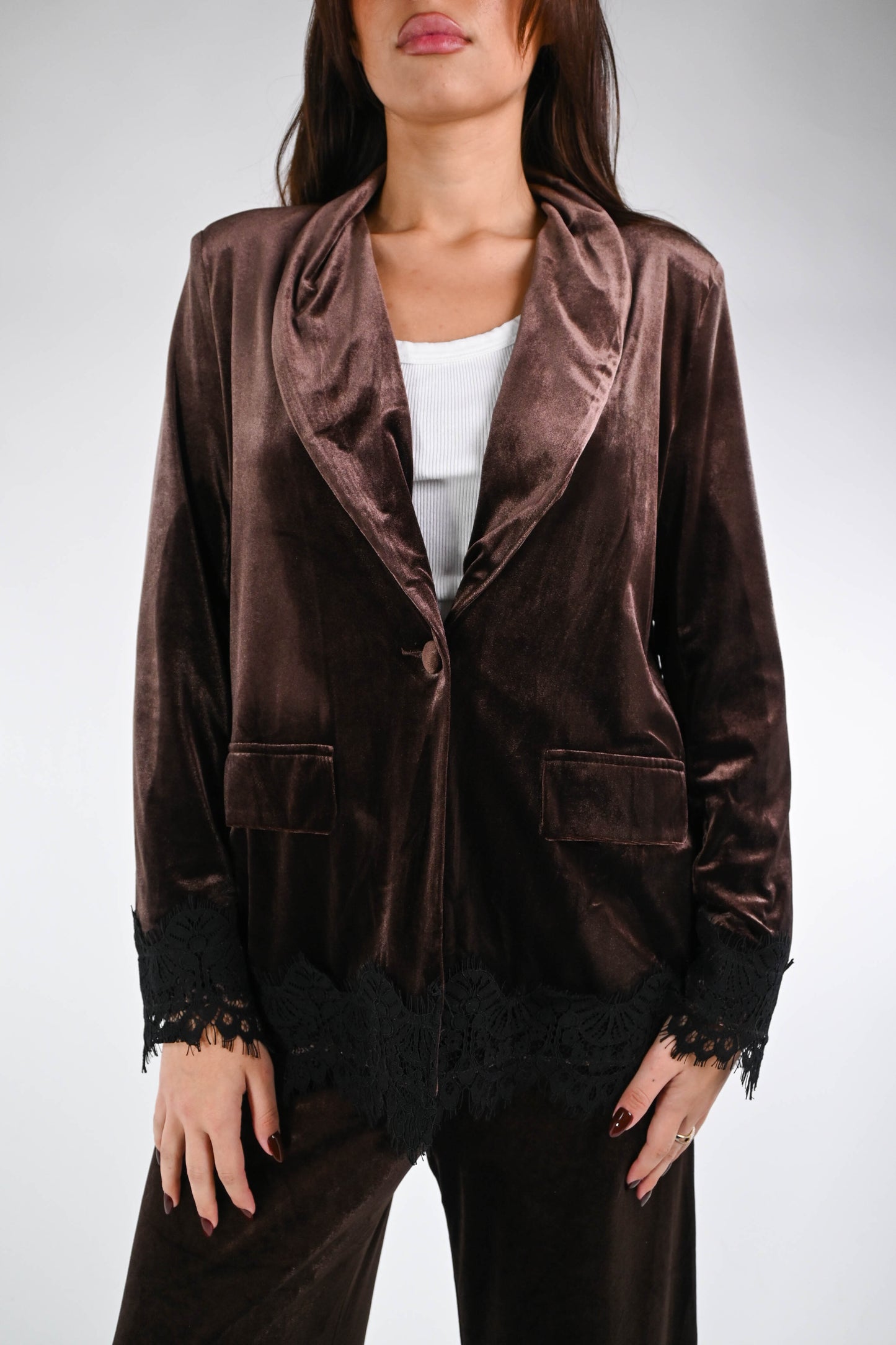 Giacca in morbido velluto liscio con pizzo su maniche e fondo, con leggera fodera, color moro