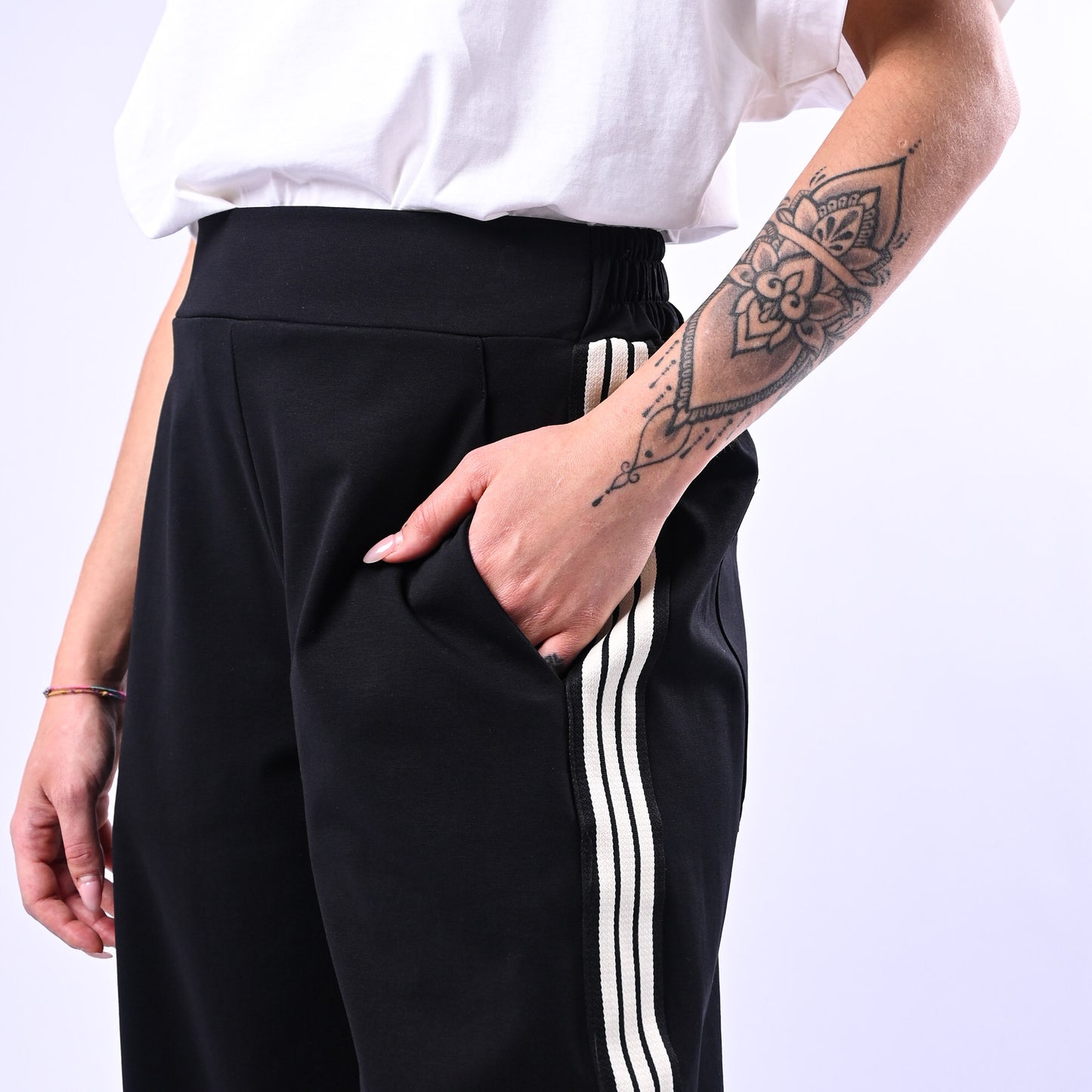 Pantalone balloon in punto Milano con banda laterale e mezzo elastico in vita, dotato di tasche funzionali. Perfetto da indossare singolarmente o abbinato alla felpa coordinata della collezione.