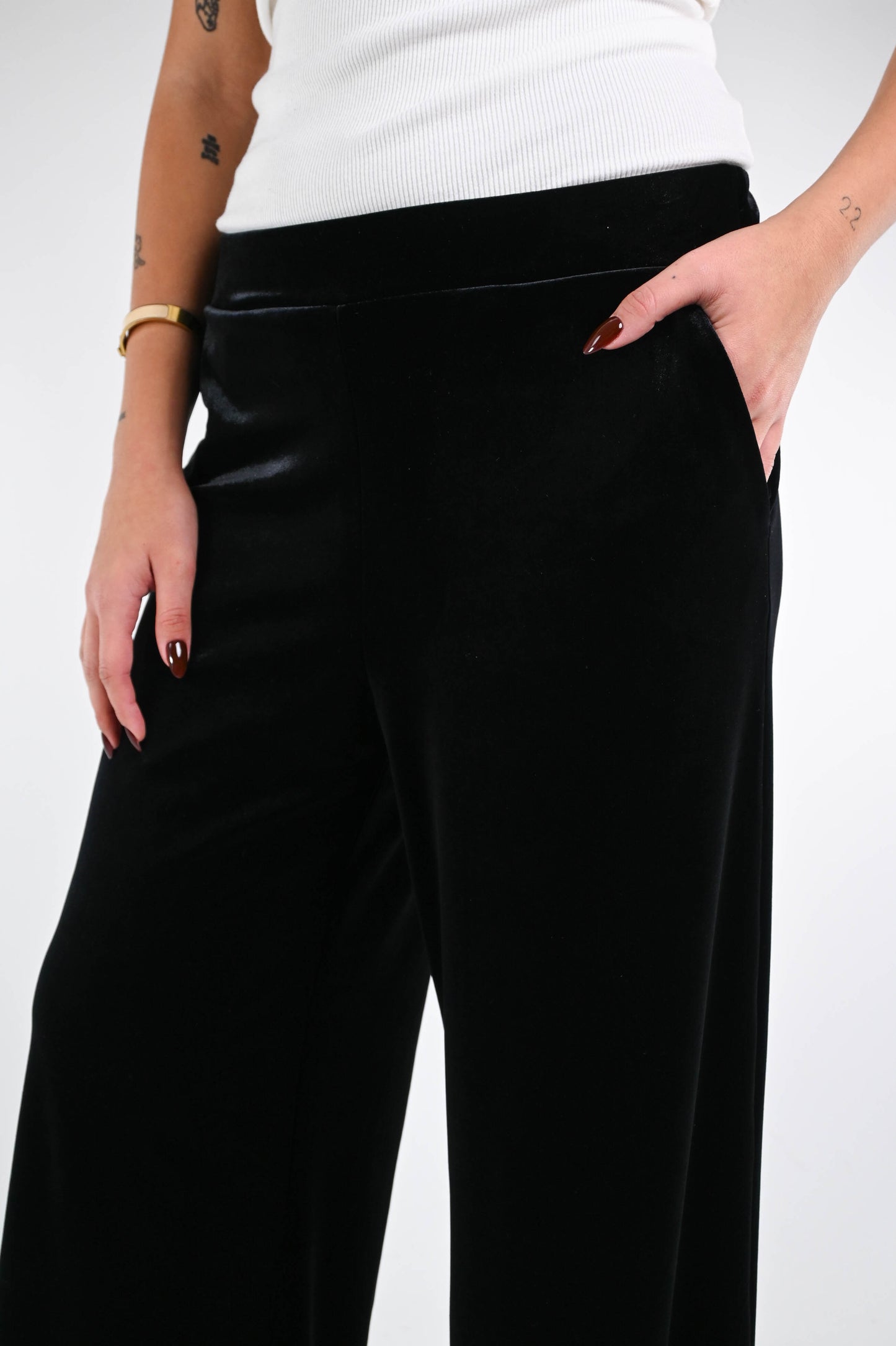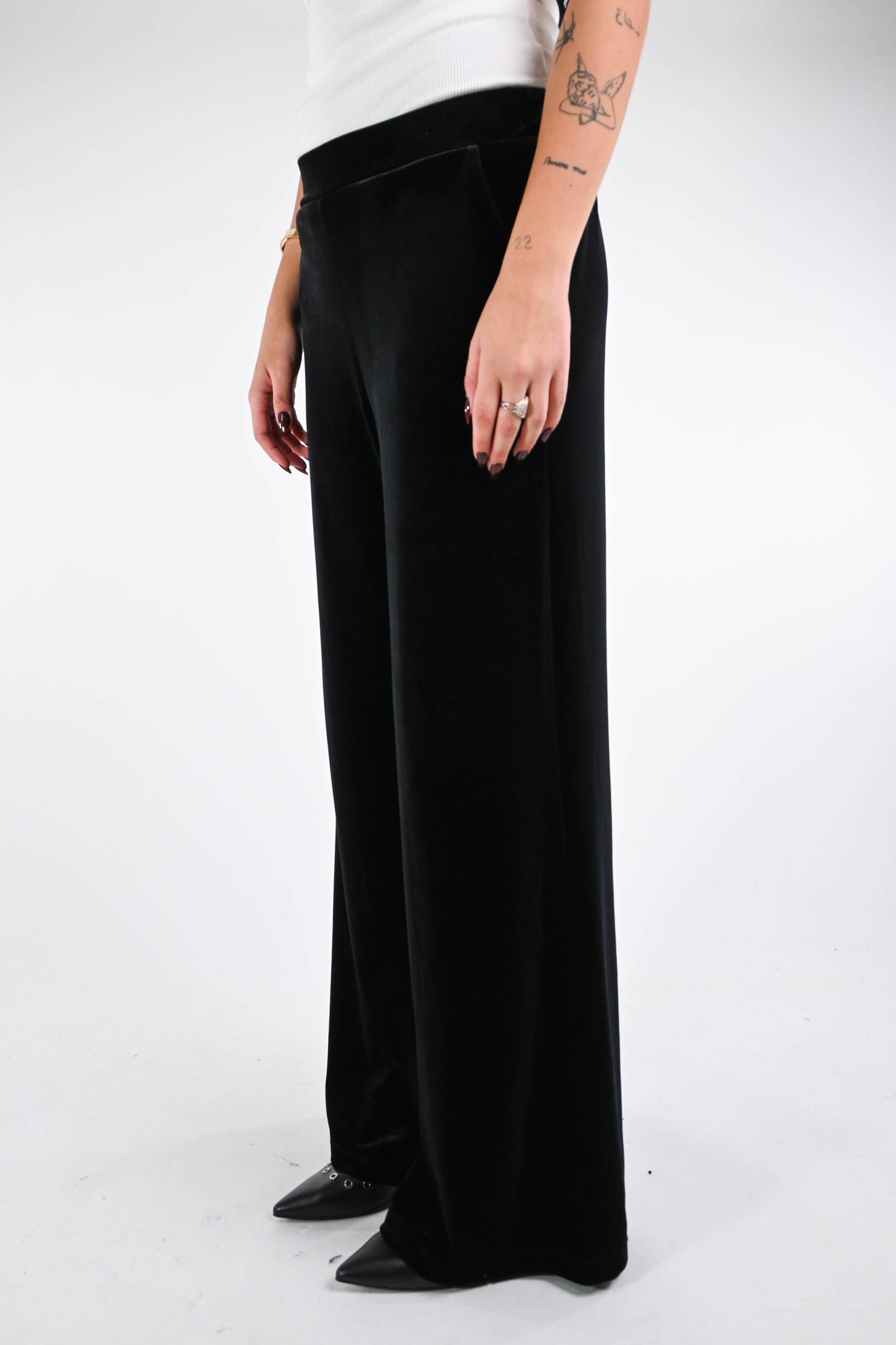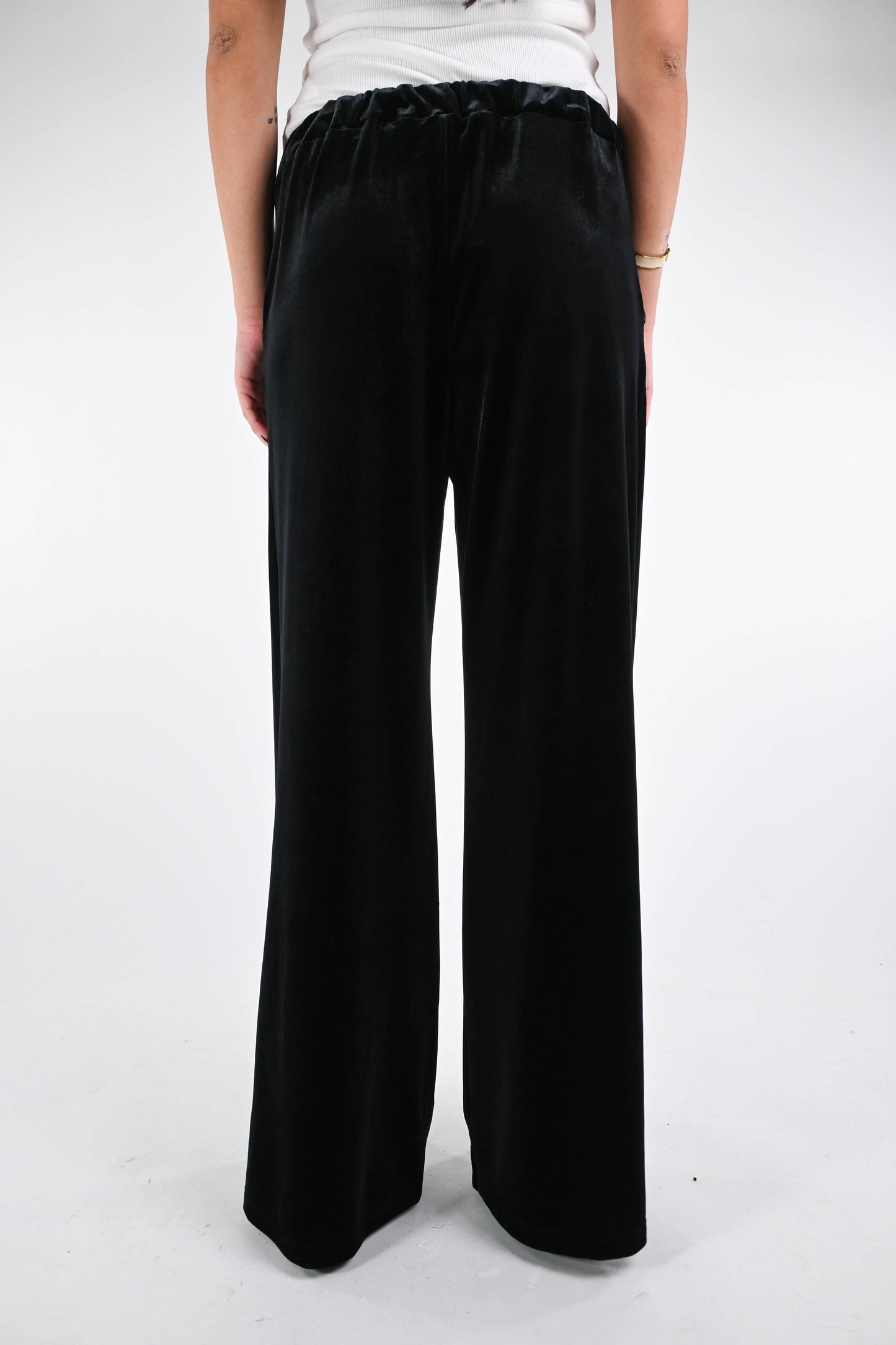 Pantalone fluido a palazzo in morbido velluto liscio, con tasche, con mezzo elastico in vita, color nero