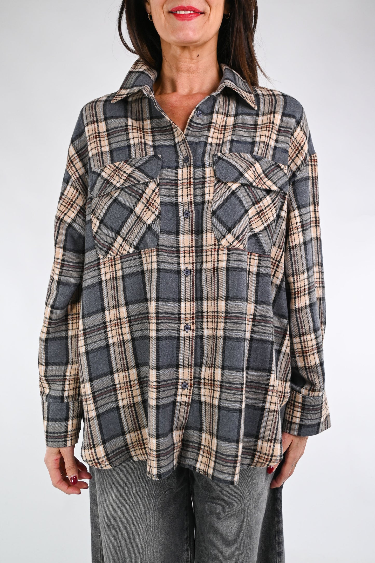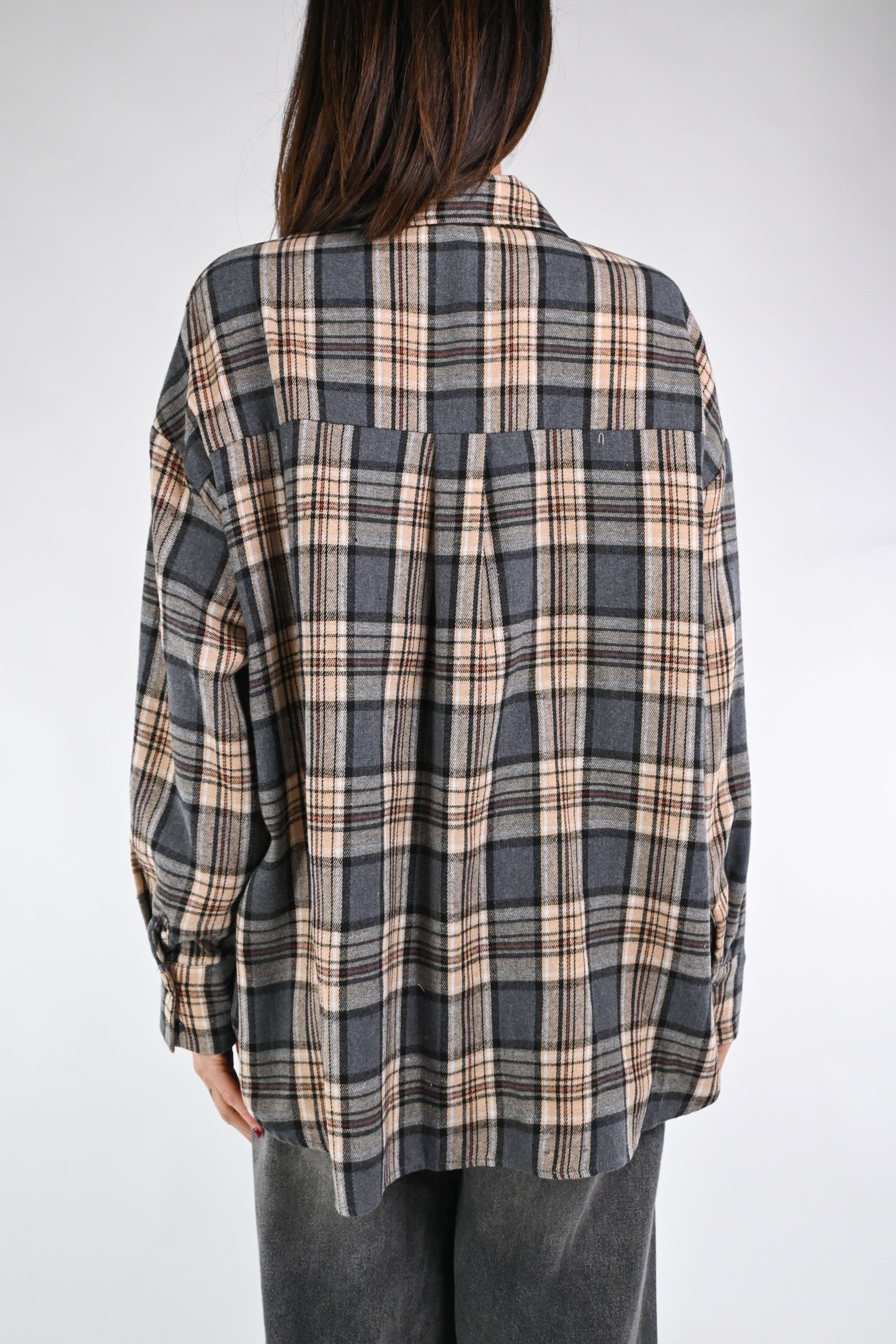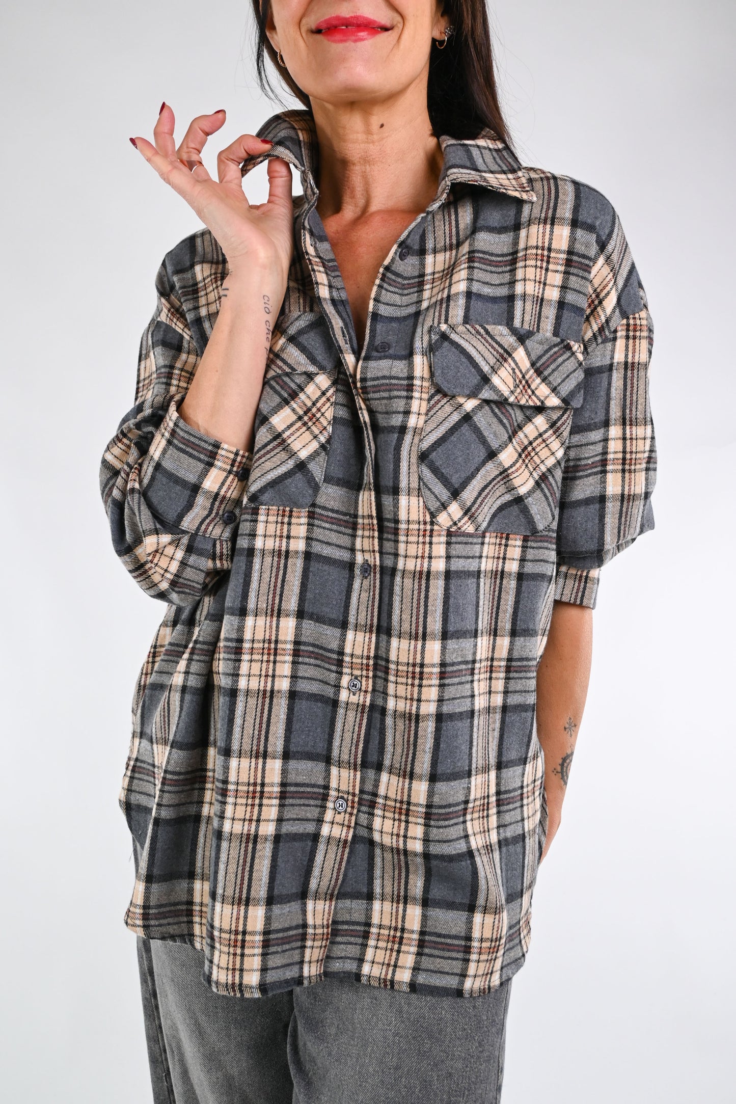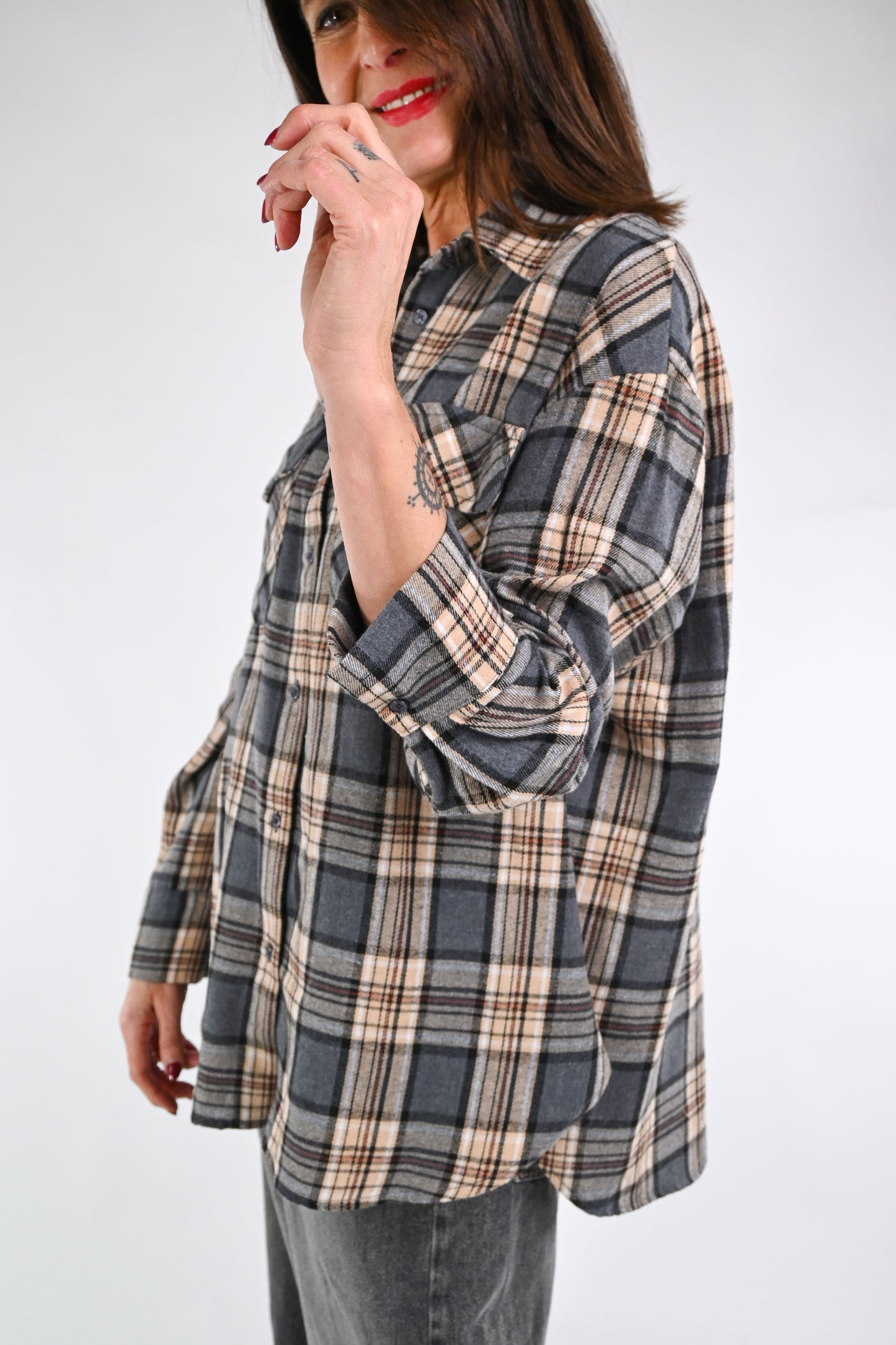 Camicia flanella fantasia scozzese, abbottonata fino in fondo , colore cammello/grigio