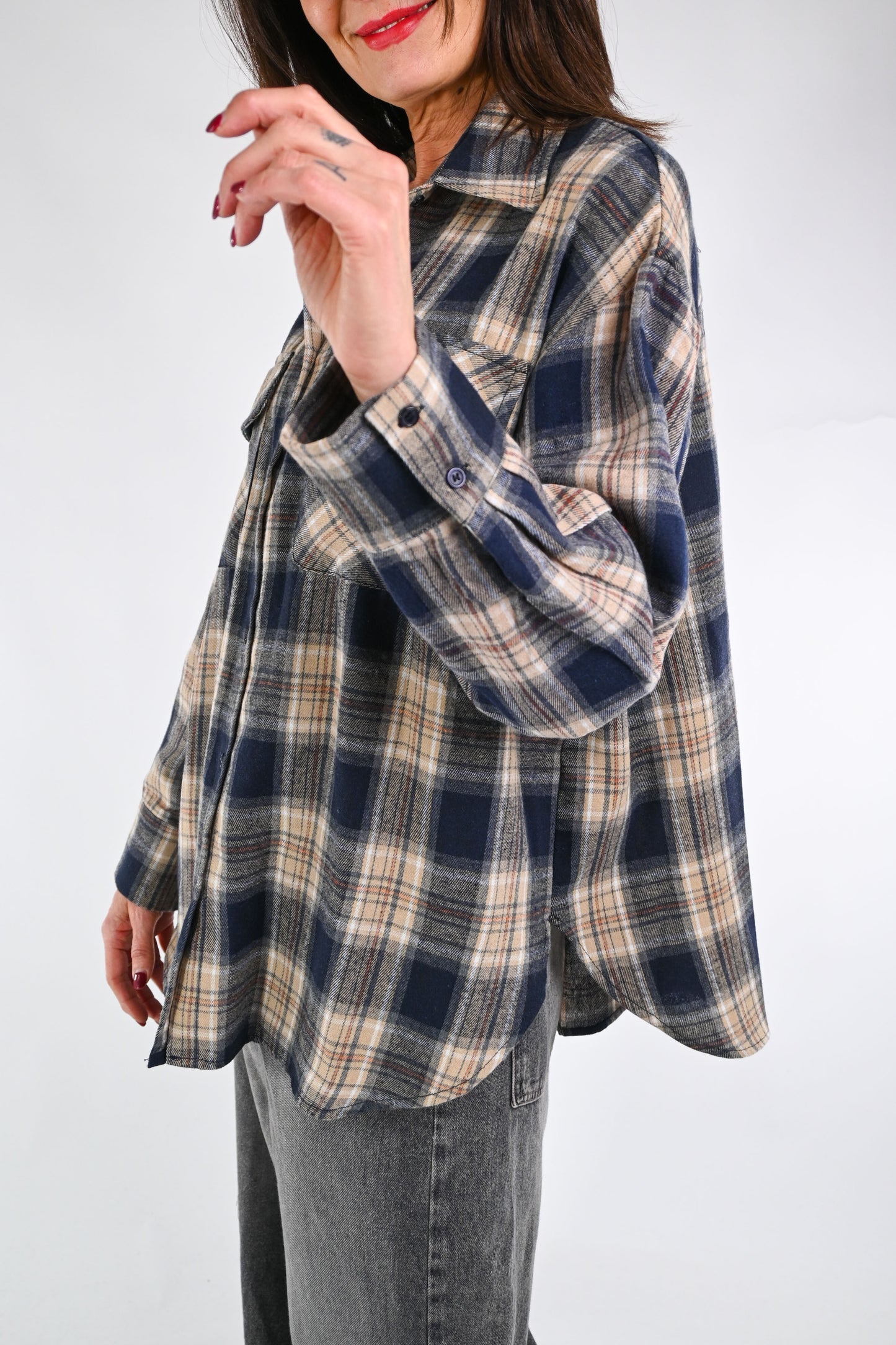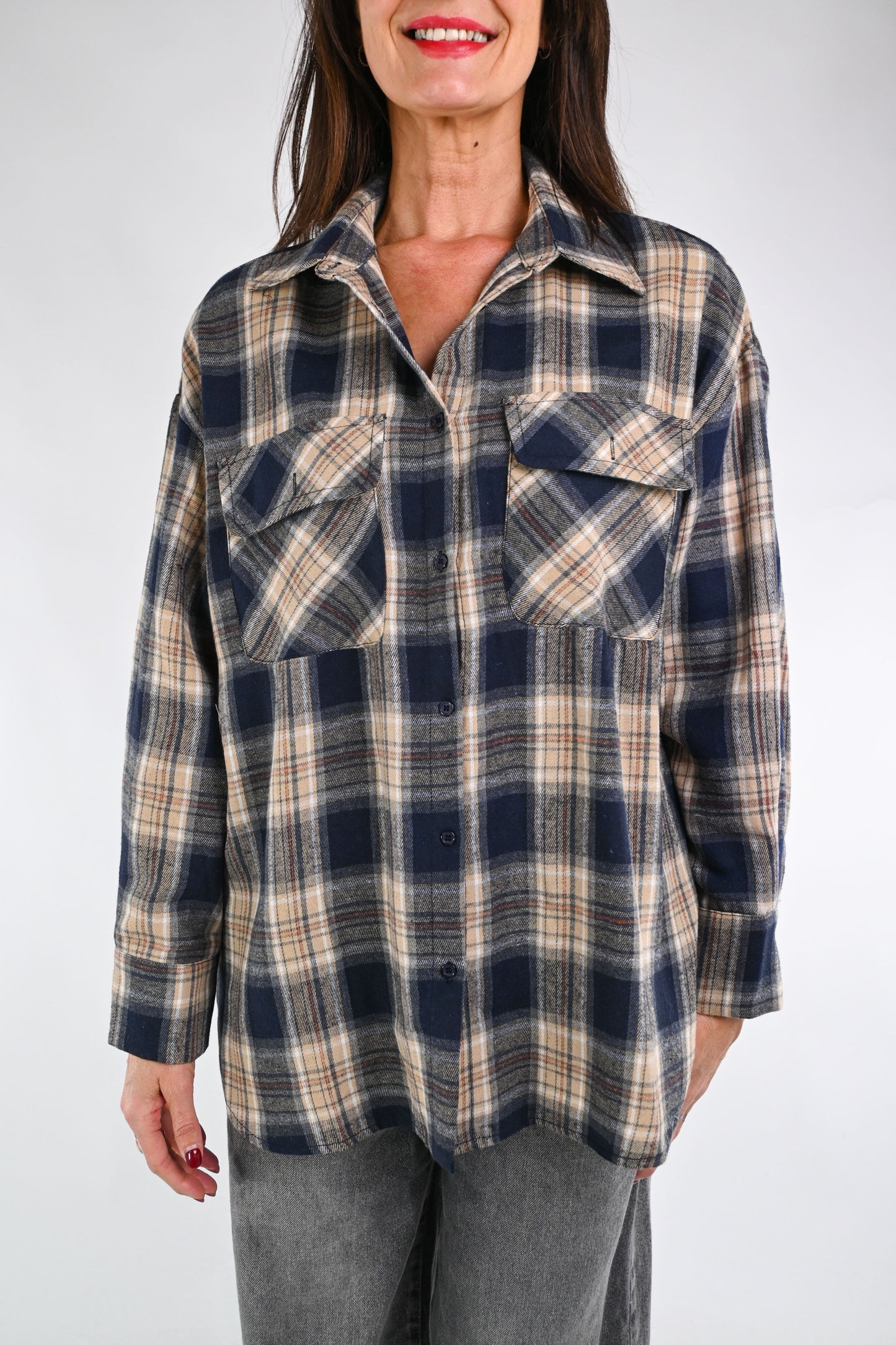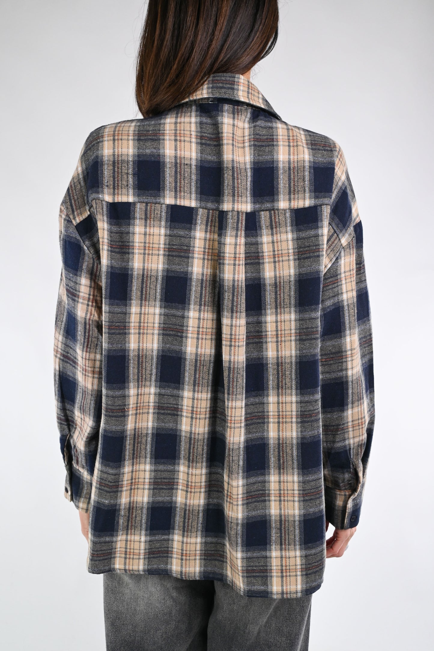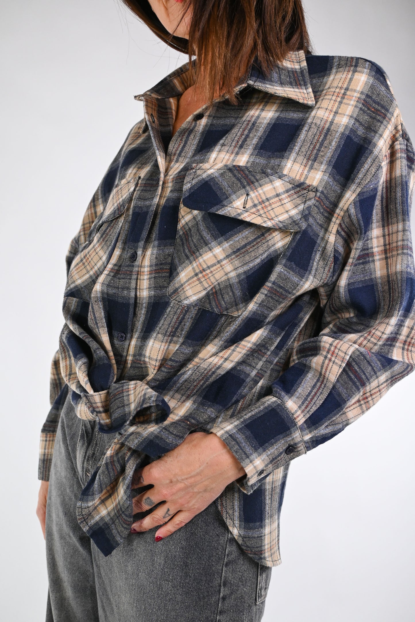 Camicia flanella fantasia scozzese, abbottonata fino in fondo , colore blu/cammello