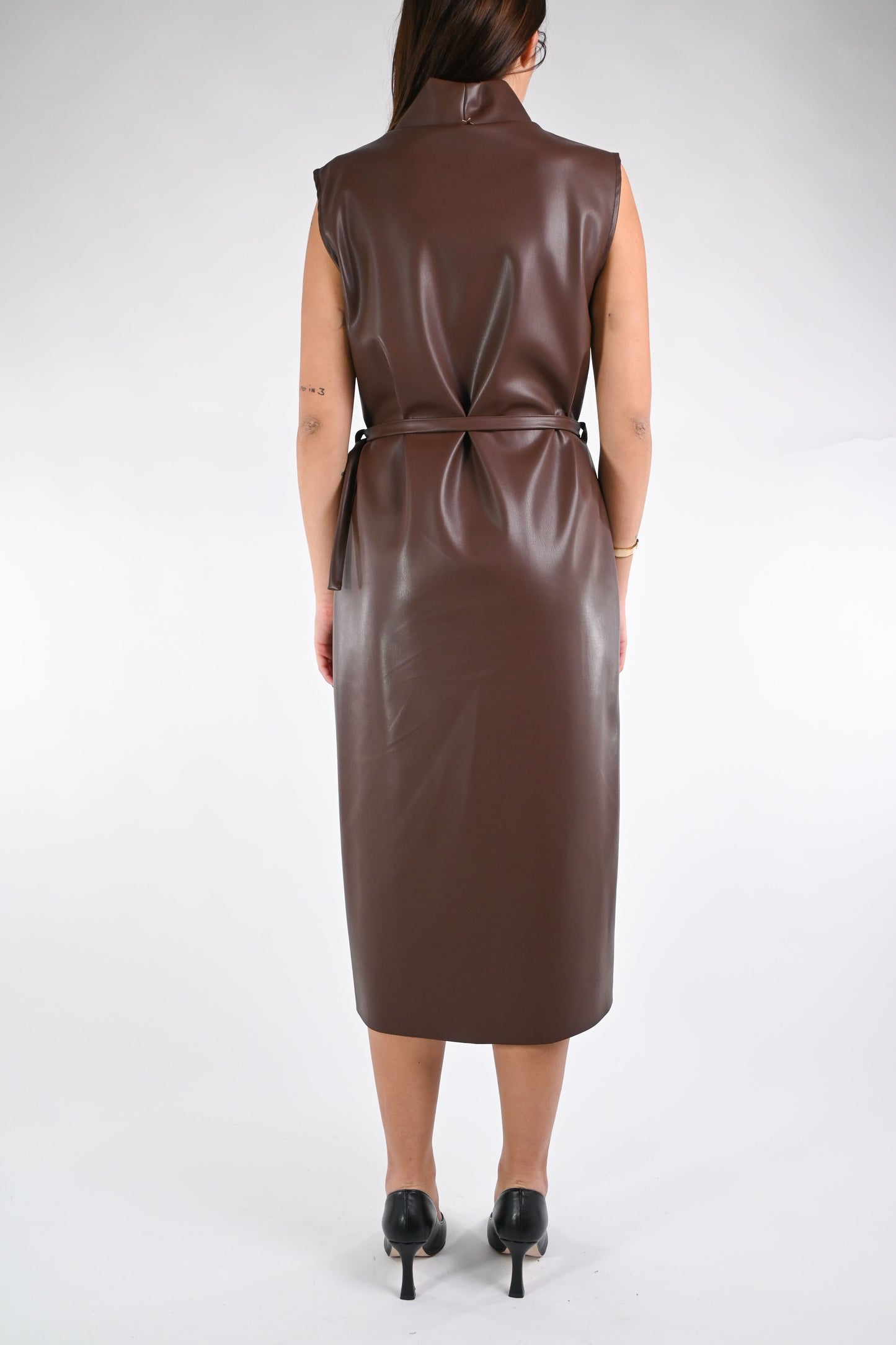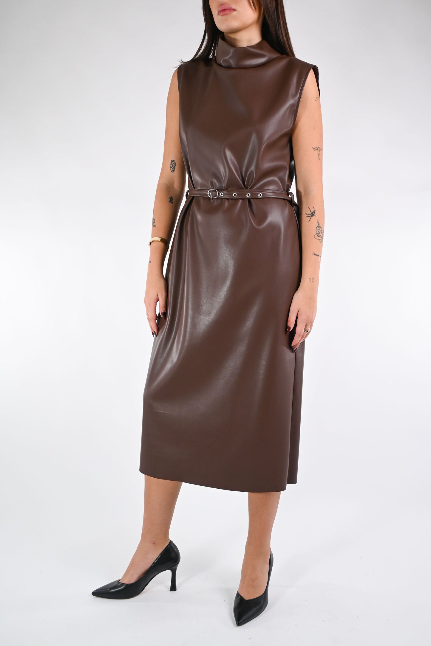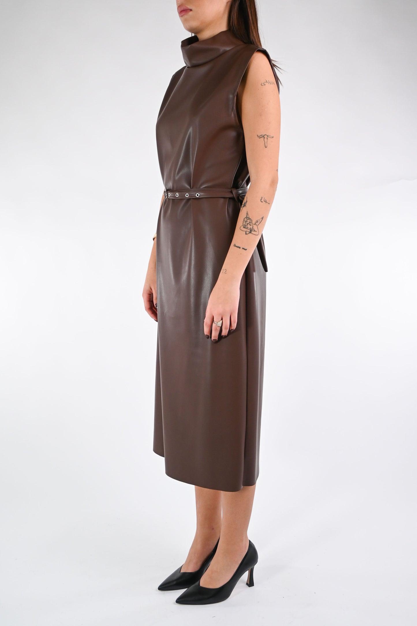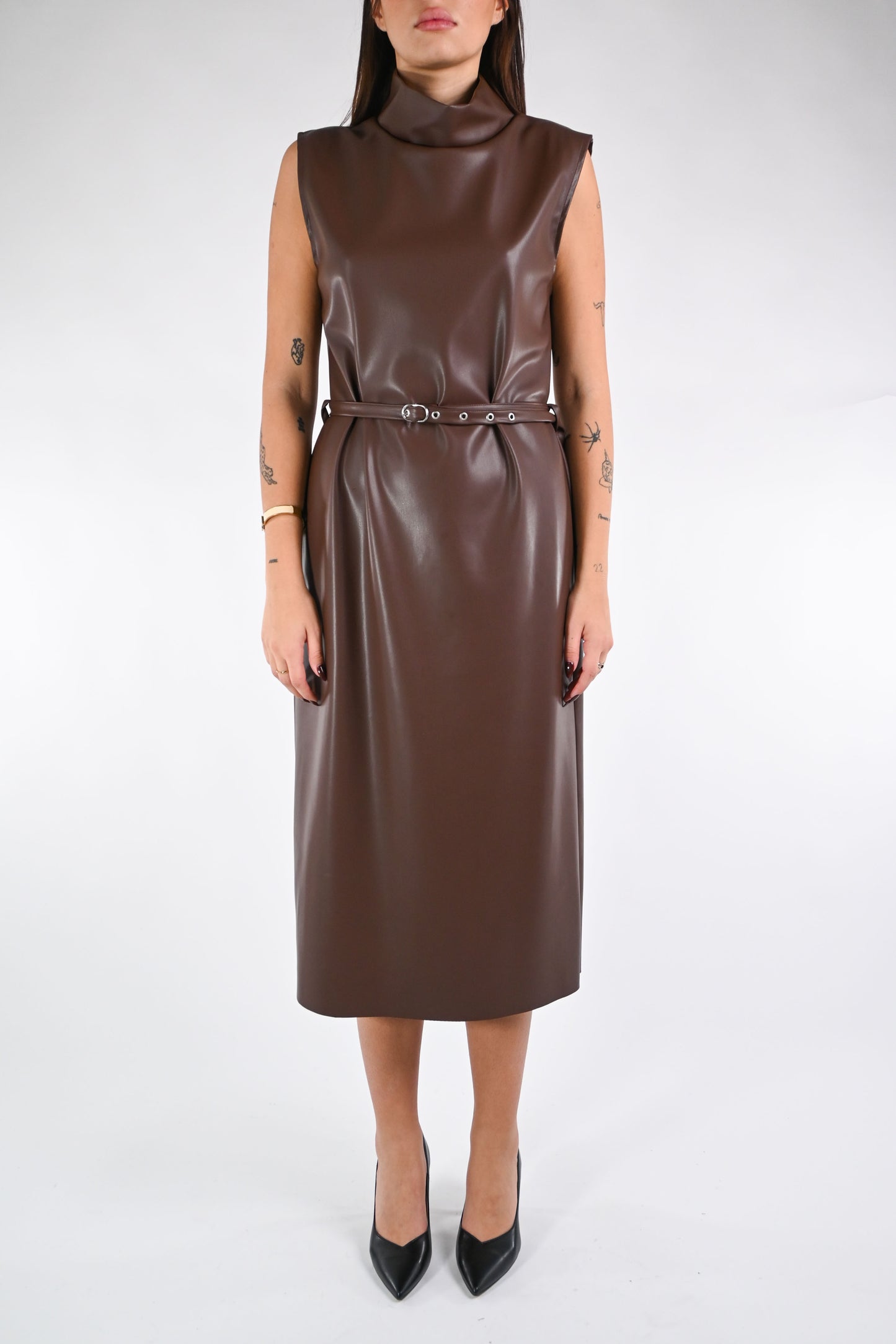 Abito lungo collo alto in ecopelle, senza maniche, con cinturina abbinata, color cuioio