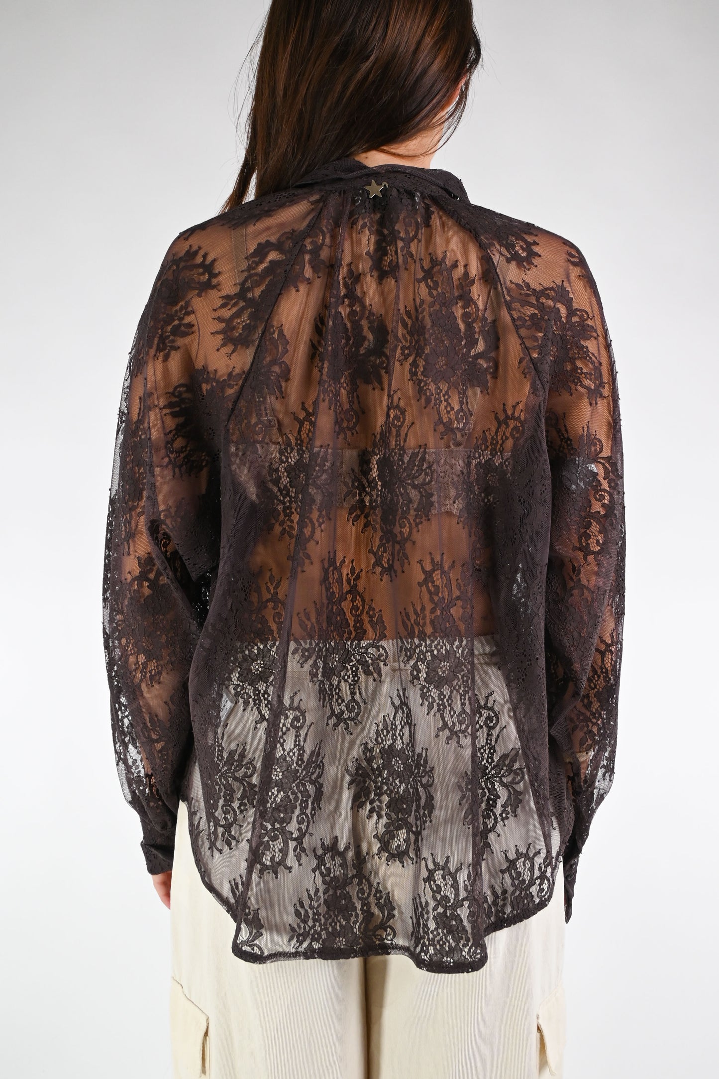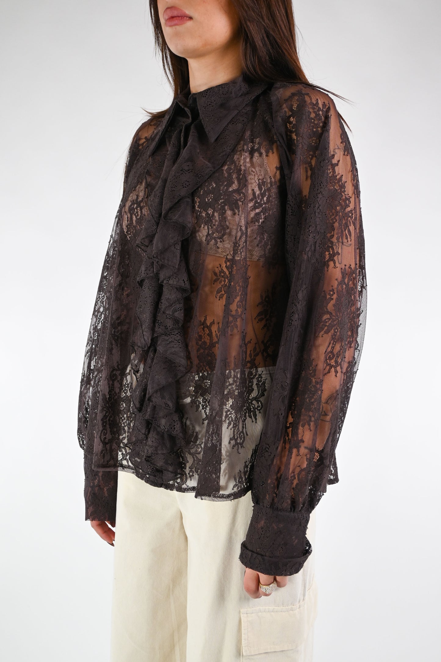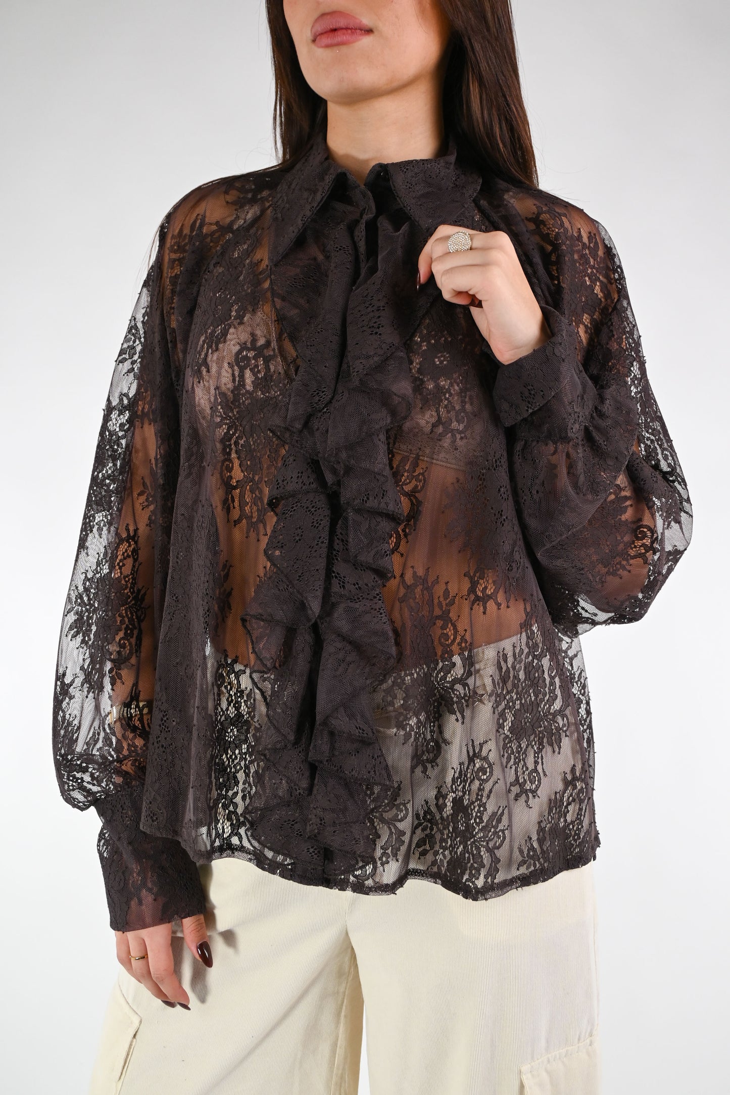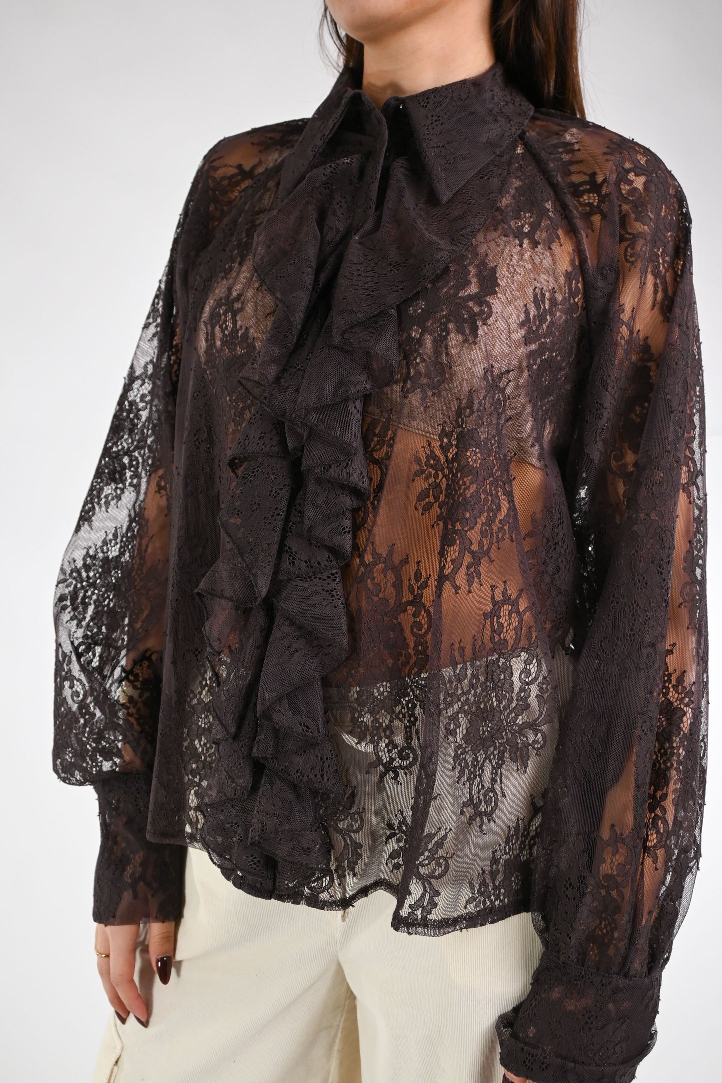 Camicia pizzo con volant, con colletto a punta, con manica a sbuffo, colore moro