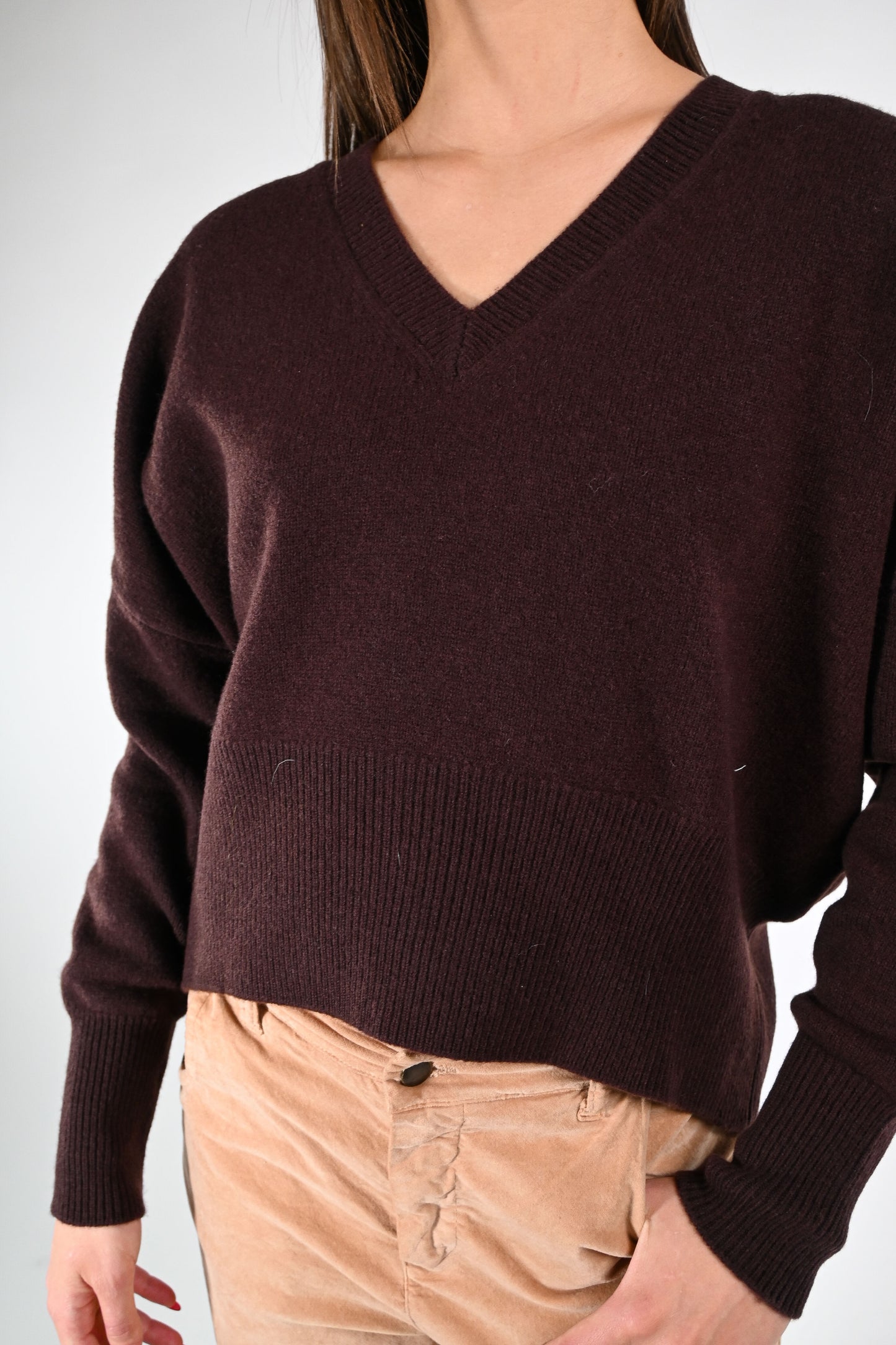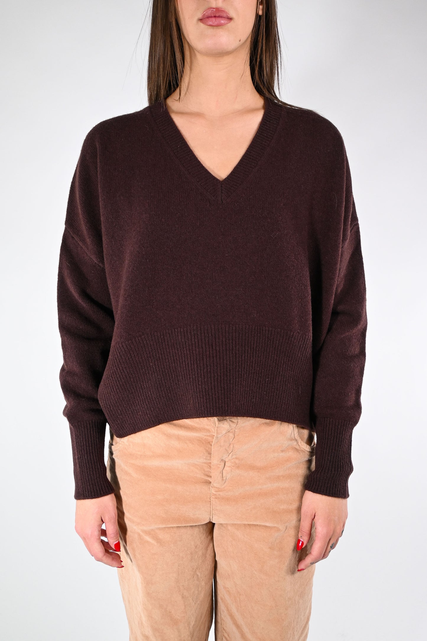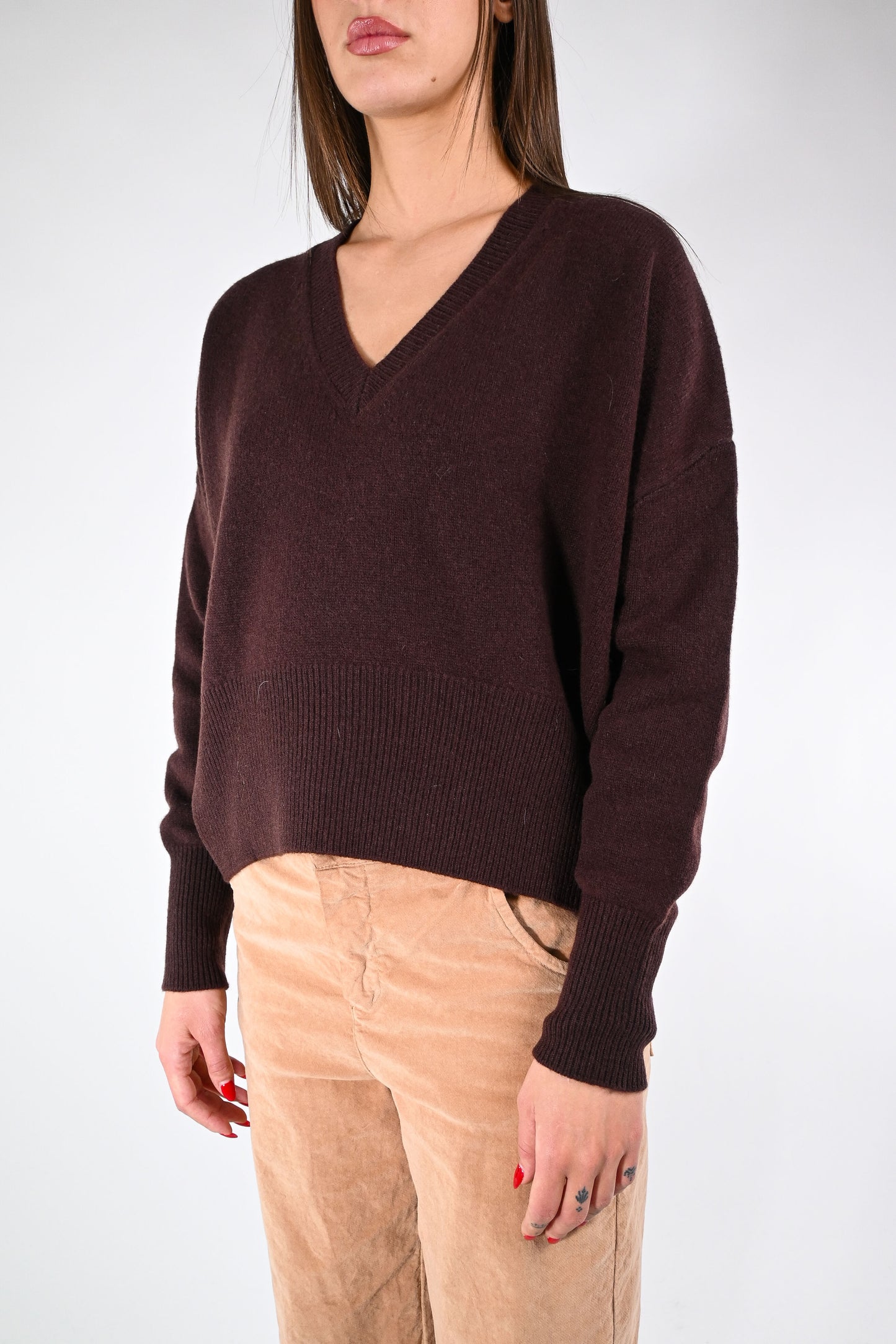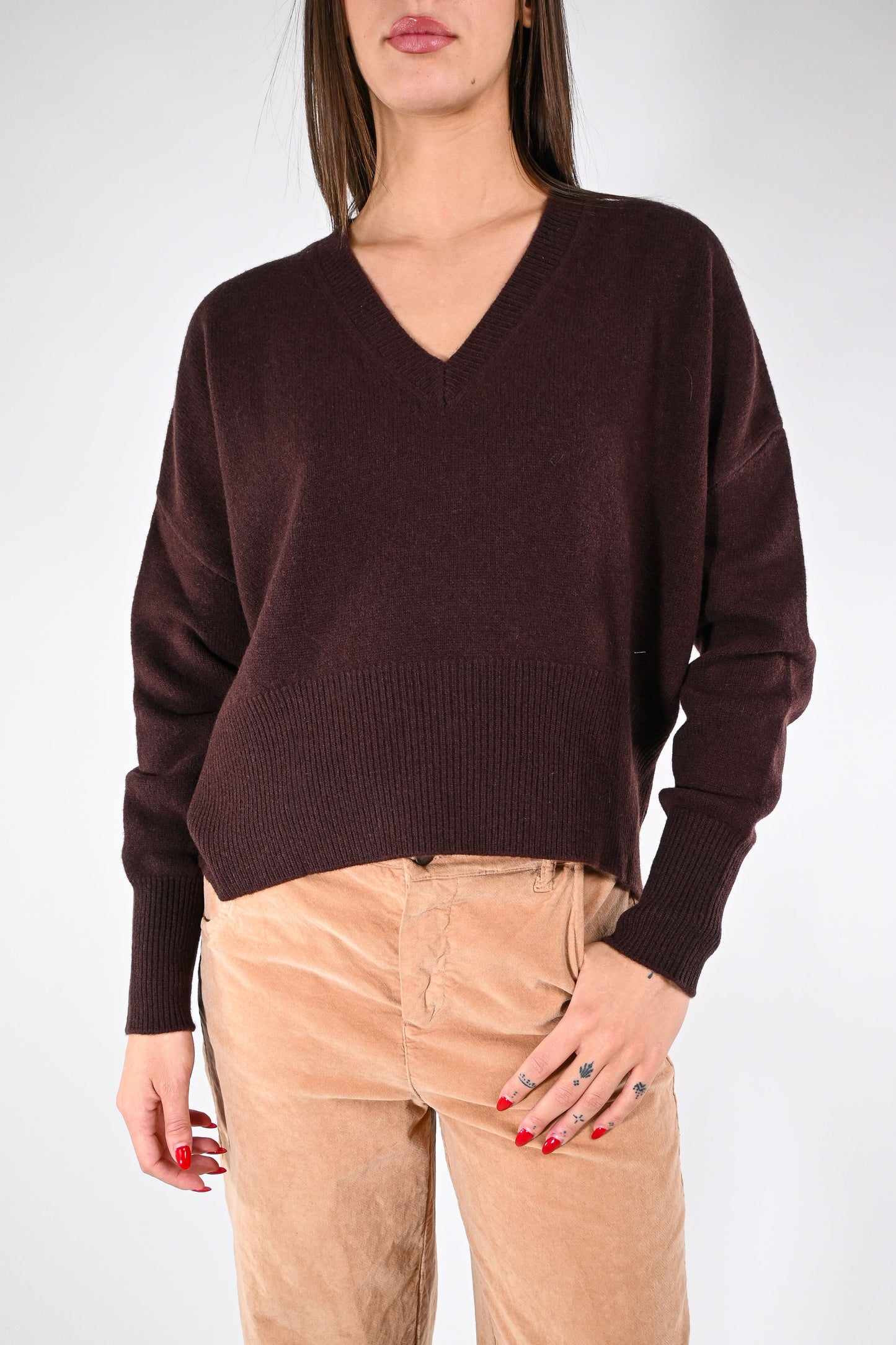 Maglia over a scatola scollo V , più corta davanti, colore moro