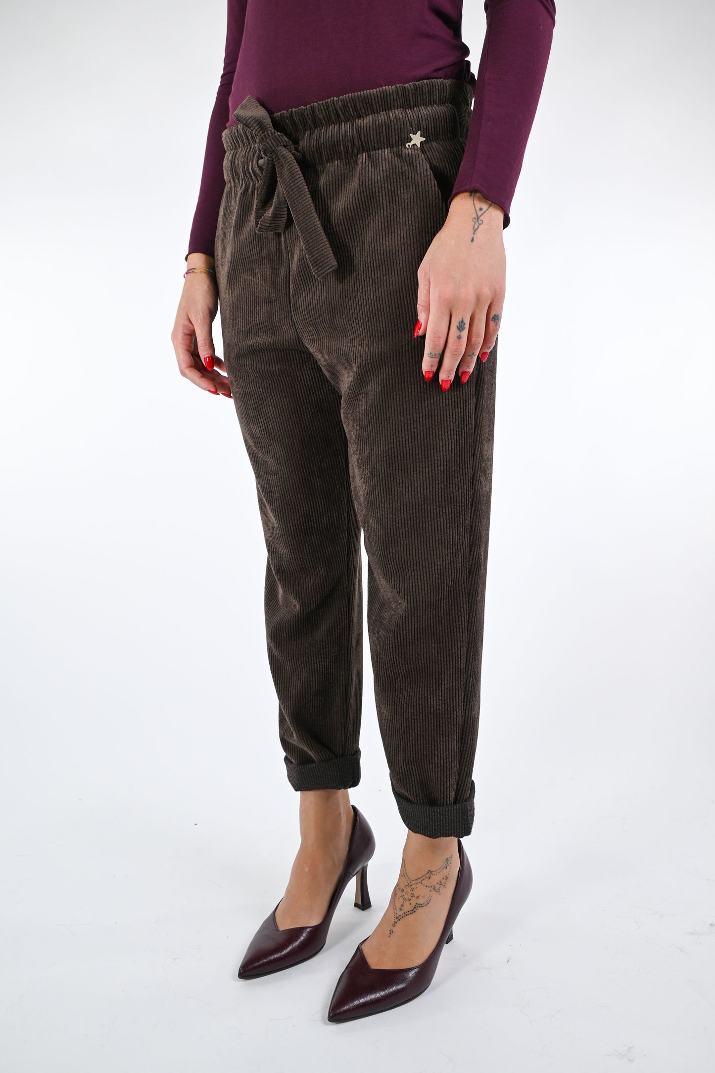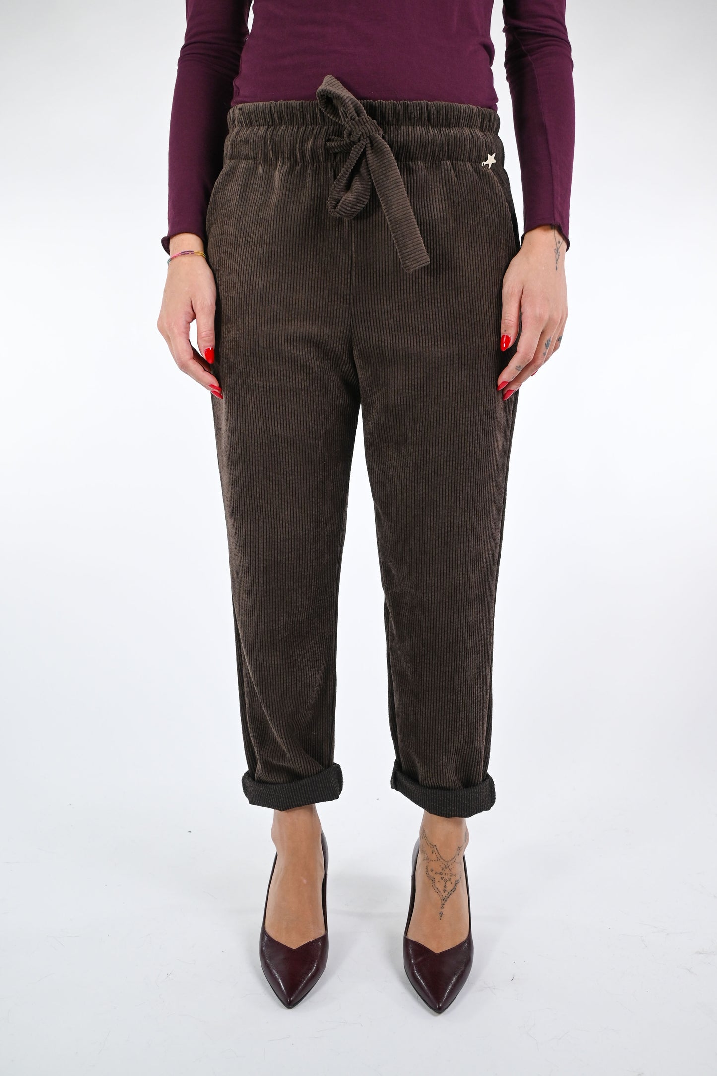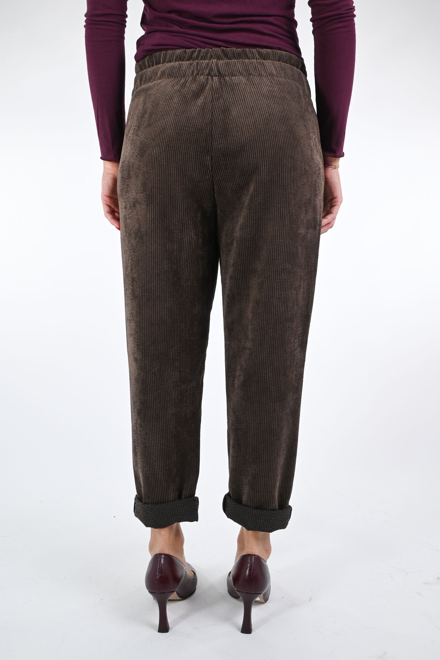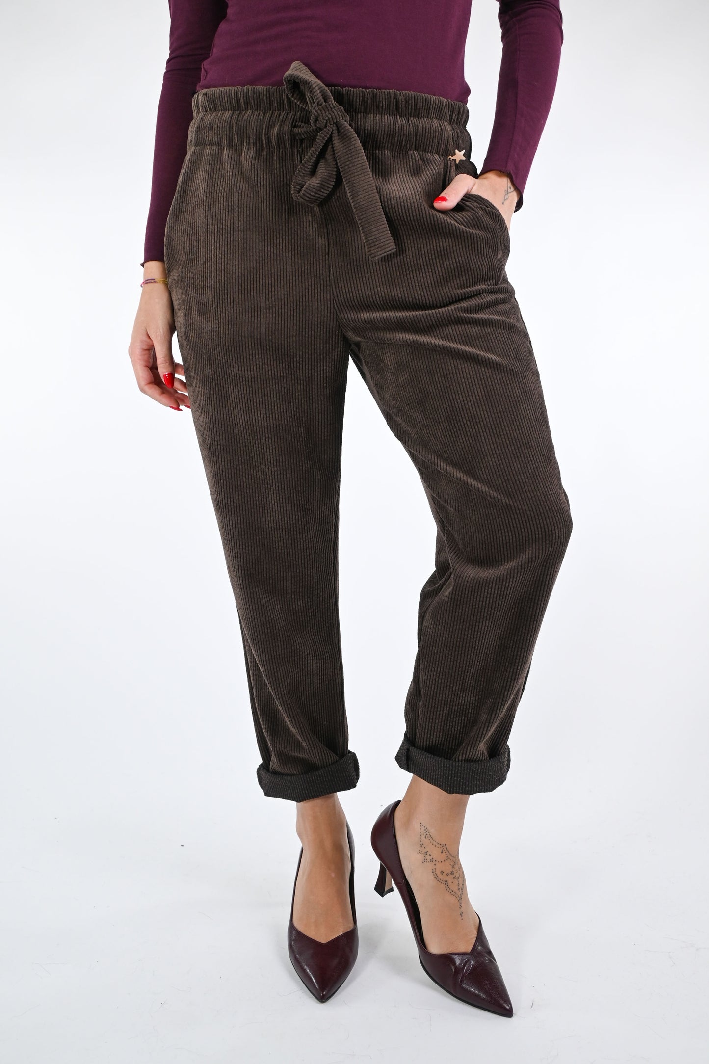 Pantalone in velluto a coste, con coulisse ed elastico in vita, con tasche, colore moro