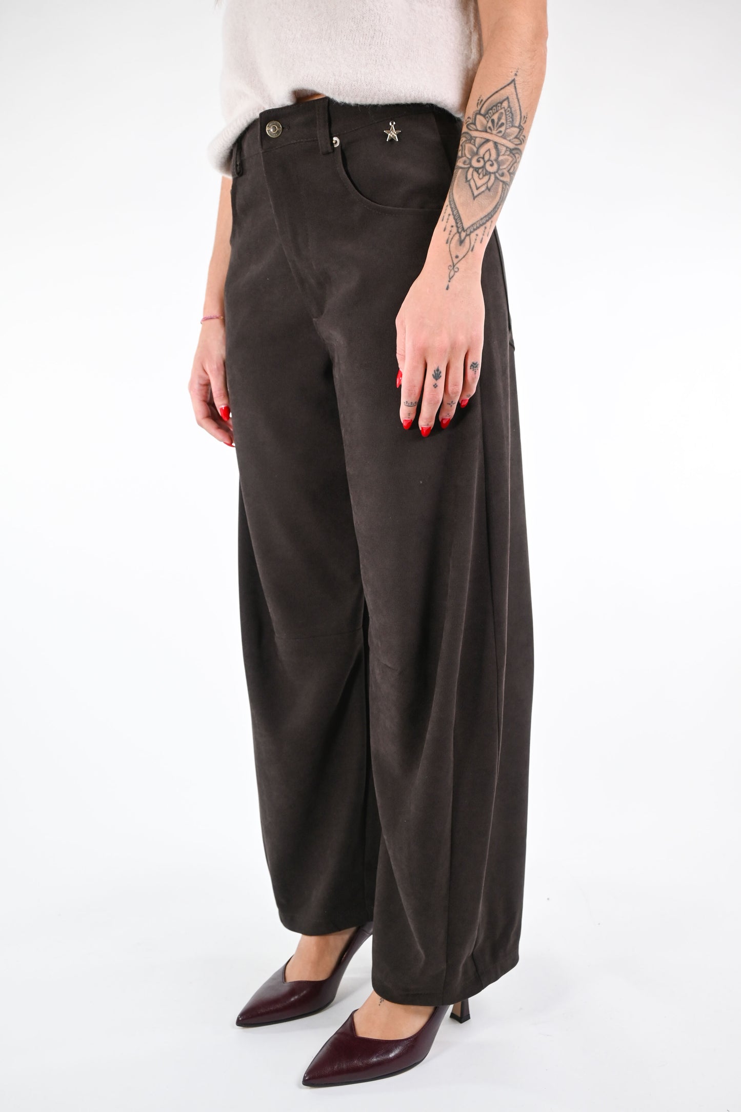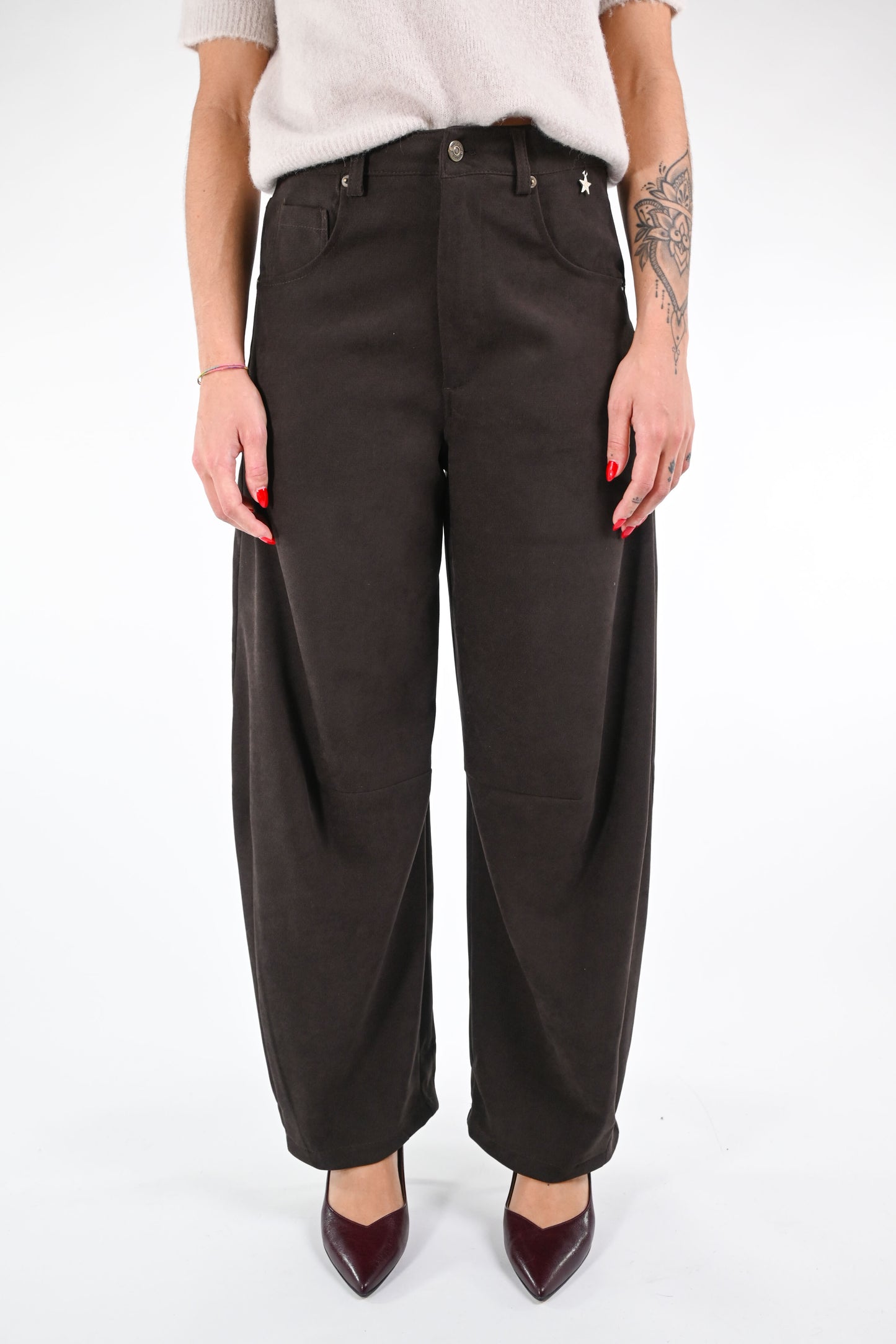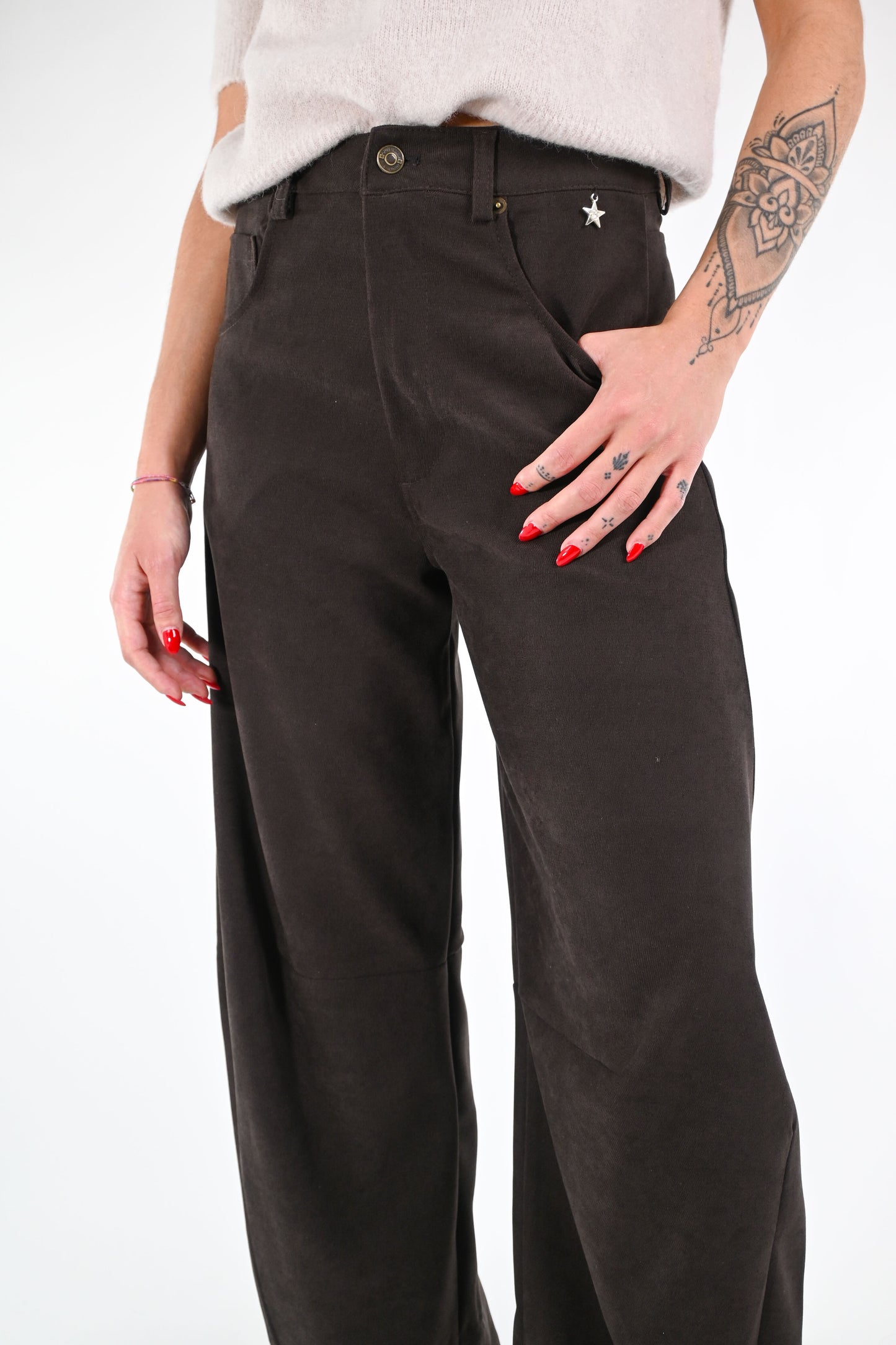 Pantalone modello Gaia in velluto liscio, con cucitura sulle ginocchia, colore caffè