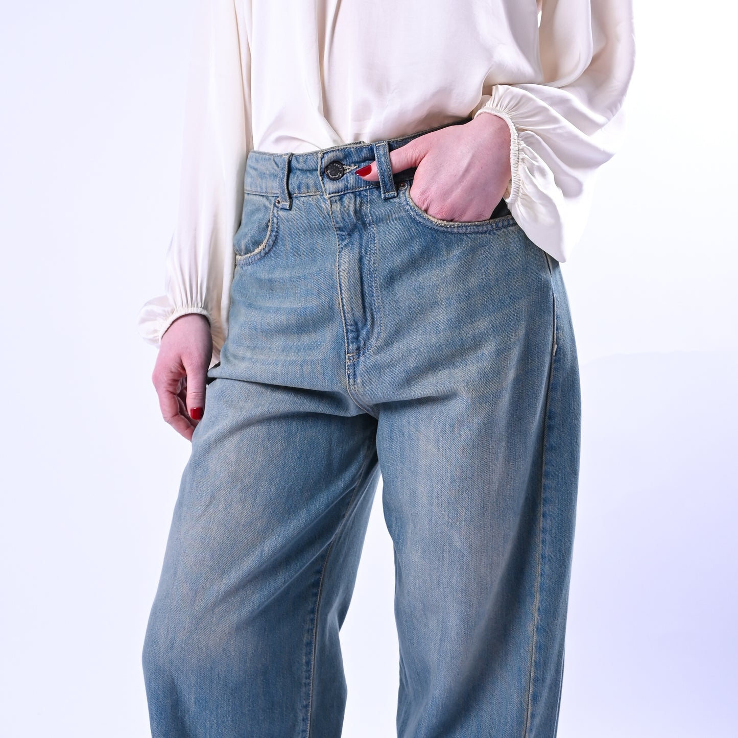 Jeans Angel con taglio balloon che valorizza la silhouette, confezionato in denim fluido di Tencel per massima comodità e traspirabilità. Il lavaggio chiaro al thè dona un finish naturale e sofisticato, ideale per abbinamenti versatili dal giorno alla sera.
