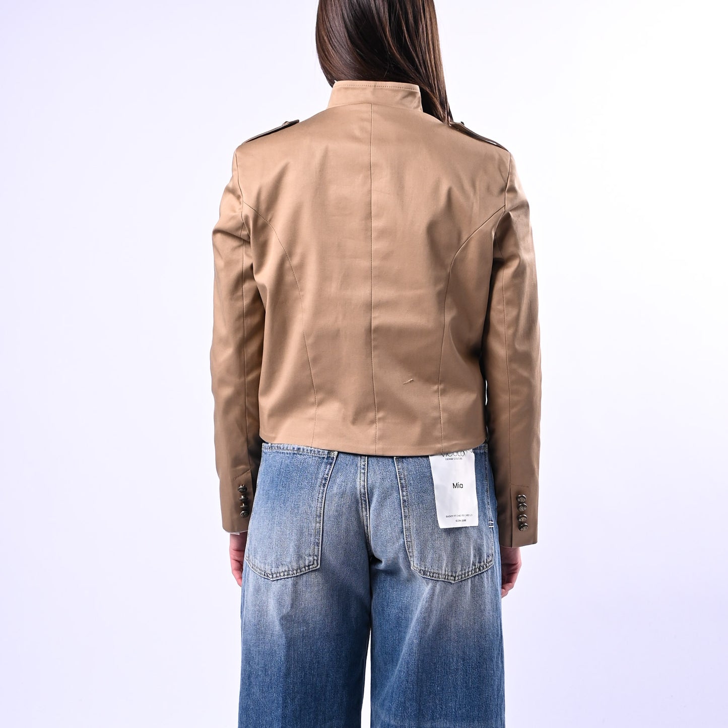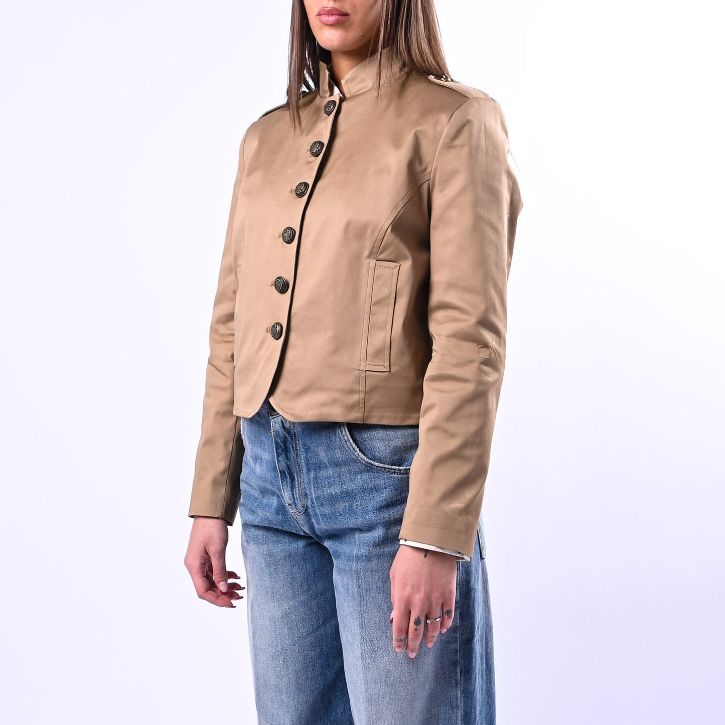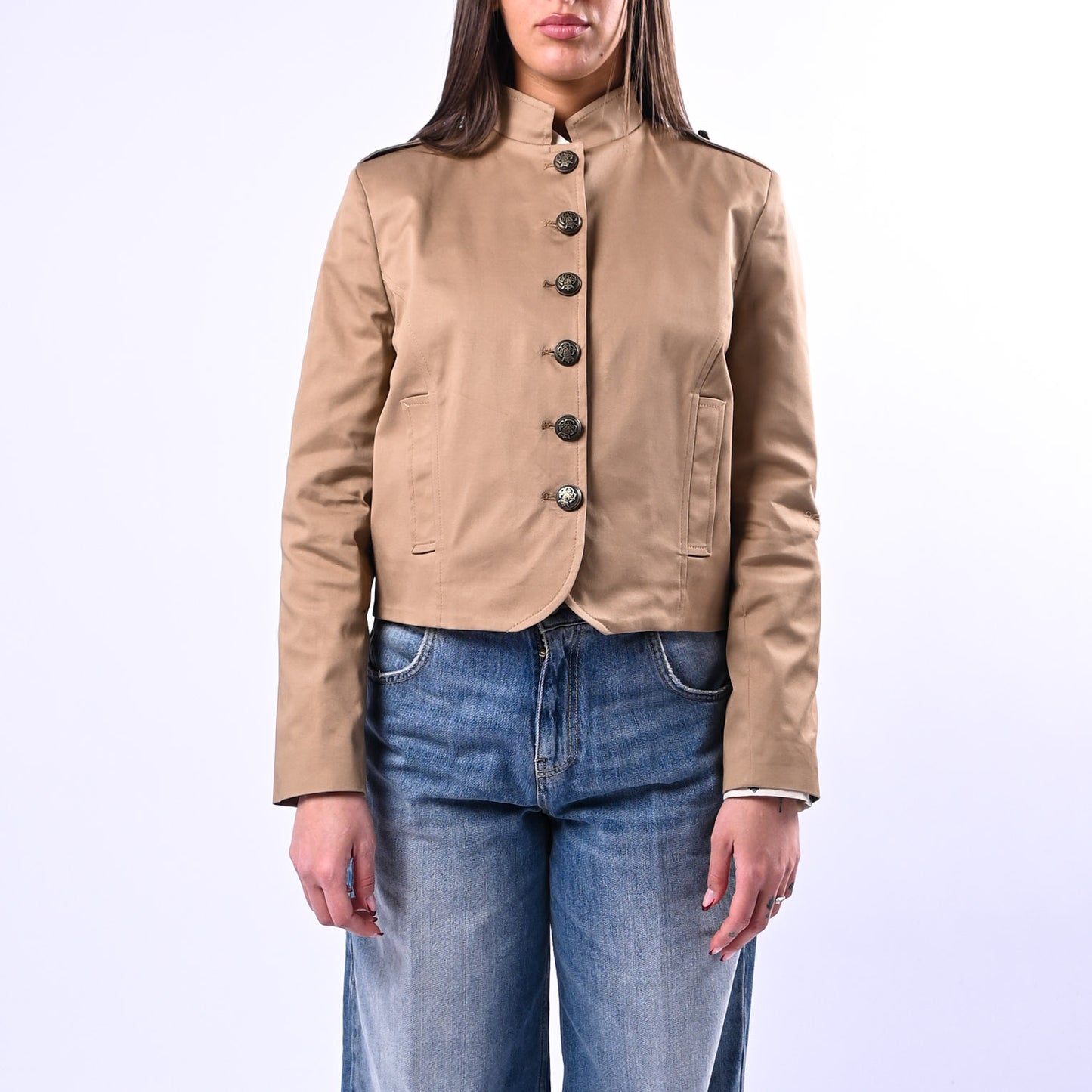 Giacca corta dal taglio coreano con collo rialzato e bottoni in ottone, impreziosita da mostrine sulle spalle che ne esaltano la silhouette. Completa di tasche funzionali e fodera interna, perfetta per uno stile contemporaneo e sofisticato.