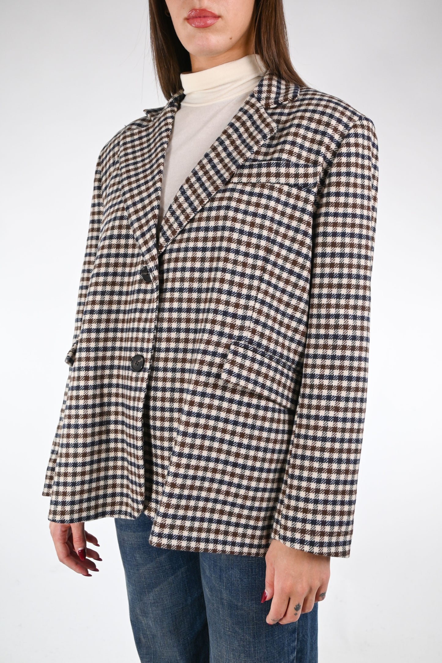 Giacca over a quadretti, foderata, con spacchi dietro, con tasche, colore blu/moro