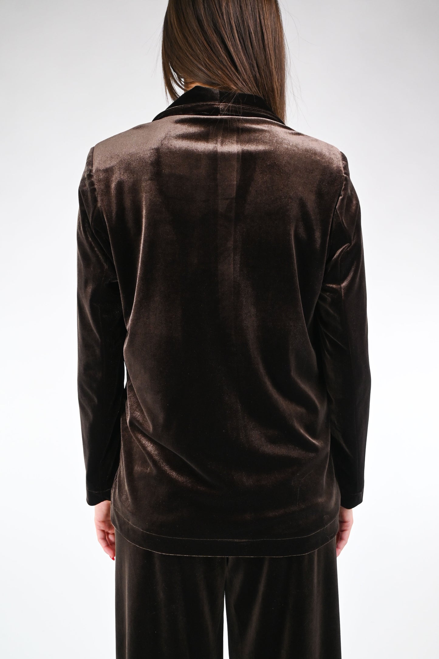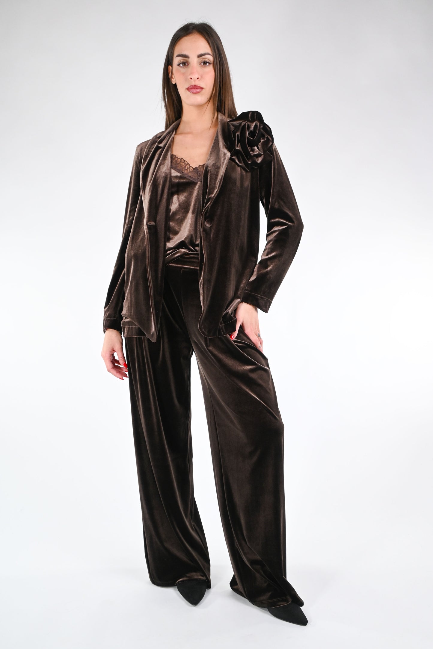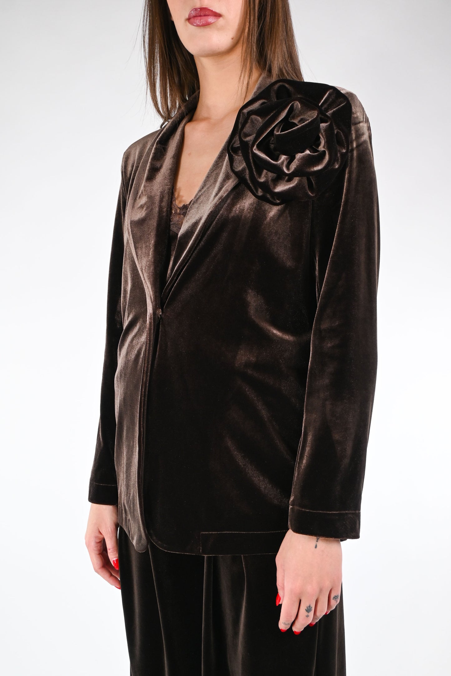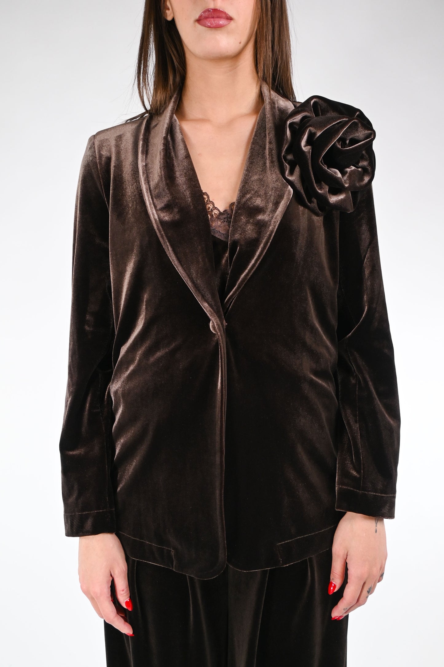 Giacca in velluto liscio ad un bottone con spilla a fiore abbinata, color moro