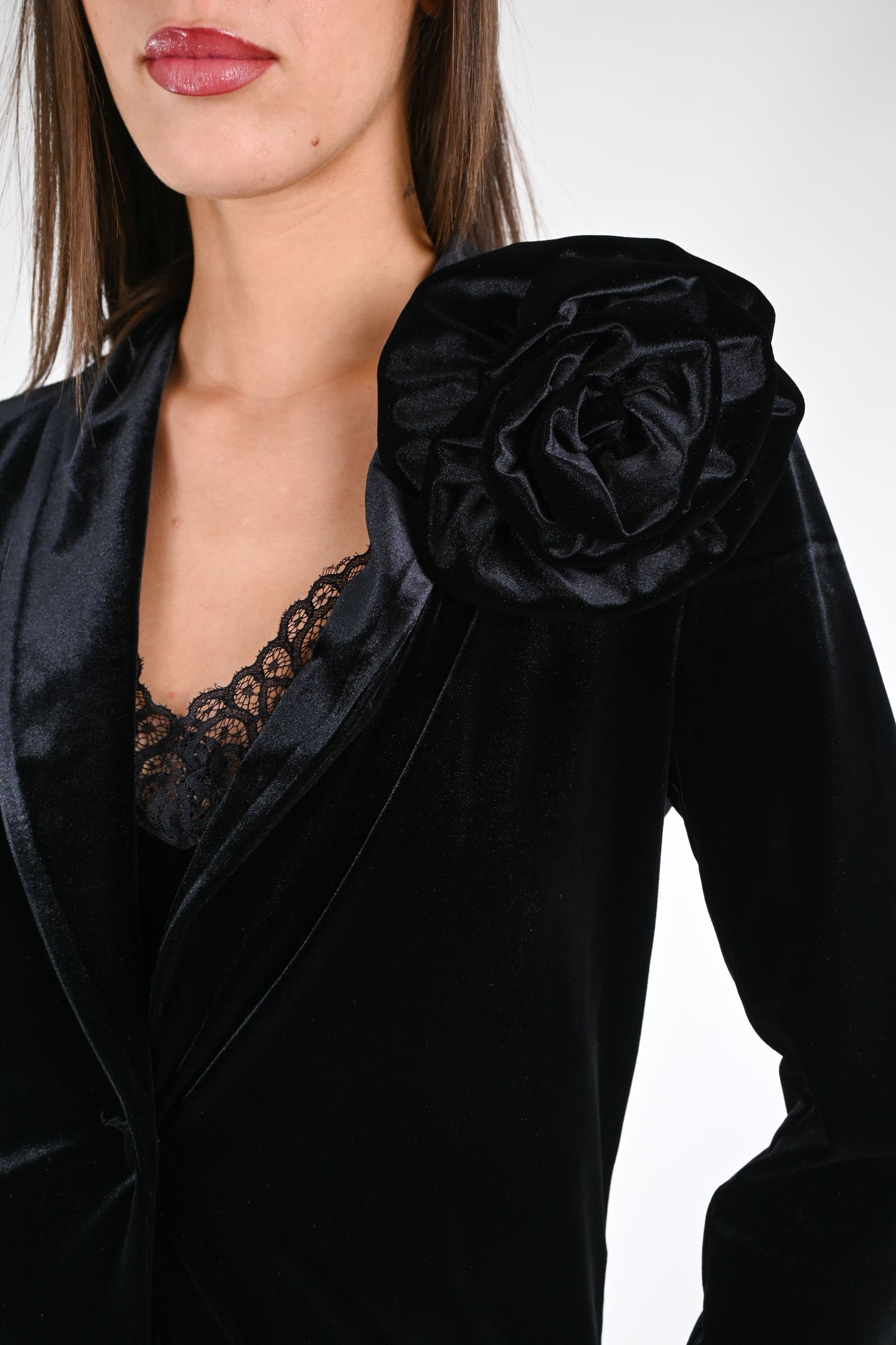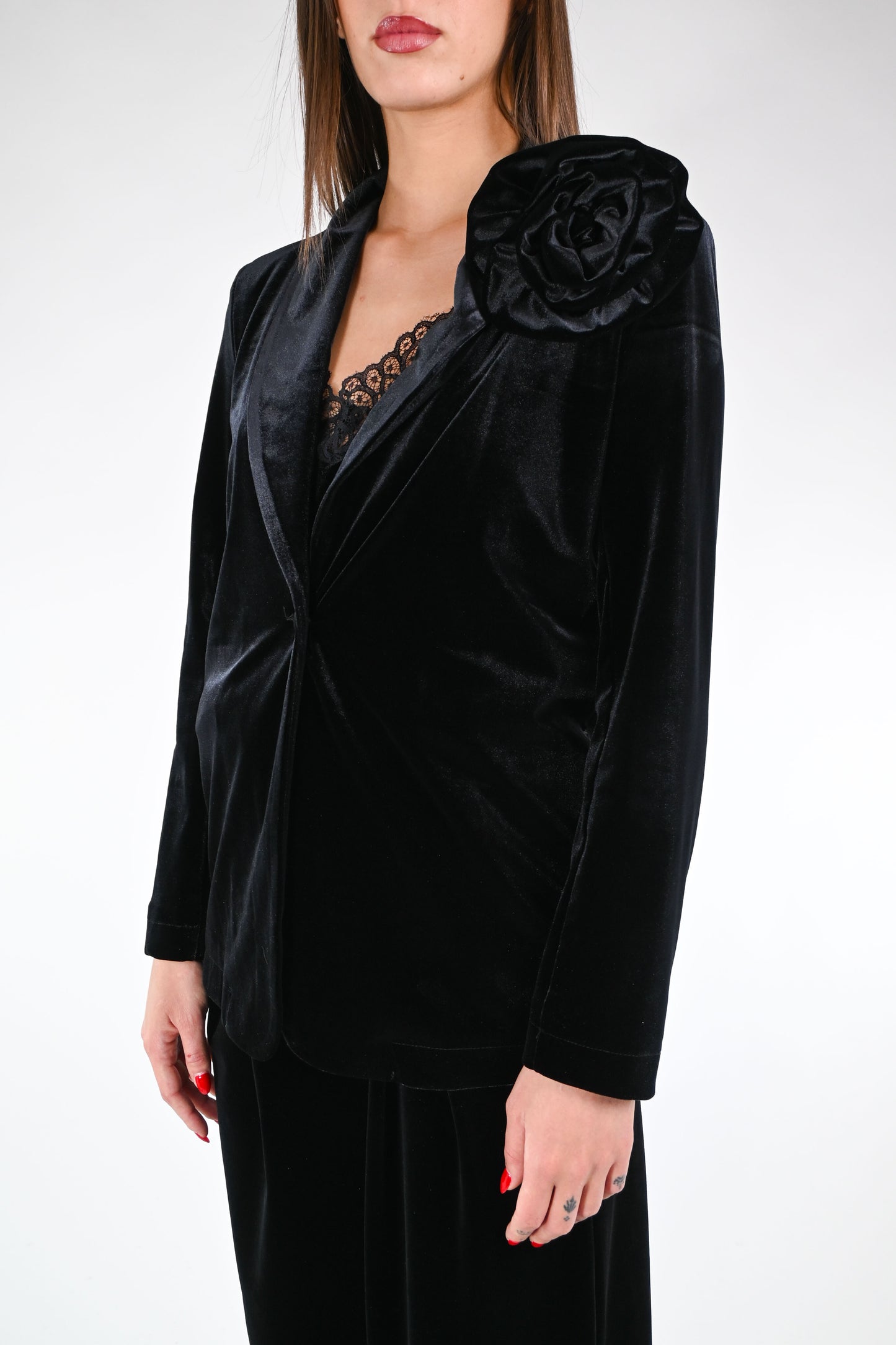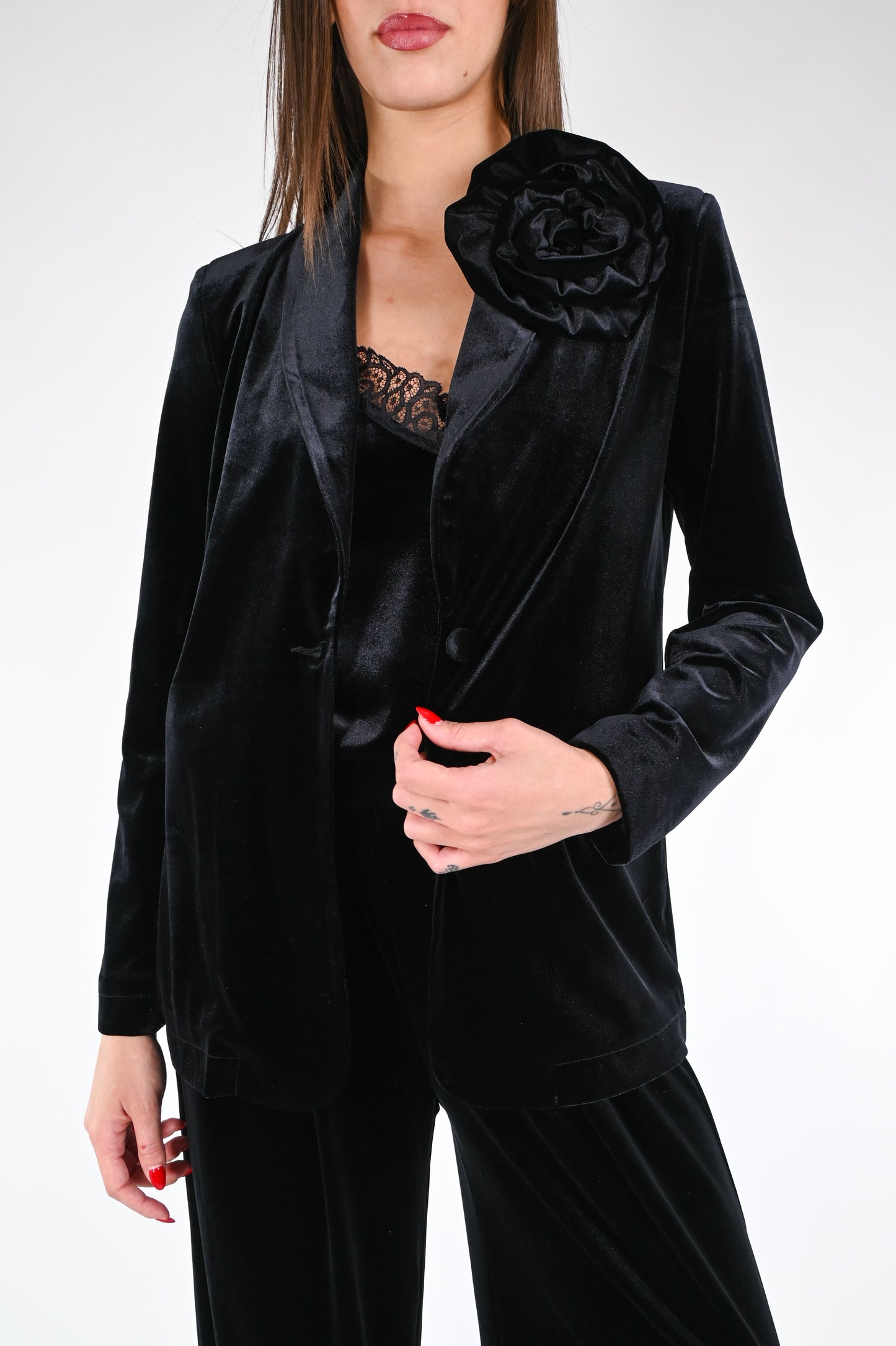 Giacca in velluto liscio ad un bottone con spilla a fiore abbinata, color nero