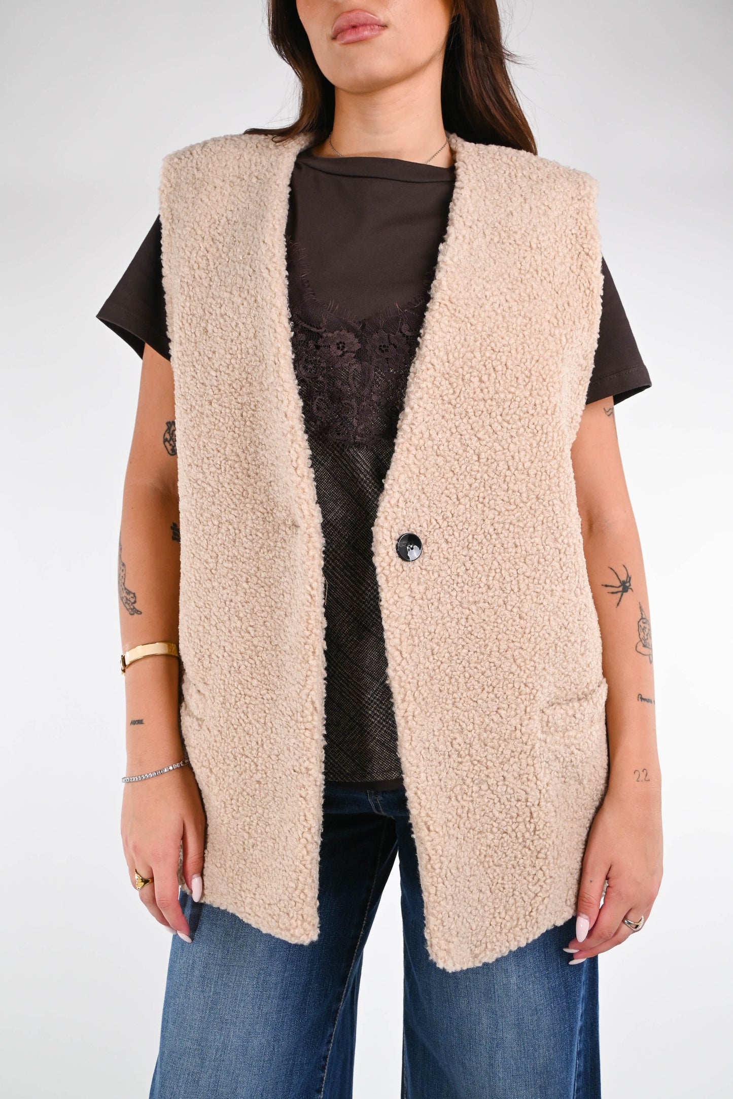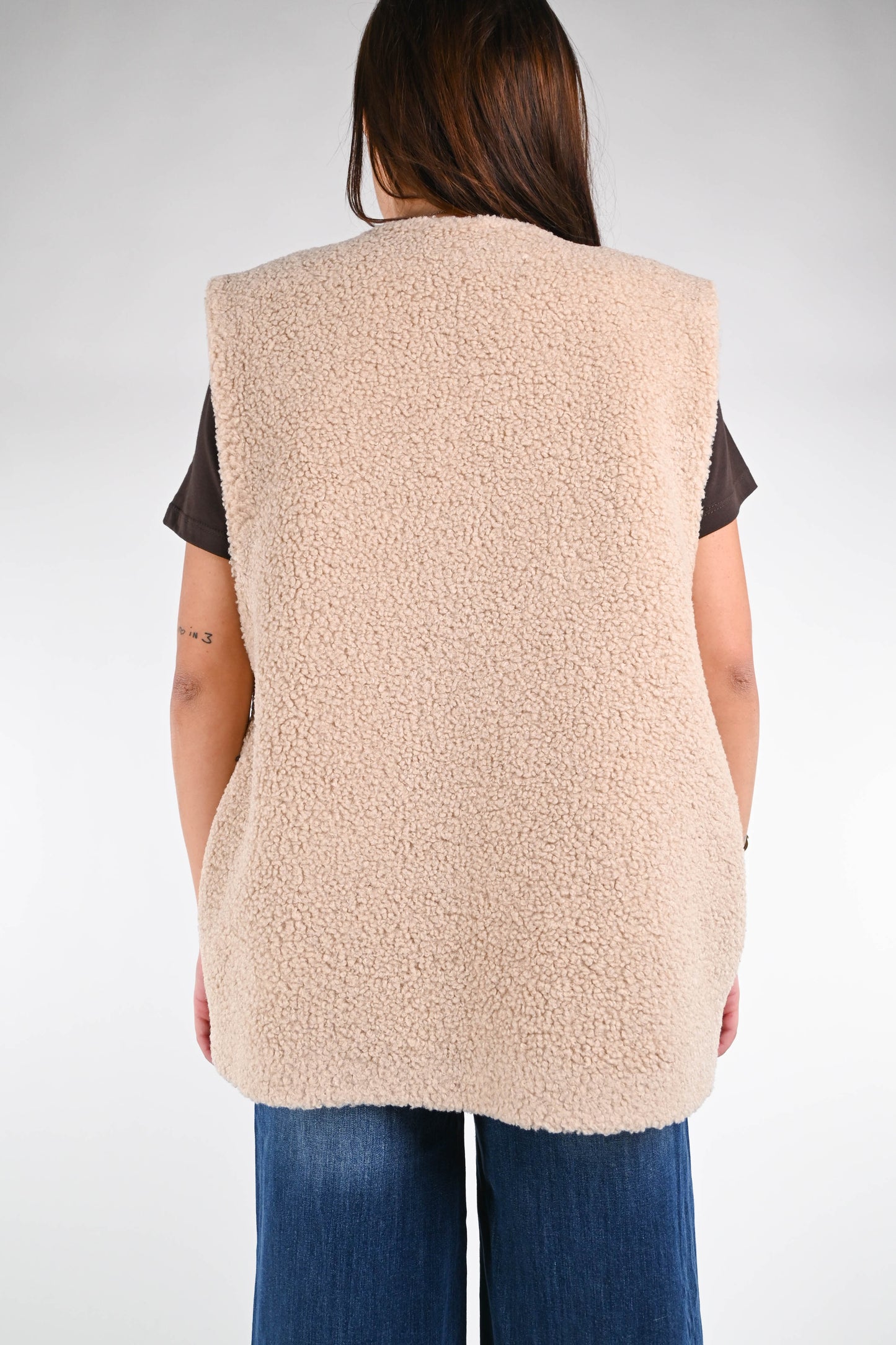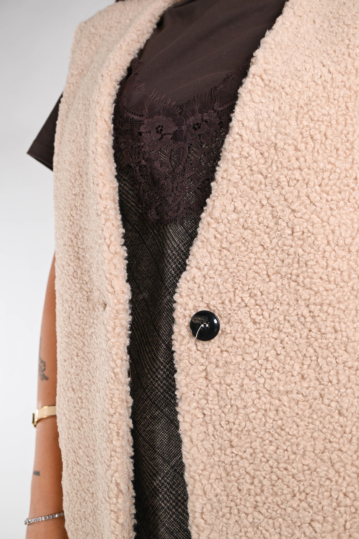Gilet teddy over, un bottone, con fodera interna, con tasche, colore Cammello