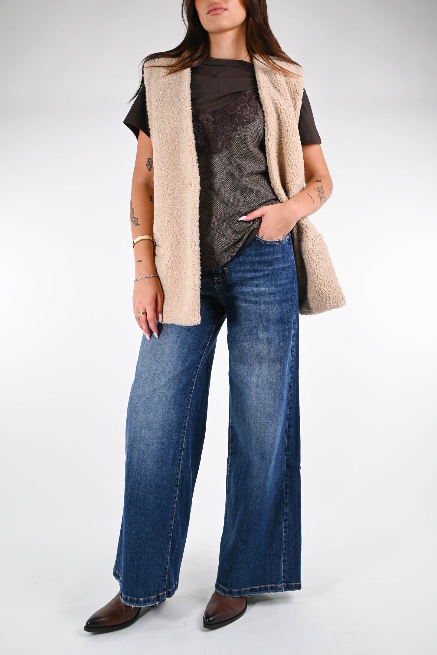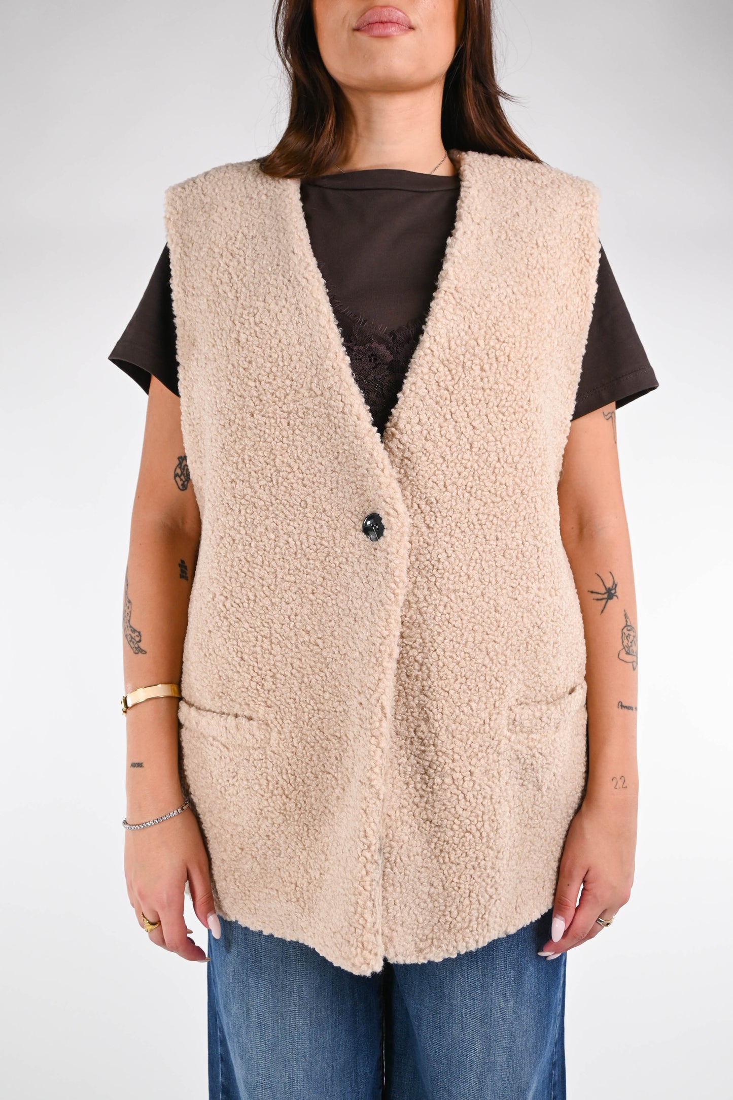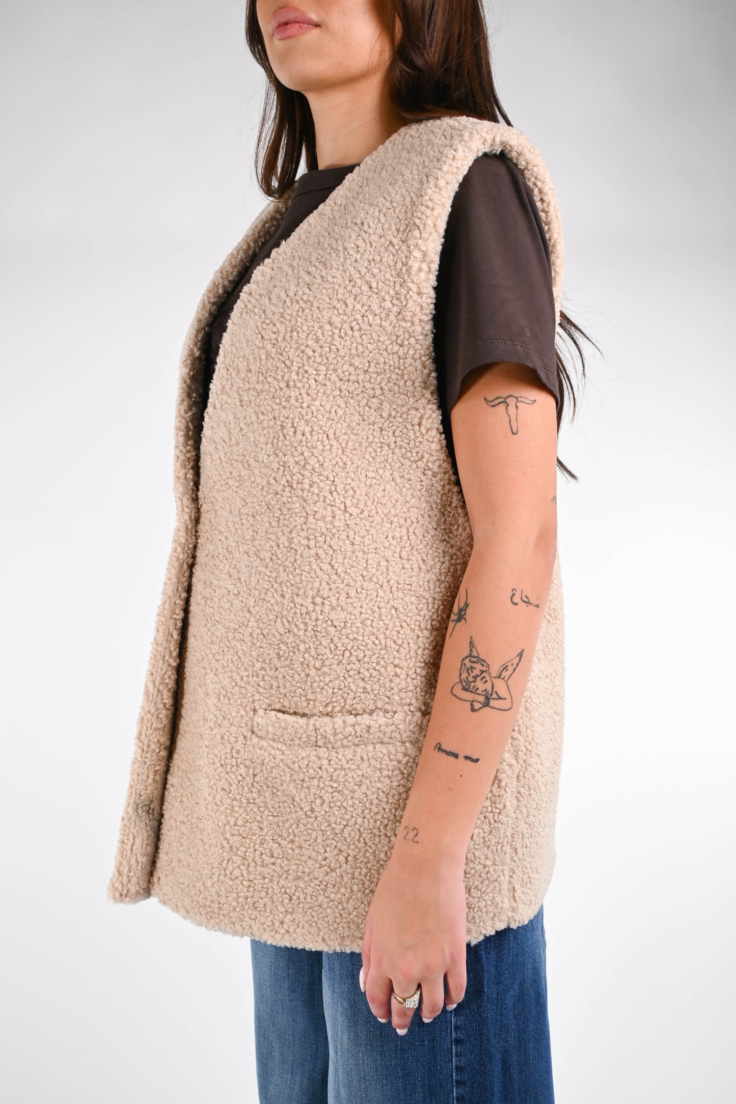 Gilet teddy over, un bottone, con fodera interna, con tasche, colore Cammello