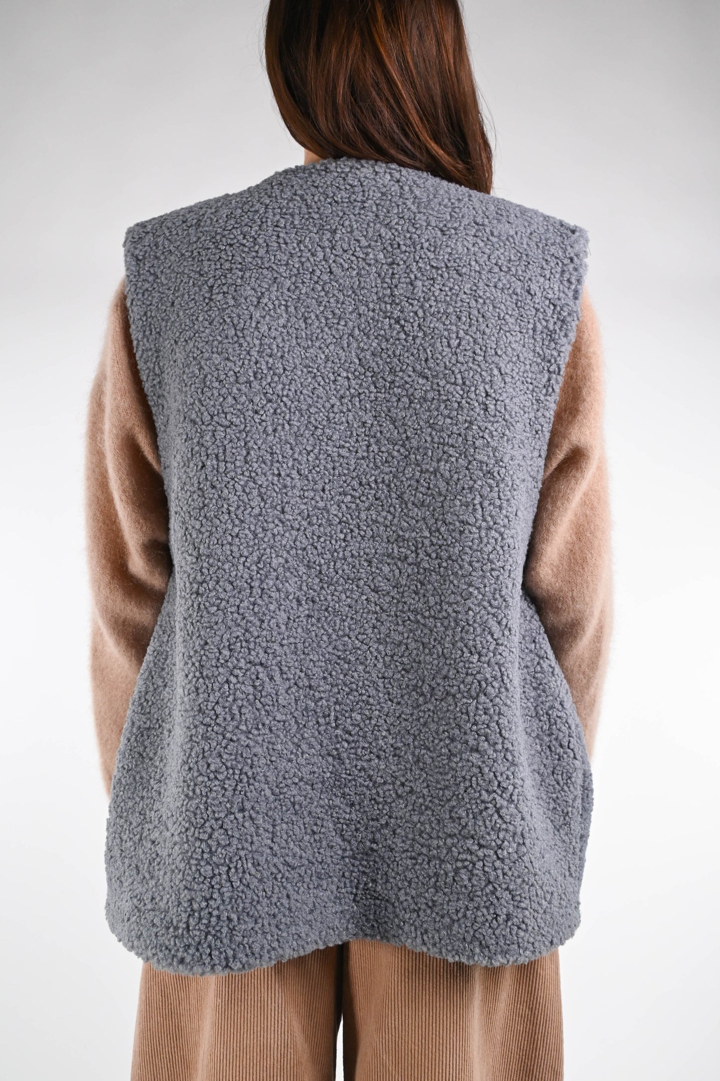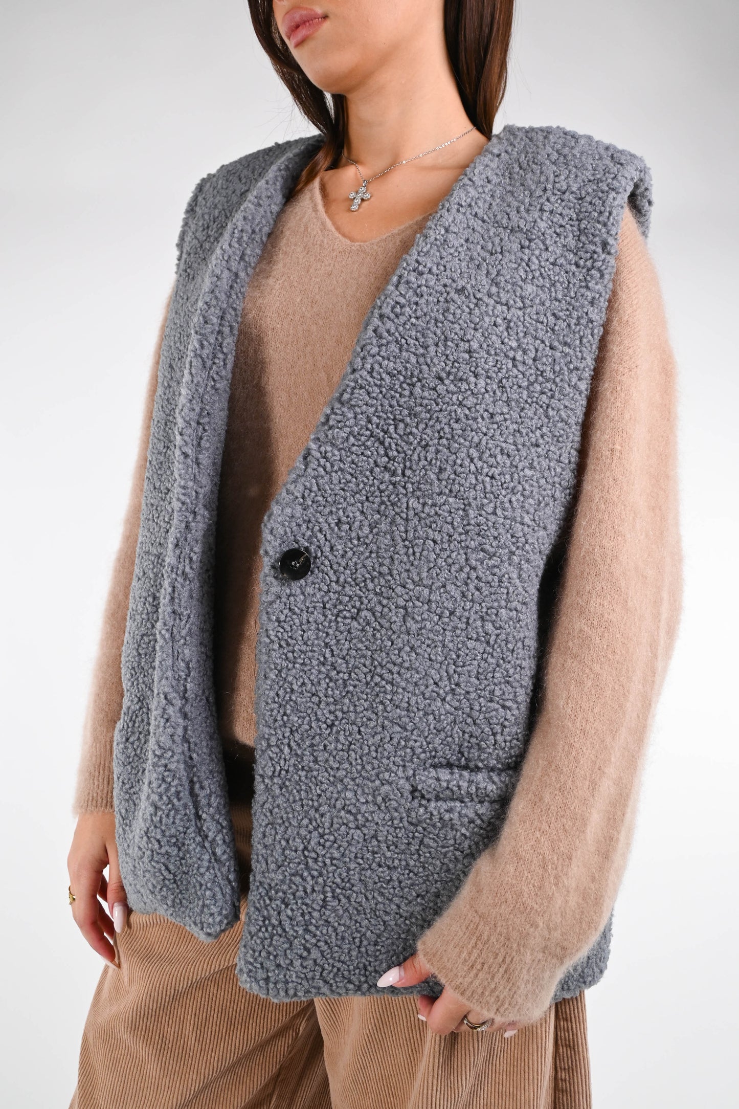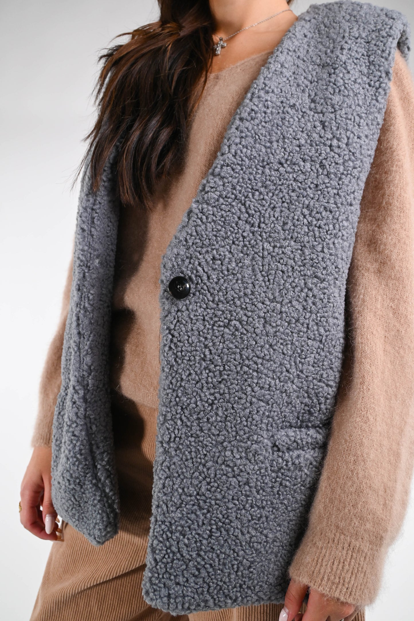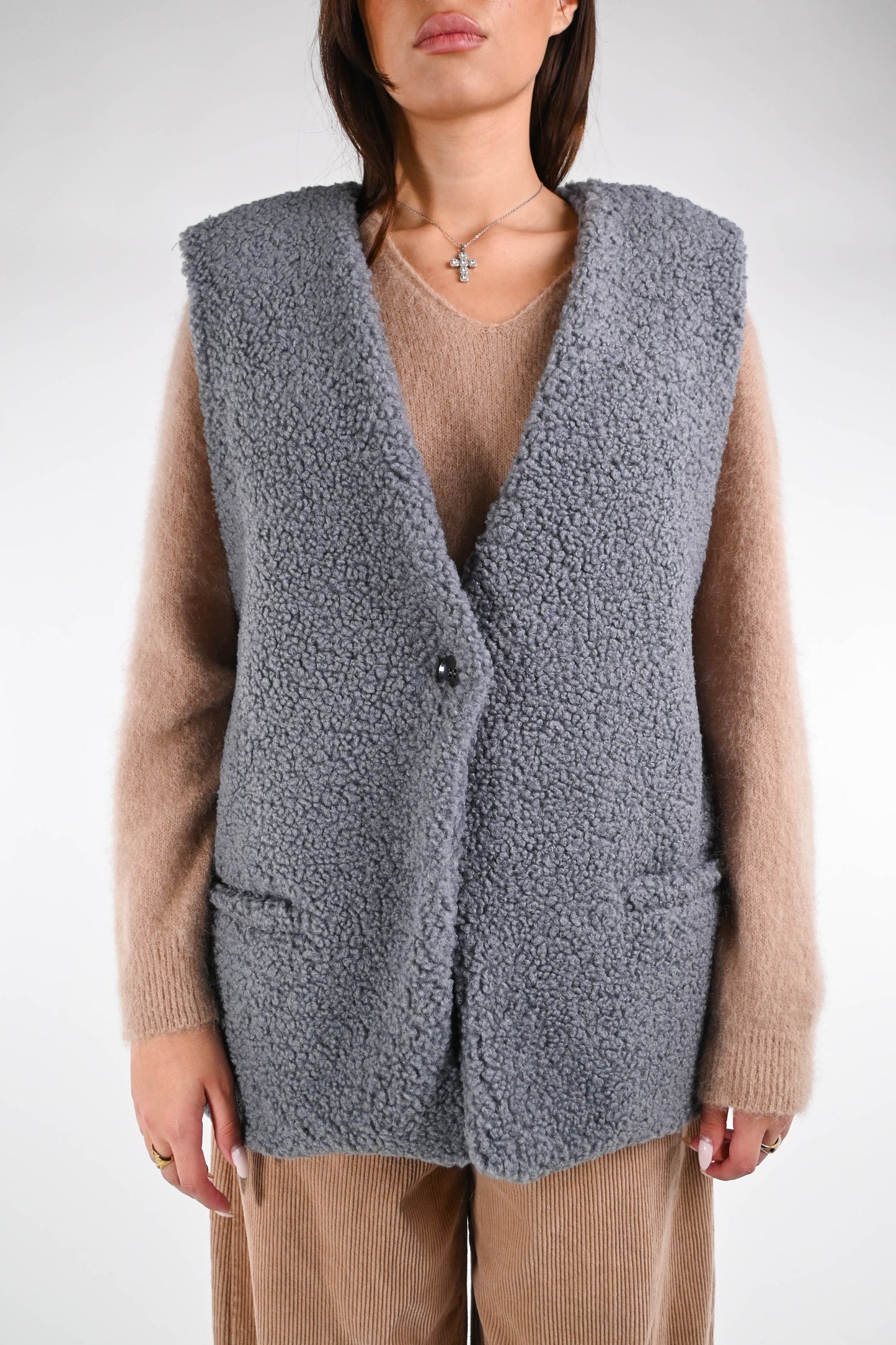 Gilet teddy over, un bottone, con fodera interna, con tasche, colore Grigio