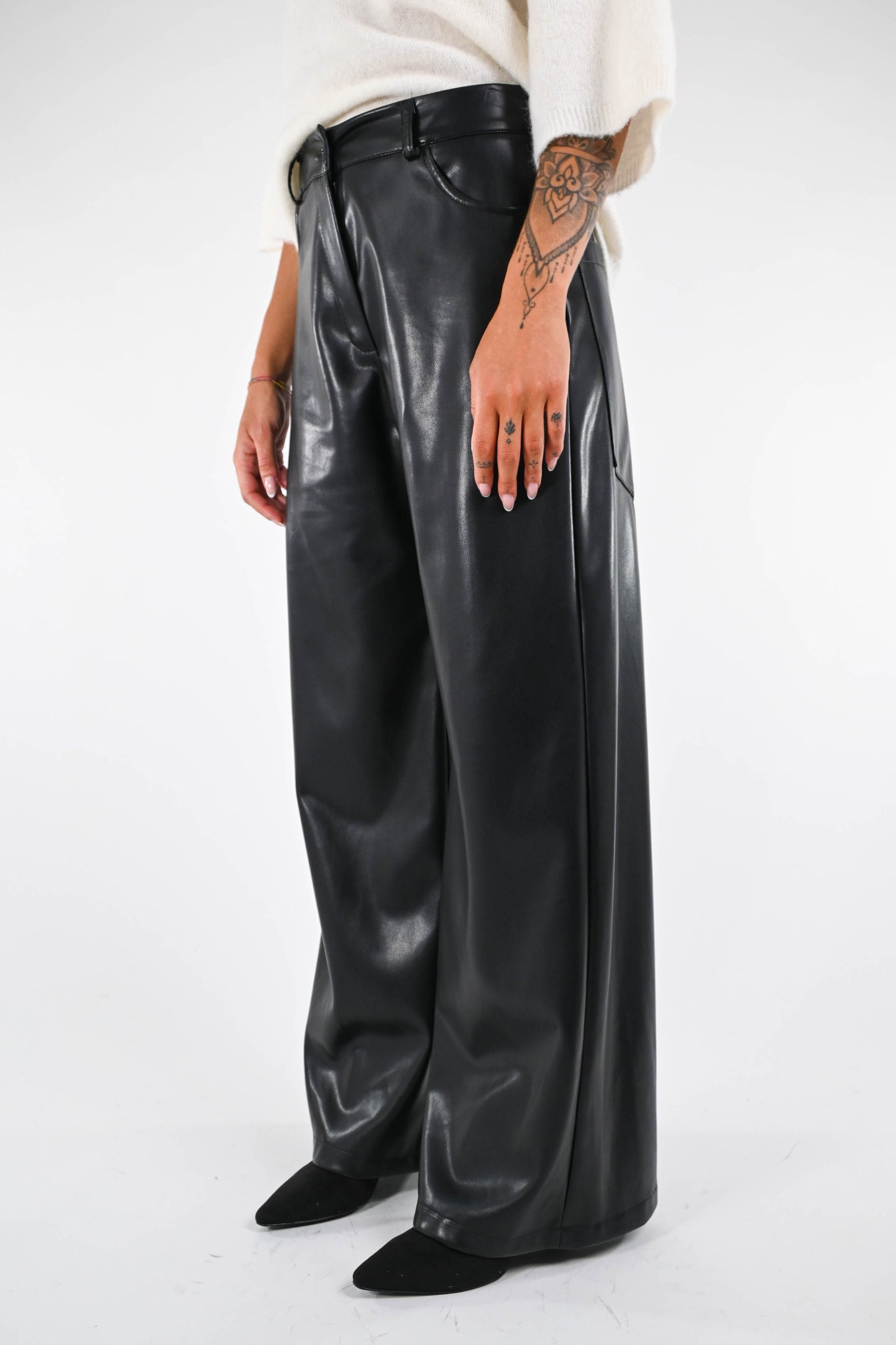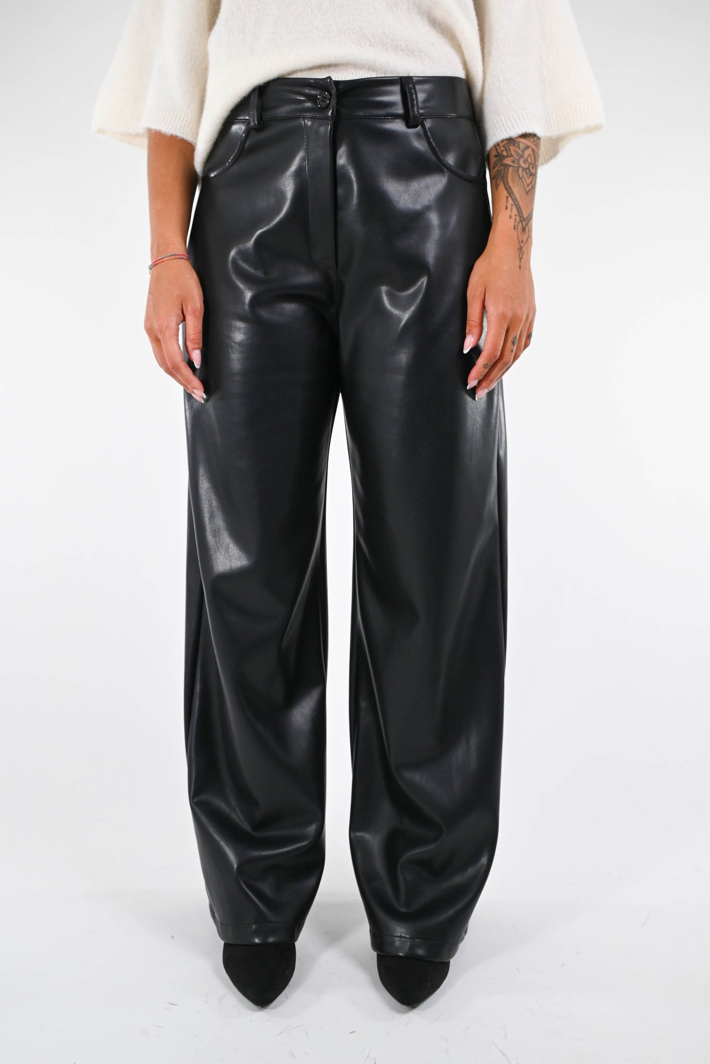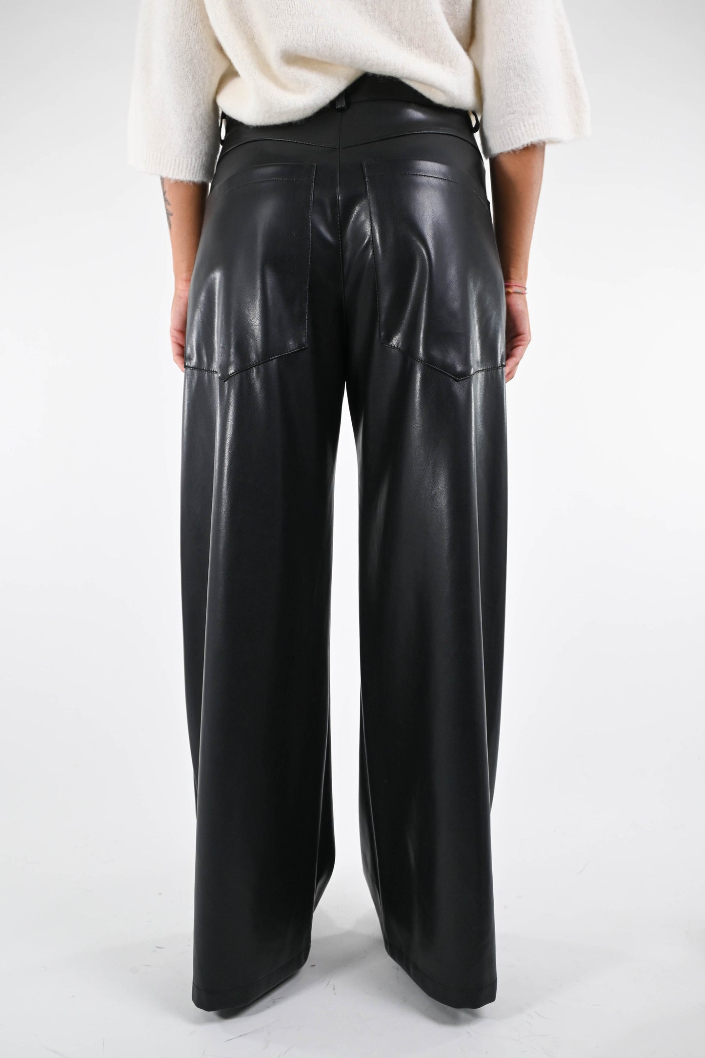 Pantalone palazzo in morbida ecopelle, con tasconi dietro, 4 tasche, colore Nero.