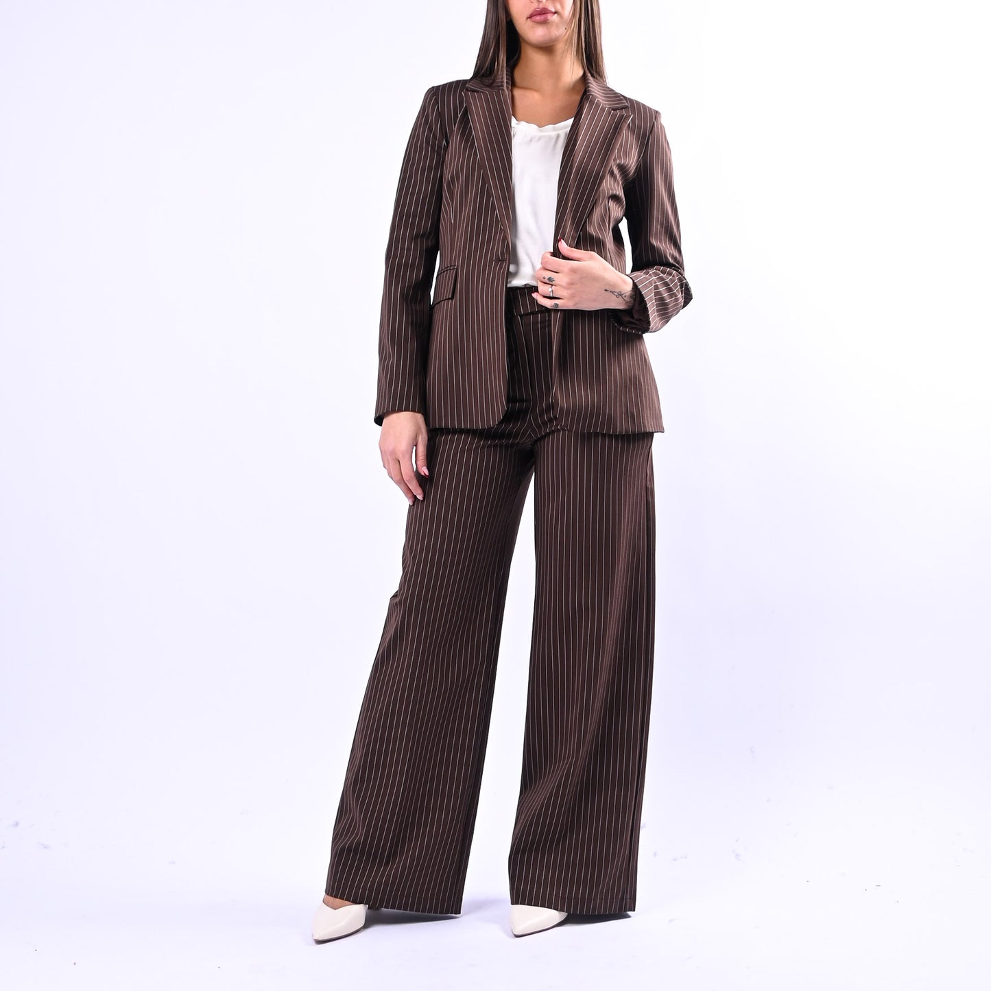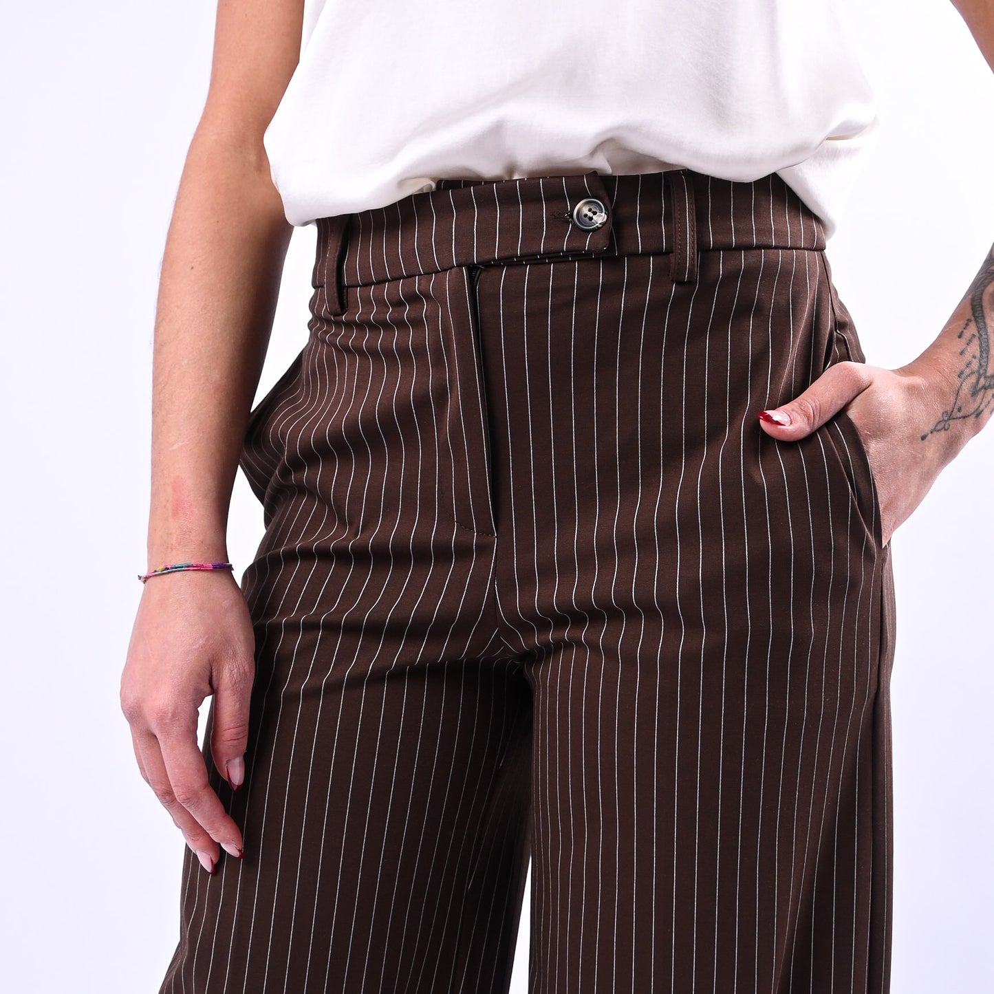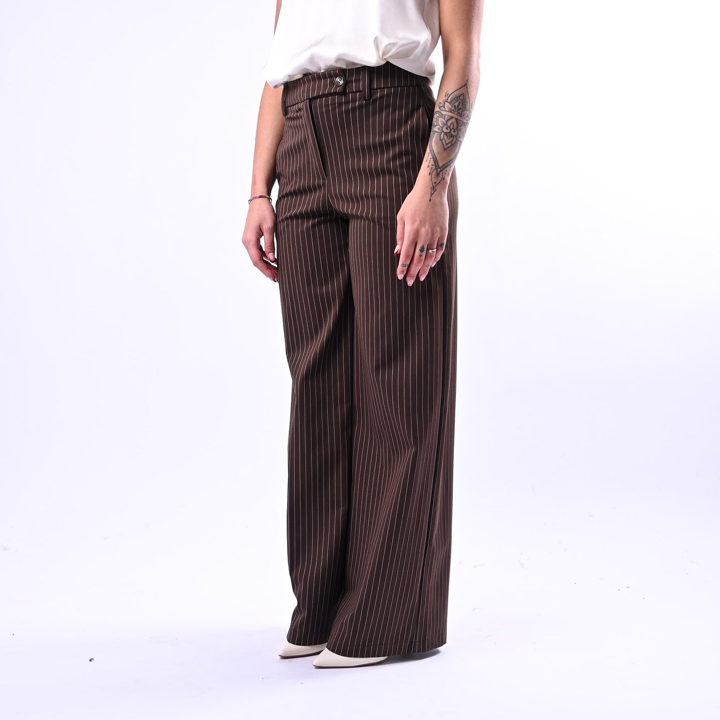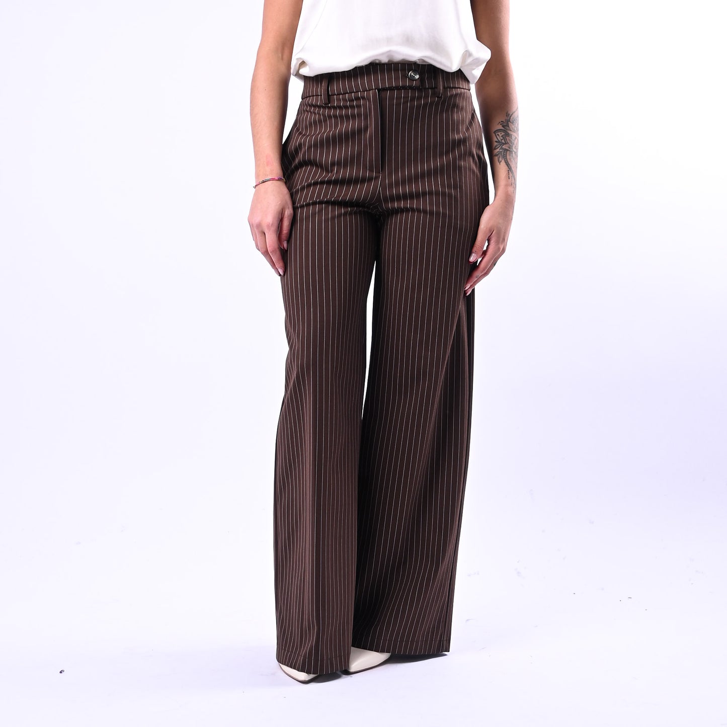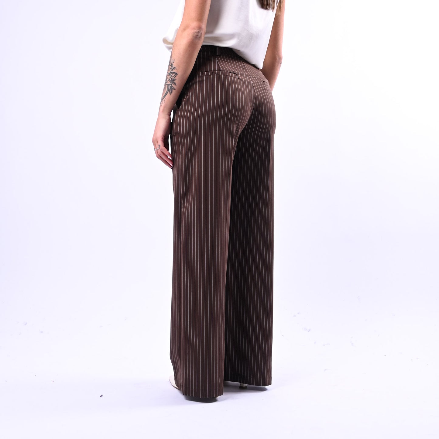 Pantalone palazzo in punto Milano con elegante motivo gessato e tasche a filo, perfetto per uno stile sofisticato e versatile. Abbinalo alla maglia coordinata della collezione TENSIONE IN per un look coordinato e raffinato.