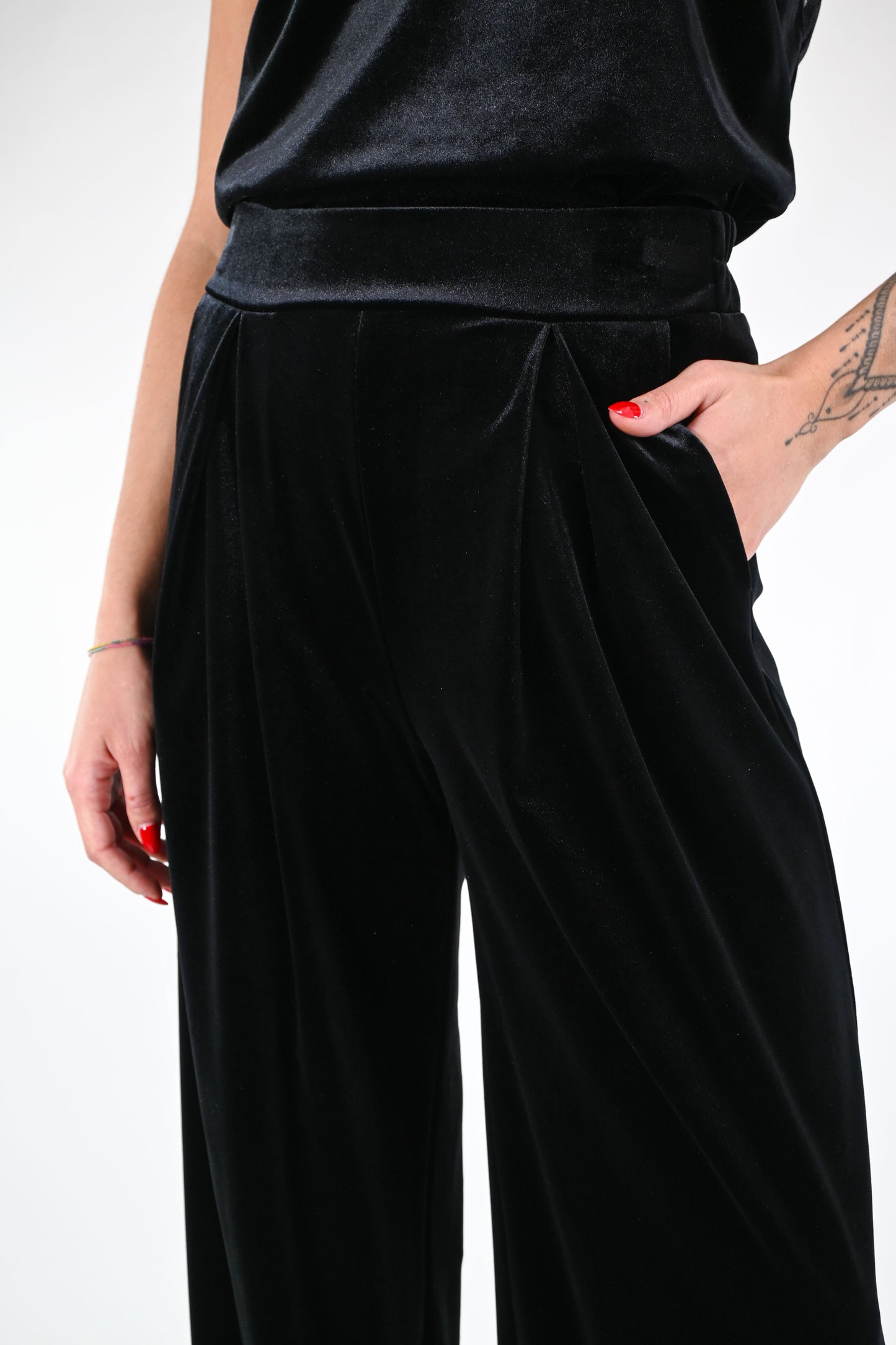 Pantalone palazzo in velluto liscio, con mezzo elastico in vita, con tasche, con pinces, color nero