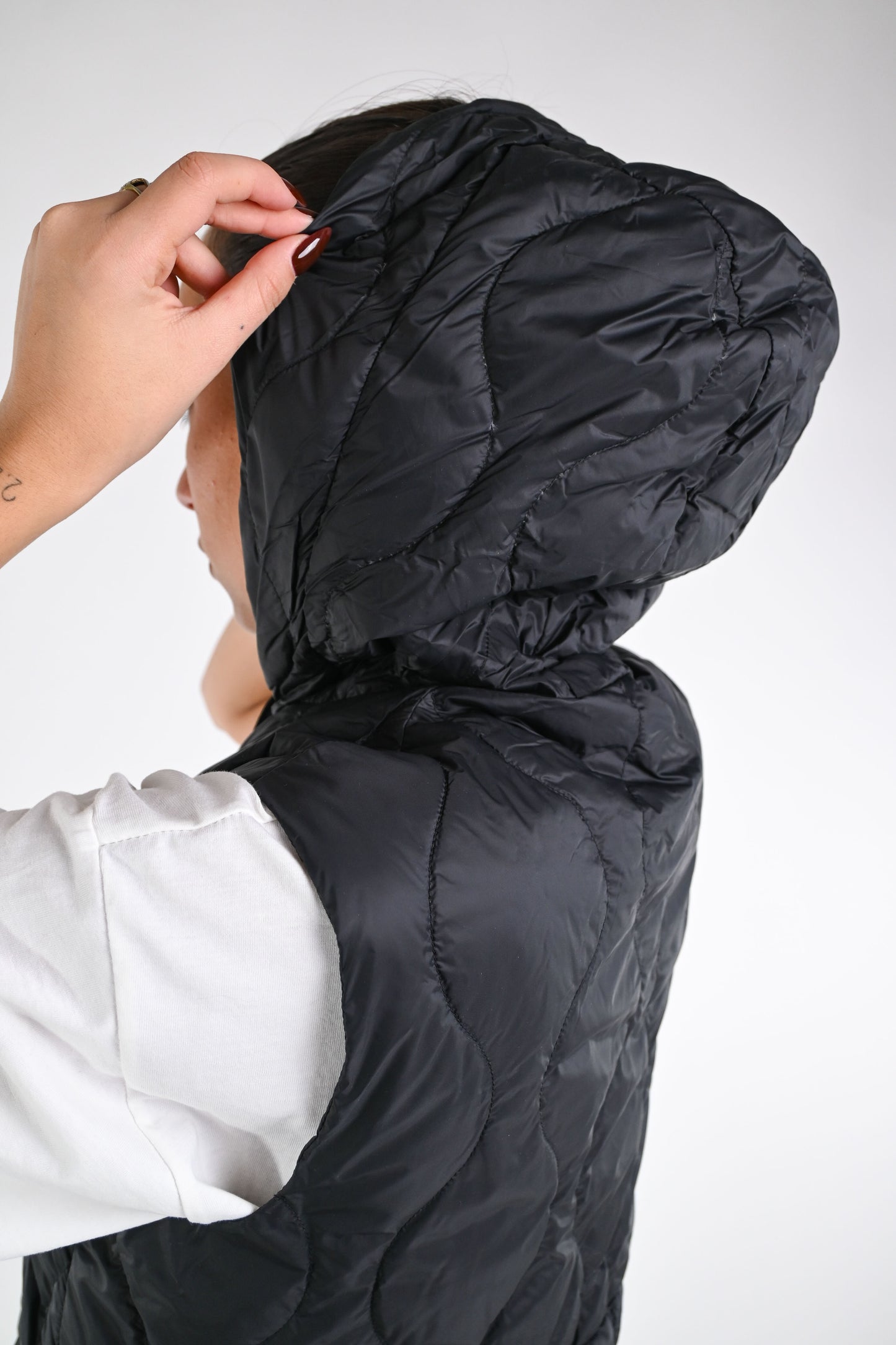 Gilet 100 grammi in piuma d'oca ultra light, con cappuccio, con bottoni a clip, con tasche