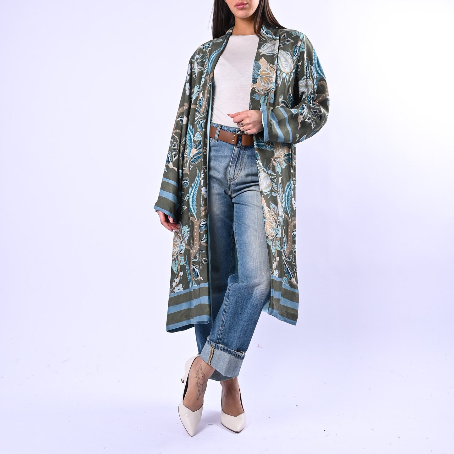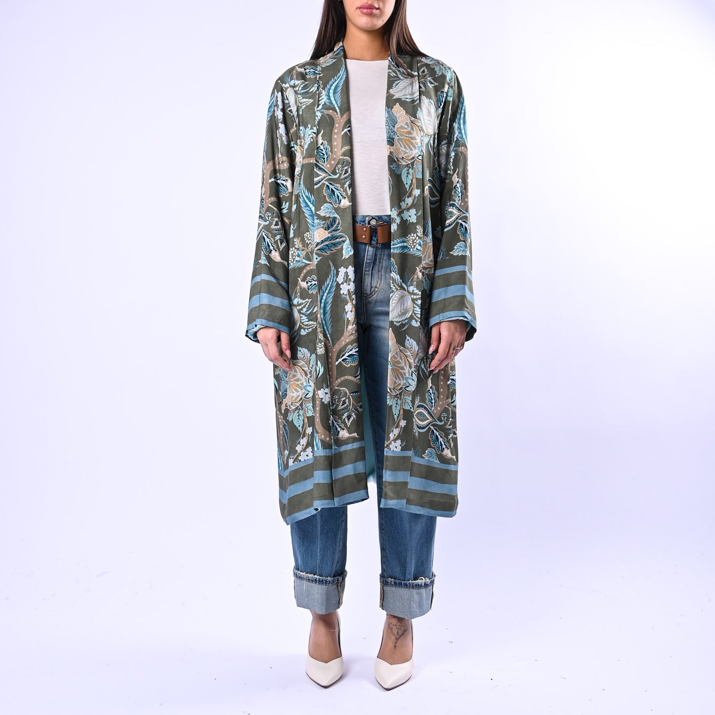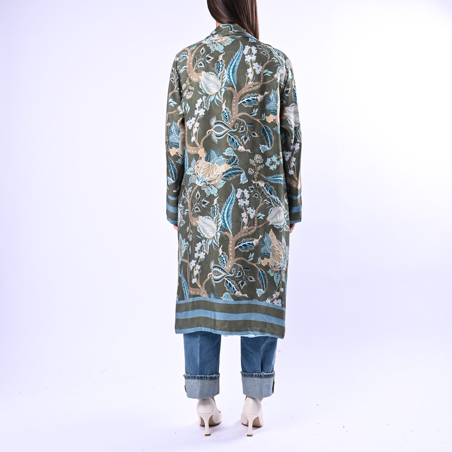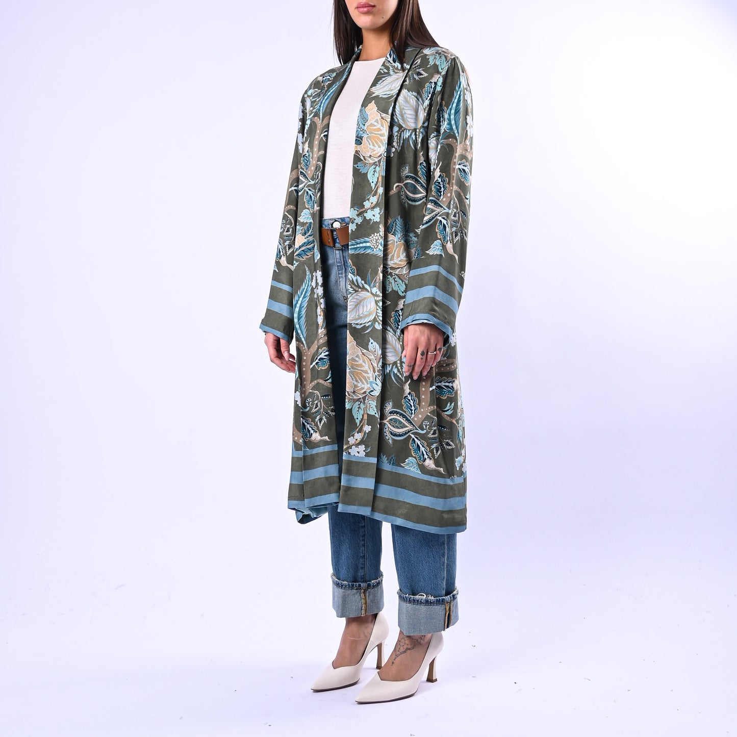 Kimono di lunghezza media con motivi floreali e geometrici che si alternano in armonia. Fodera in contrasto, tasche pratiche a filo per uno stile contemporaneo e raffinato.